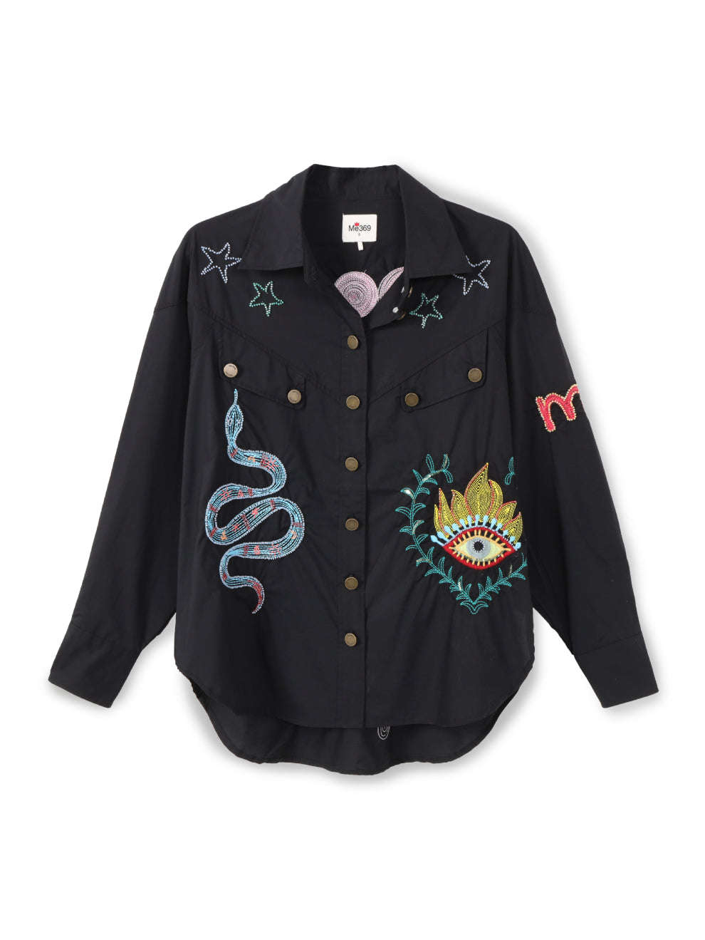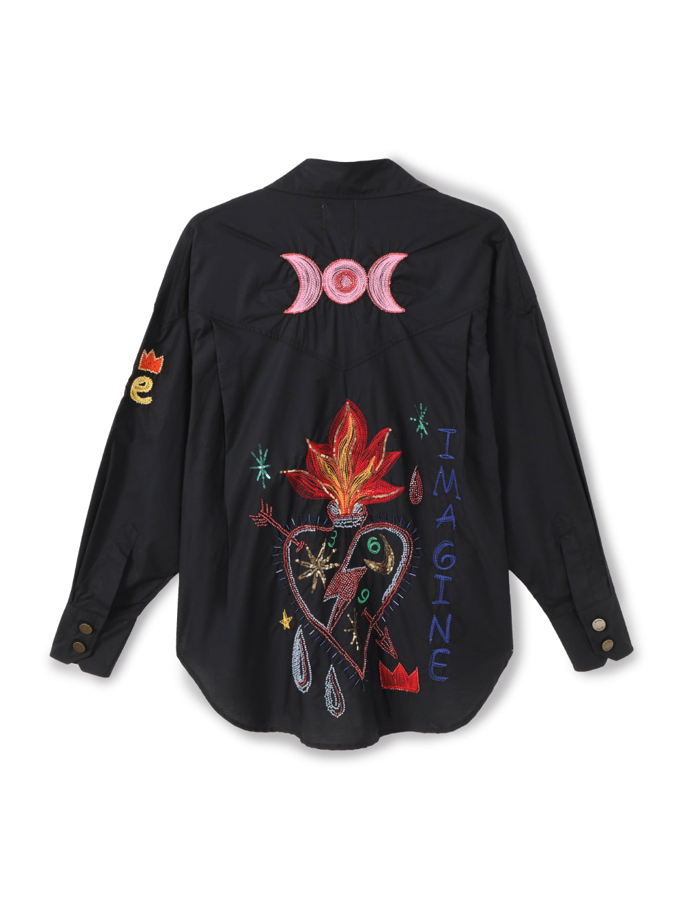 חולצה רקומה מכופתרת עם שרוולים ארוכים, צווארון ושני חפתים עם כפתורים. פאנל קדמי, שני כיסים עם כפתורים. החולצה רקומה מקדימה ומאחור עם מגוון גרפיים כולל נחש, כוכבים ועין בוערת. בגב החולצה מופיעה המילה "IMAGINE" בצורה אנכית. זמינה בשחור, דנים ולבן. מידות: S-XL. שלבי עם מכנסי הדנים שלנו למראה שלם ואמנותי.