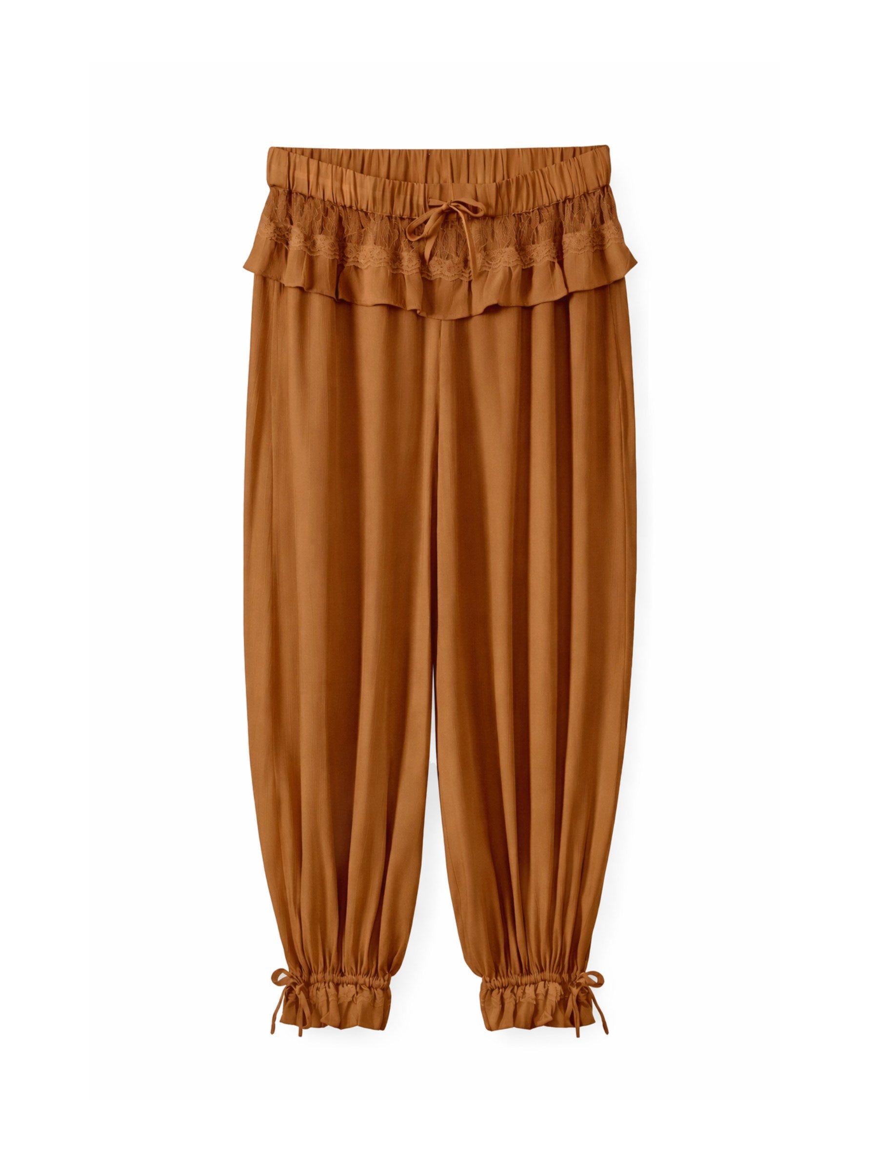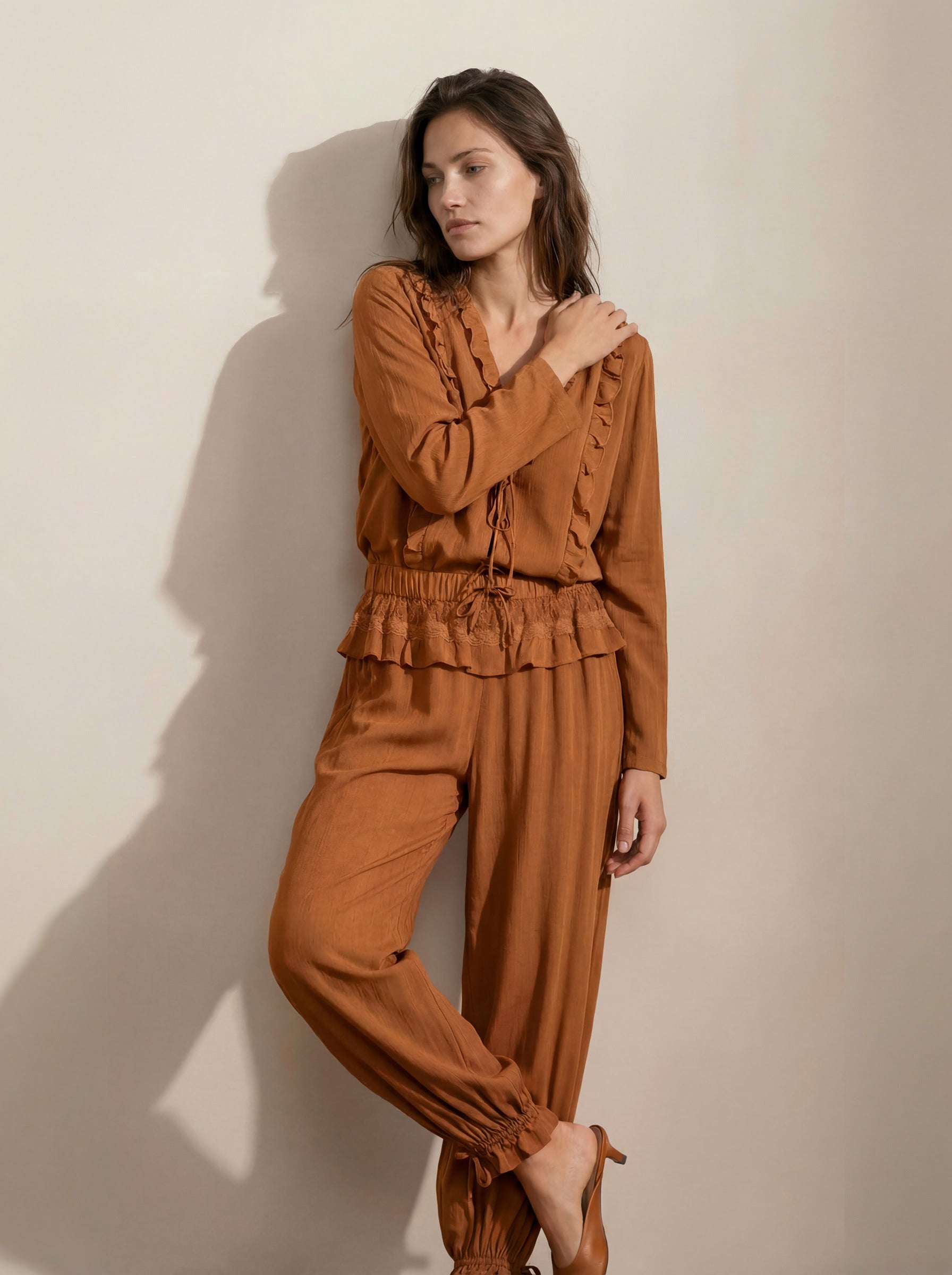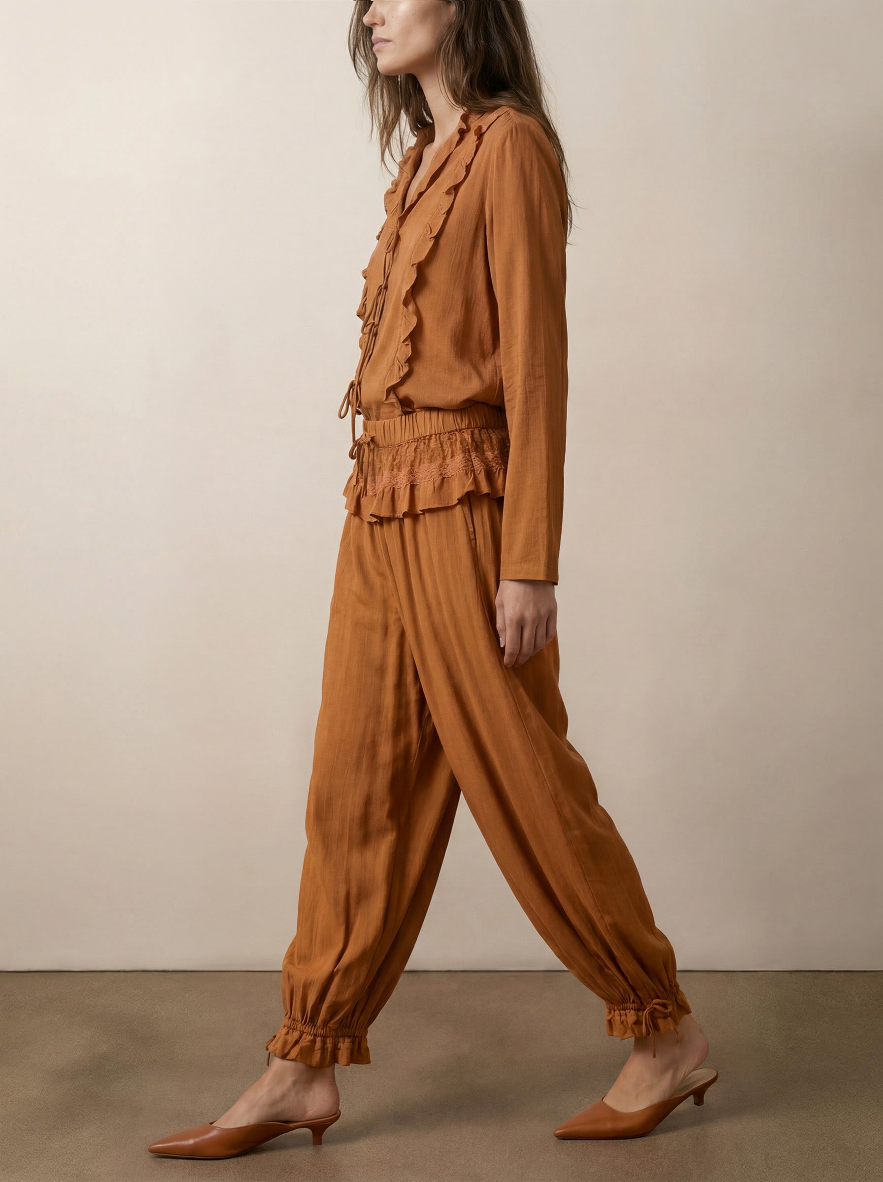 מכנסי ג’ורג’ט בסגנון אלאדין עם נוכחות בוהו נשית. מותן אלסטית עם שרוך מתכוונן, קרסוליים מכווצים ותנועה רכה יוצרים גזרה מחמיאה ונוחה. פרטי תחרה וקפלונים עדינים מוסיפים מראה רך ומעודן, מבלי לפגוע בנוחות. מושלמים ליום יום, חופשות או לוק משודרג עם טופ תואם. זמינים בנטורל, טרקוטה ושחור.