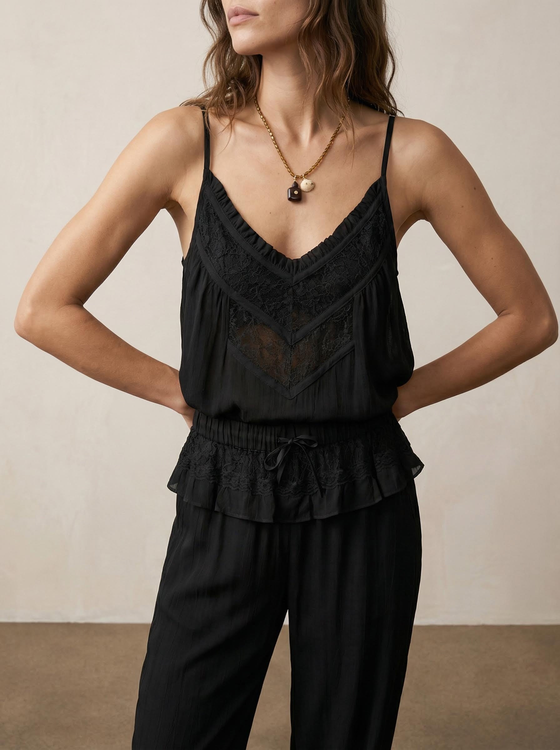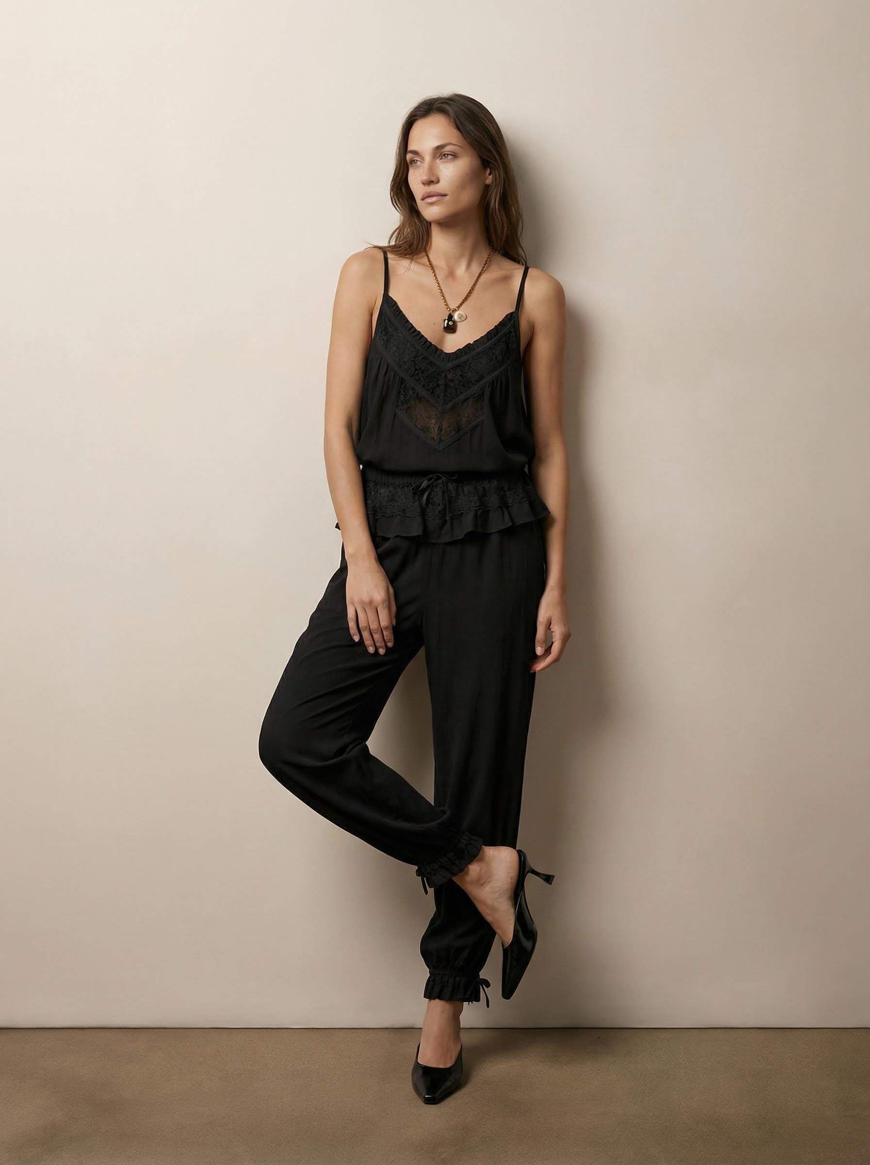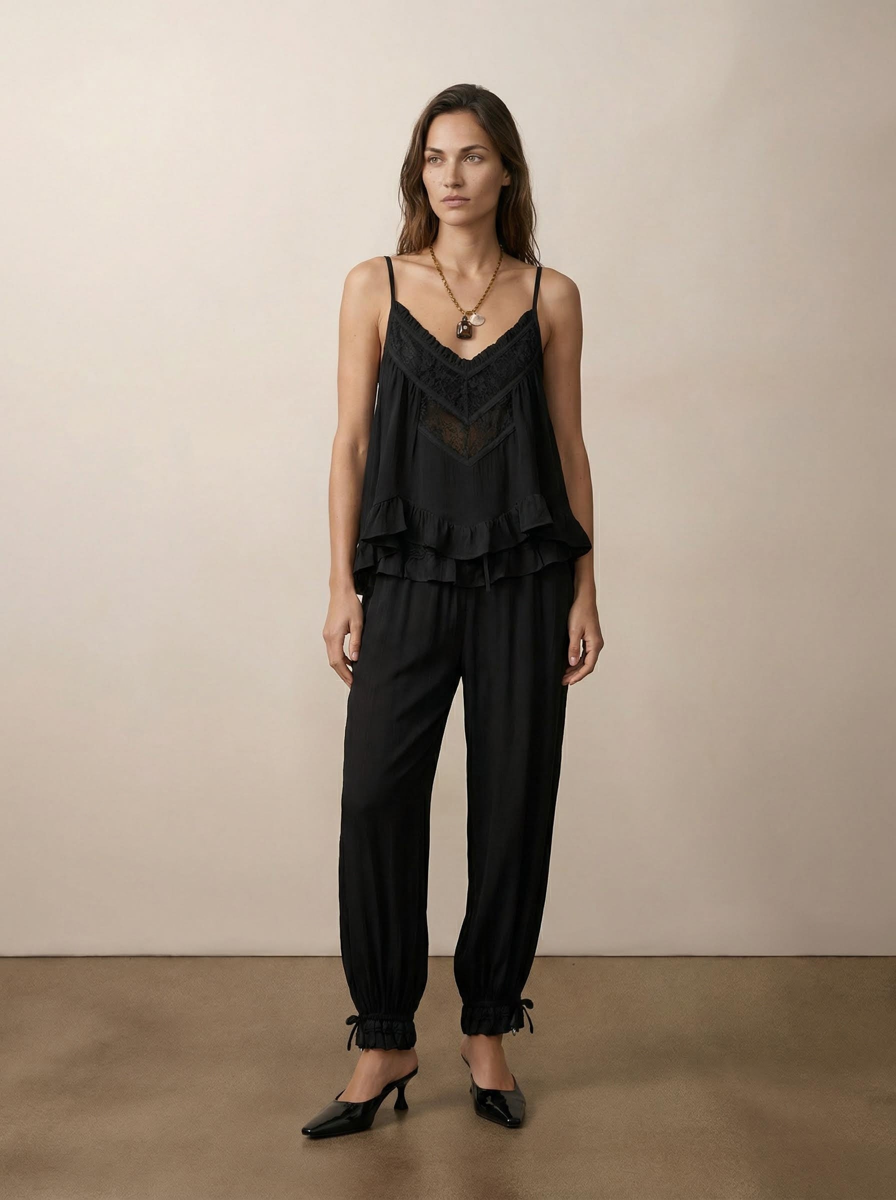 מכנסי ג’ורג’ט בסגנון אלאדין עם נוכחות בוהו נשית. מותן אלסטית עם שרוך מתכוונן, קרסוליים מכווצים ותנועה רכה יוצרים גזרה מחמיאה ונוחה. פרטי תחרה וקפלונים עדינים מוסיפים מראה רך ומעודן, מבלי לפגוע בנוחות. מושלמים ליום יום, חופשות או לוק משודרג עם טופ תואם. זמינים בנטורל, טרקוטה ושחור.
