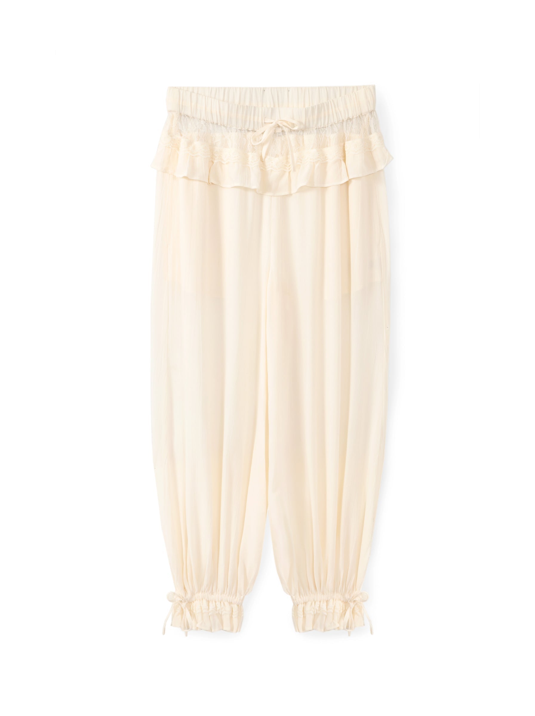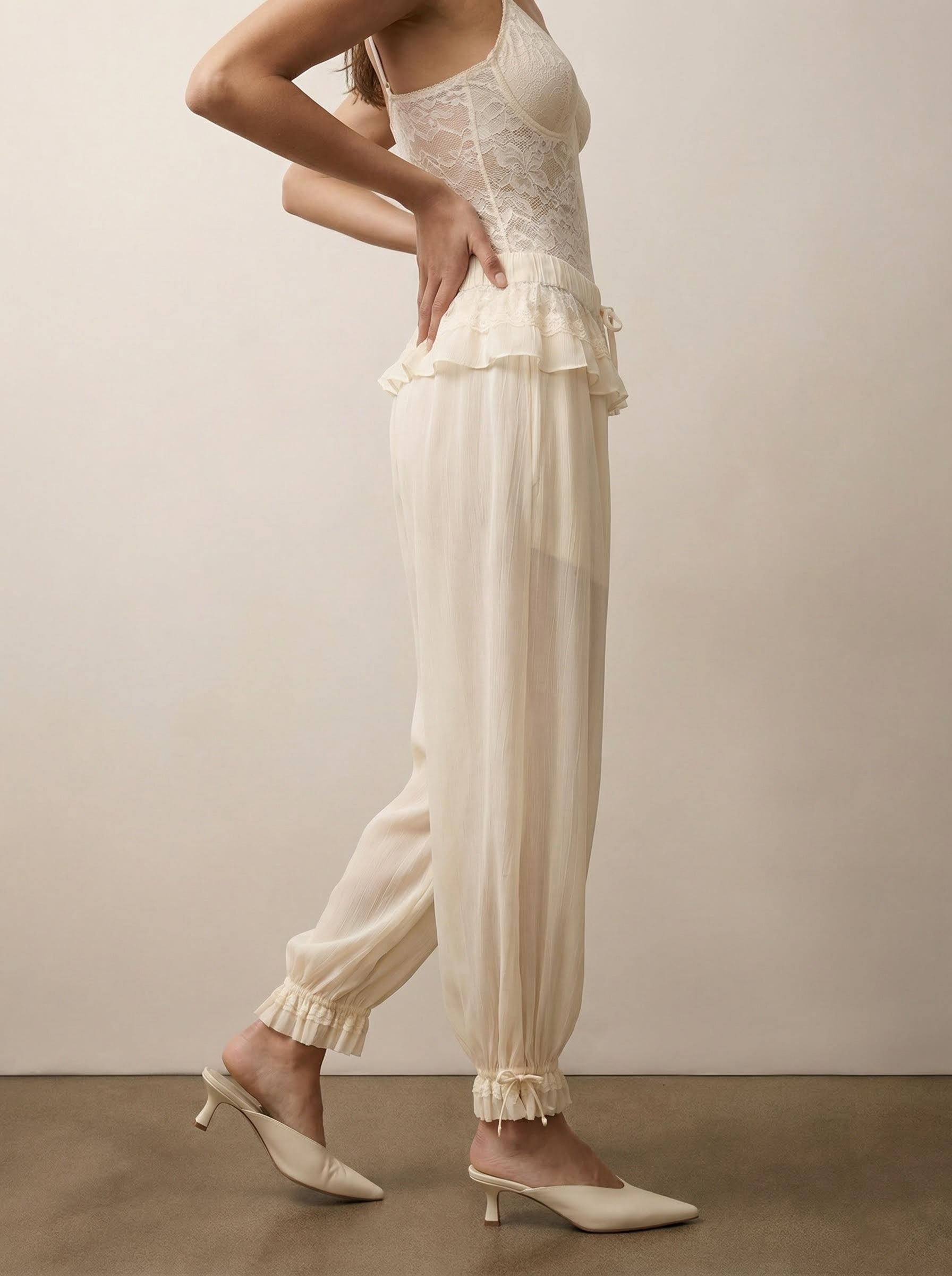 מכנסי ג’ורג’ט בסגנון אלאדין עם נוכחות בוהו נשית. מותן אלסטית עם שרוך מתכוונן, קרסוליים מכווצים ותנועה רכה יוצרים גזרה מחמיאה ונוחה. פרטי תחרה וקפלונים עדינים מוסיפים מראה רך ומעודן, מבלי לפגוע בנוחות. מושלמים ליום יום, חופשות או לוק משודרג עם טופ תואם. זמינים בנטורל, טרקוטה ושחור.