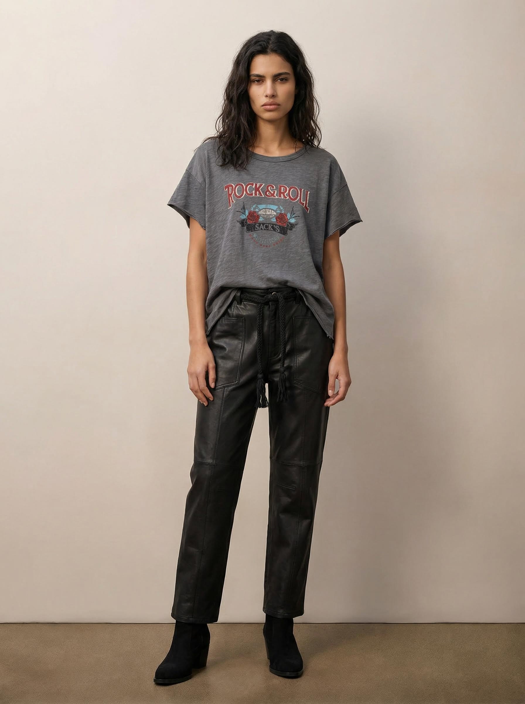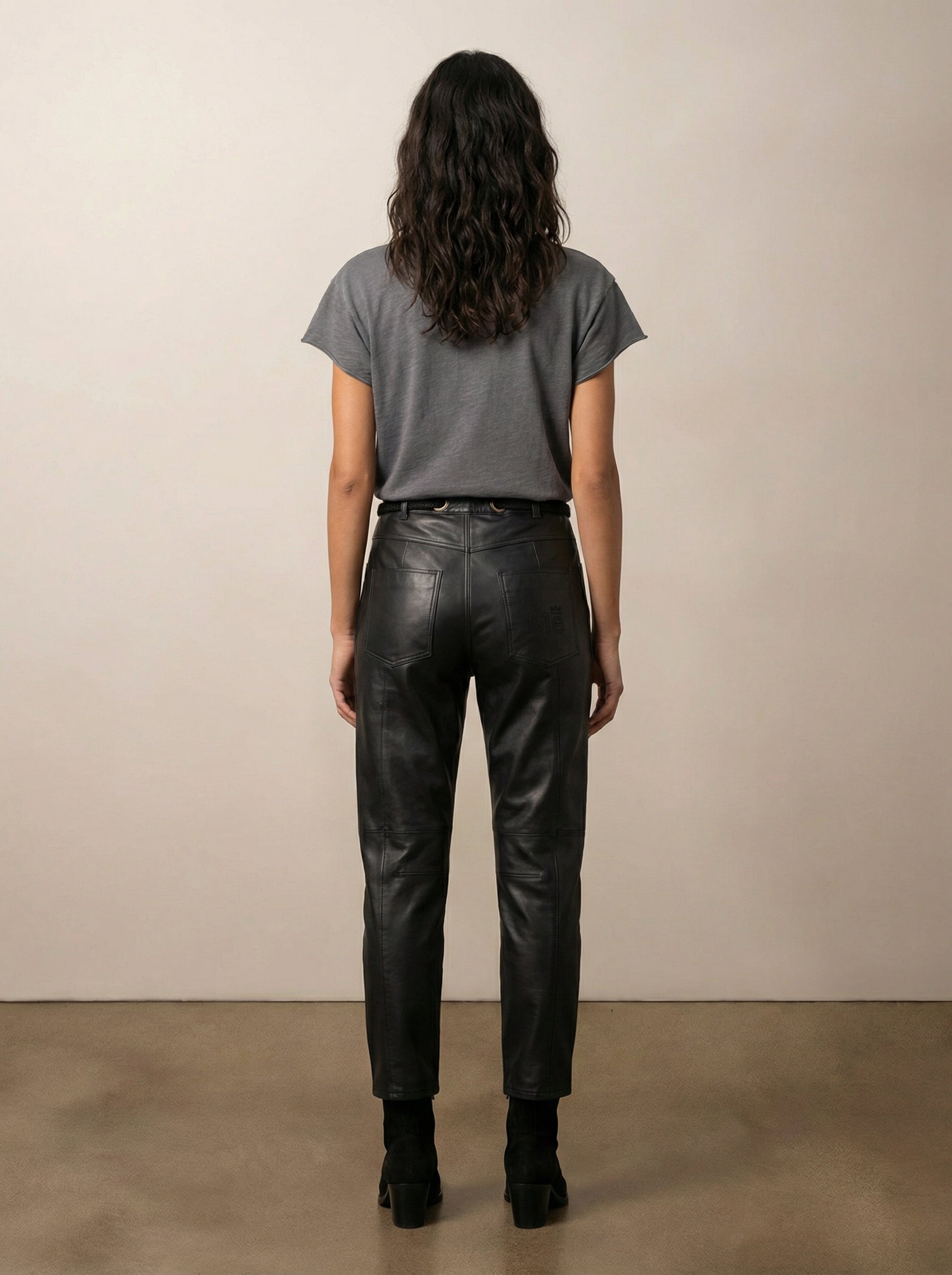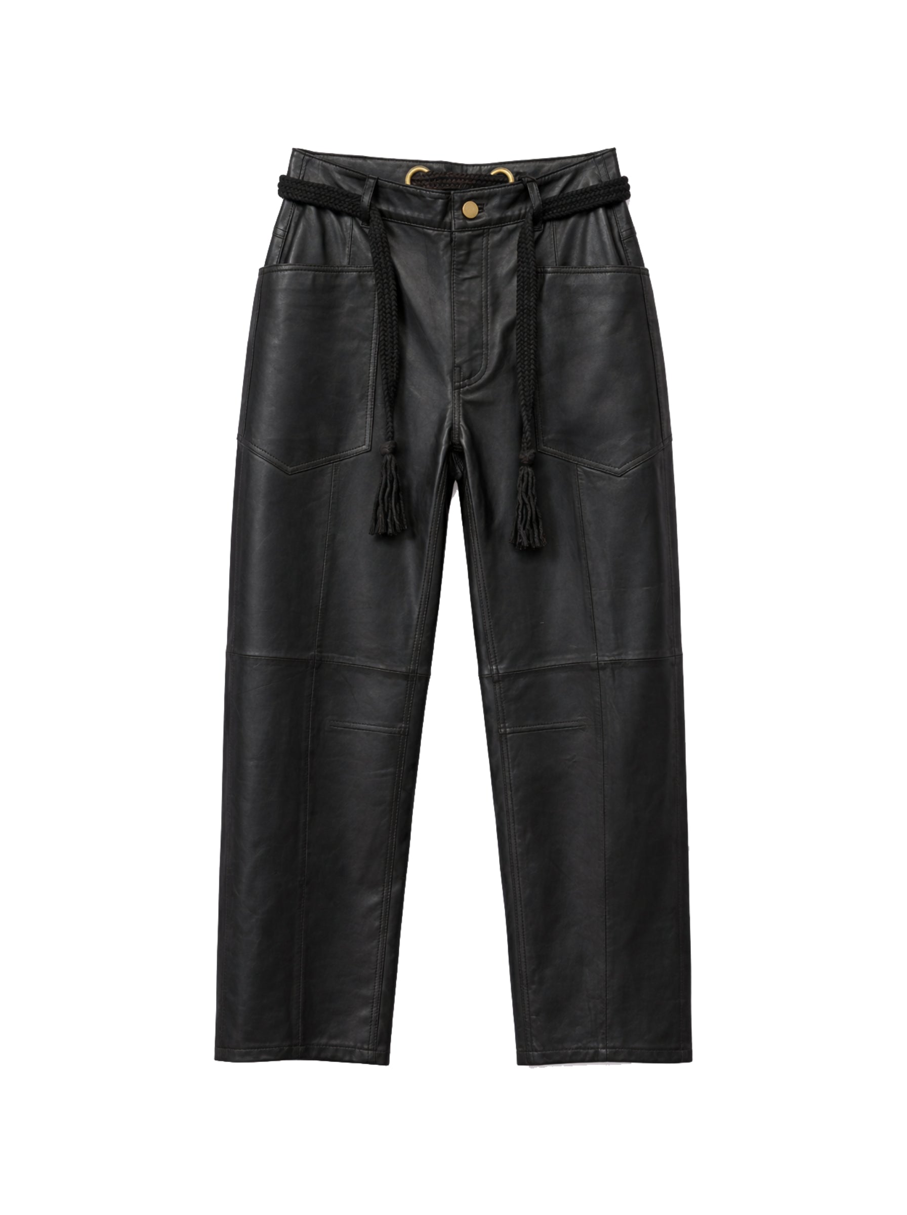 מכנסי עור בגזרת ברל עם חגורה, המשלבים נוחות יומיומית עם מראה מודרני בהשראת עולם היוטיליטי. עשויים עור רך וגמיש, עם מותן מתכווננת וגזרת ברל עכשווית היוצרת התאמה קלה ומחמיאה ותנועה טבעית לאורך כל היום. פרטי תפר עדינים וכיסים פונקציונליים מוסיפים גימור קז’ואלי אך מוקפד. ורסטיליים ובעלי נוכחות, מתאימים למעבר חלק ממראה יום ללוק ערב. שלבי עם טי שירט צמודה, חולצה או טופ תואם ליצירת הופעה נינוחה אך אלגנטית. זמינים בשחור.