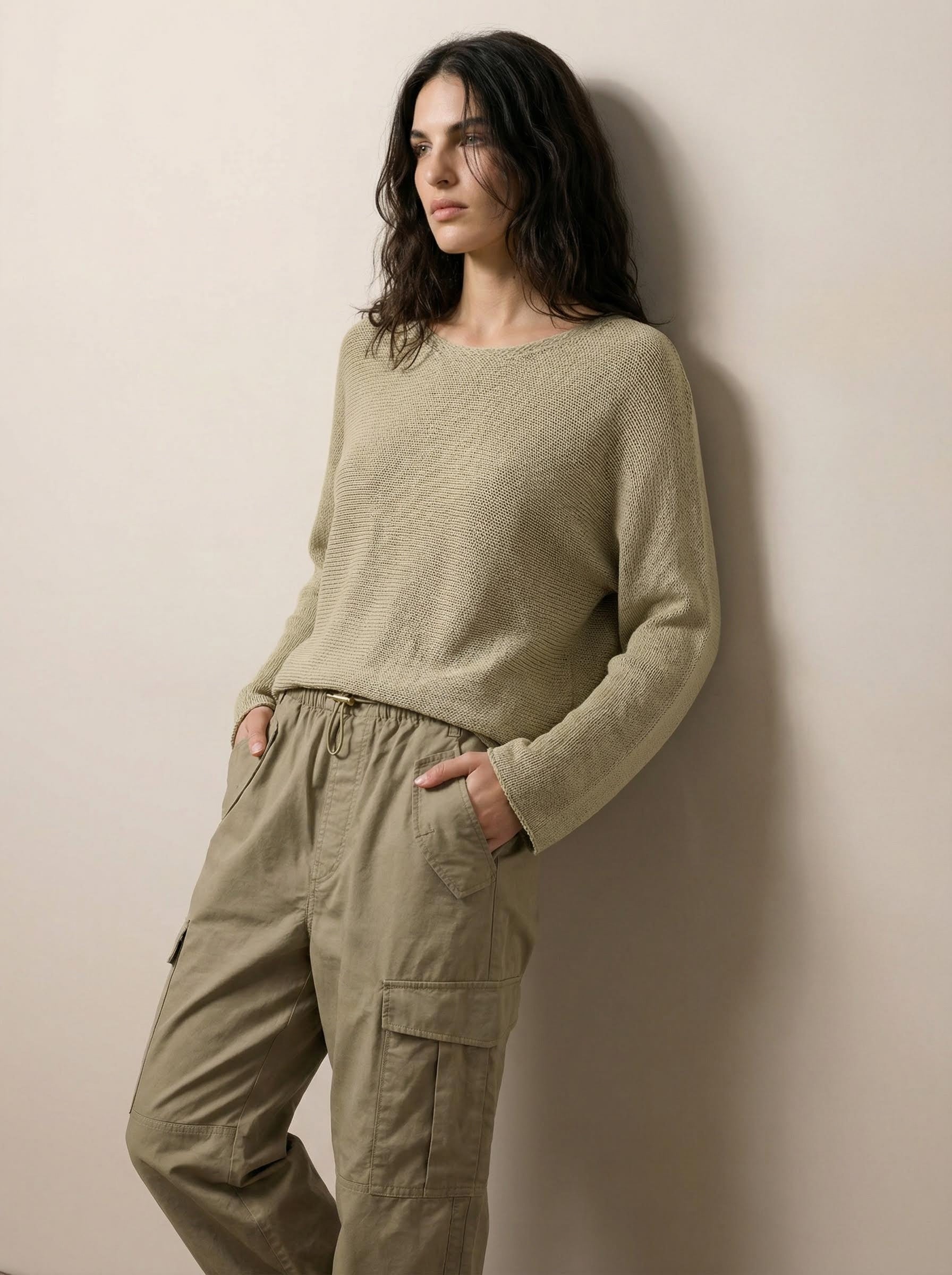 טופ סרוג בגזרה קצרה ונינוחה עם שרוולים רחבים וקצרים, למראה עכשווי ולא מתאמץ. עשוי סריג סרט רך מתערובת ויסקוזה ופוליאסטר, קליל ונושם עם תחושת מגע חלקה. צווארון נקי ועיצוב מינימליסטי מאפשרים שילוב קל עם מכנסיים או חצאיות בגזרה גבוהה, או כשכבה מעל שמלות. זמין בלבן מלא, פחם ו־האנטר.