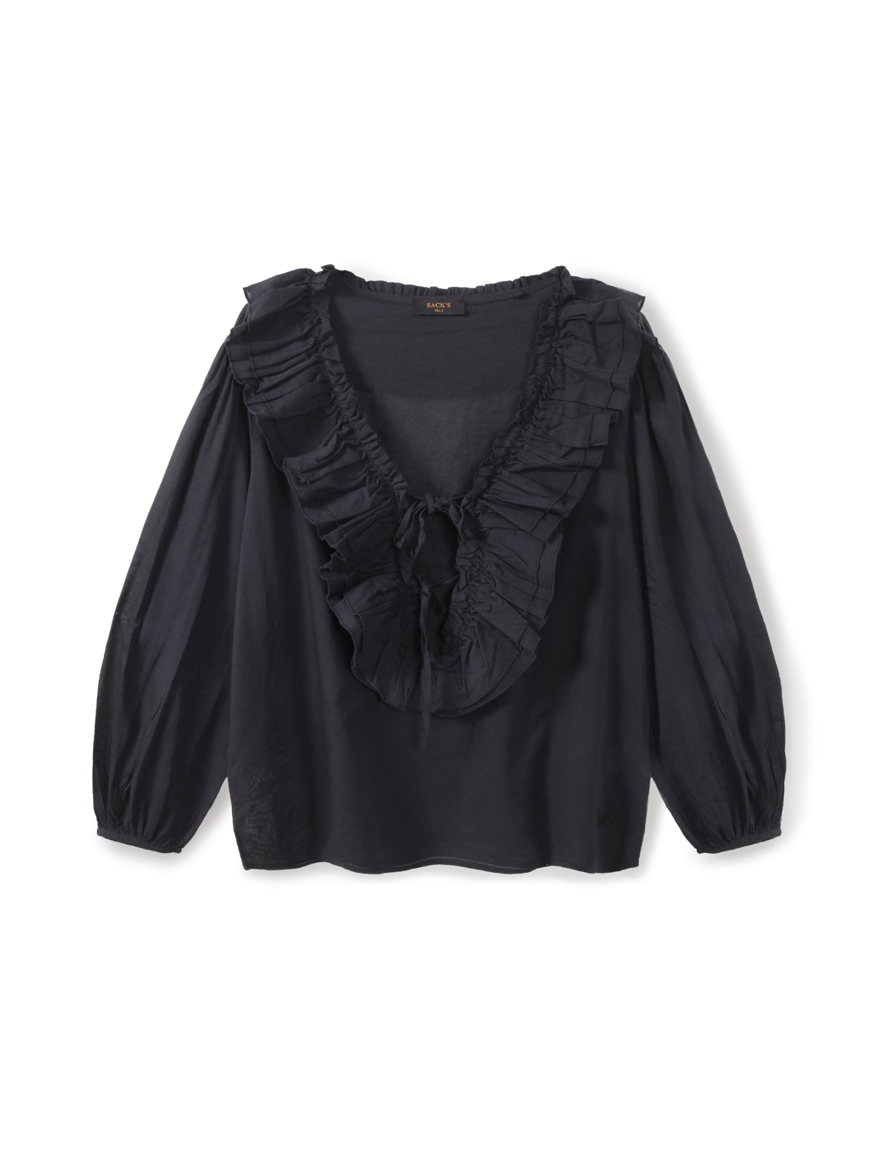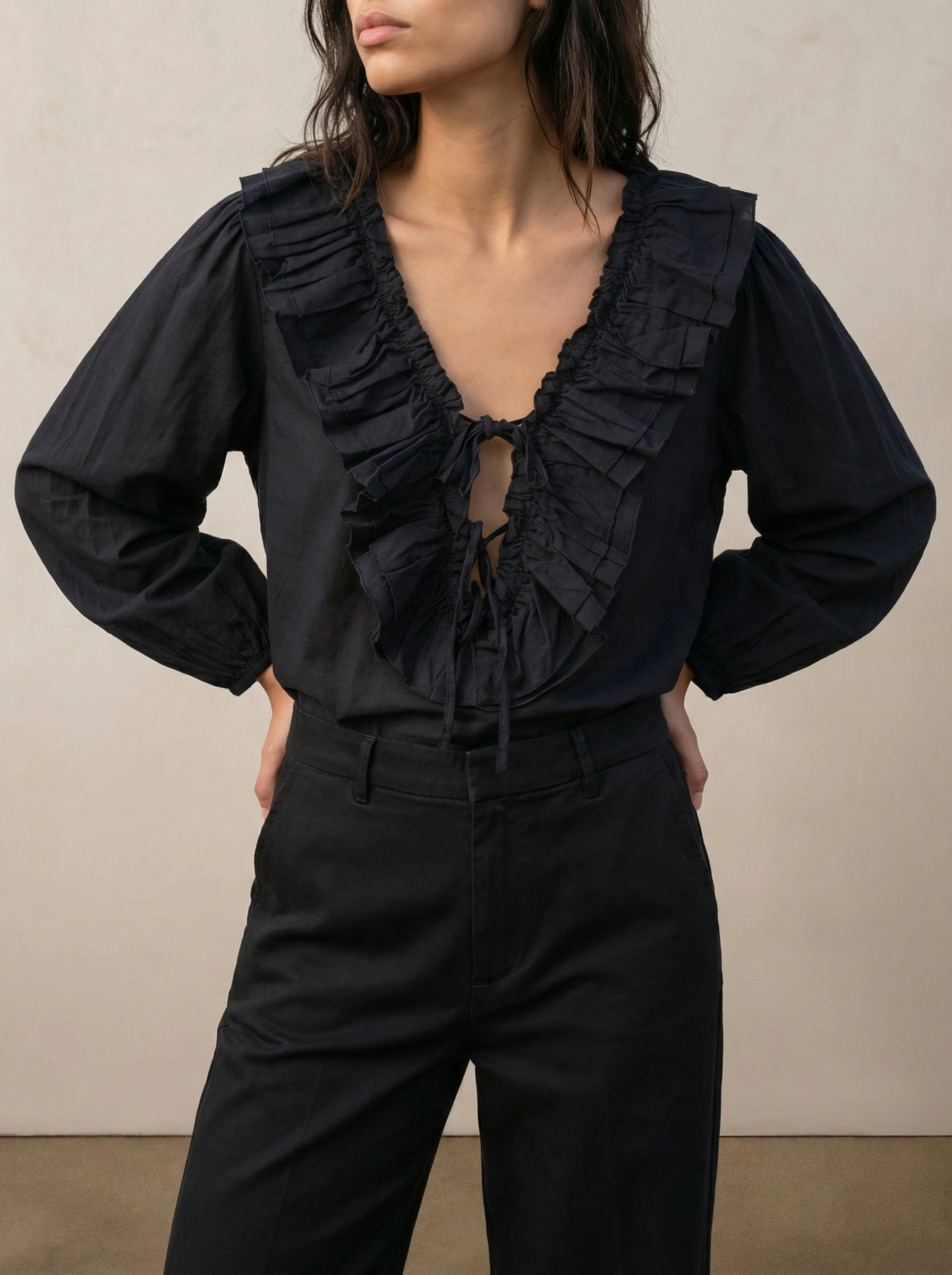 חולצת וואל כותנה קלילה בעיצוב בוהו-רומנטי. צווארון עם מלמלות עדינות וגימור תחרה, יחד עם קשירה רכה בחזית, מעניקים מראה נשי ומלא חן. בד אוורירי ושרוולי ¾ מושלמים לימים חמים ולשכבות קלילות. זמין בלבן, שחור ואפרסק.