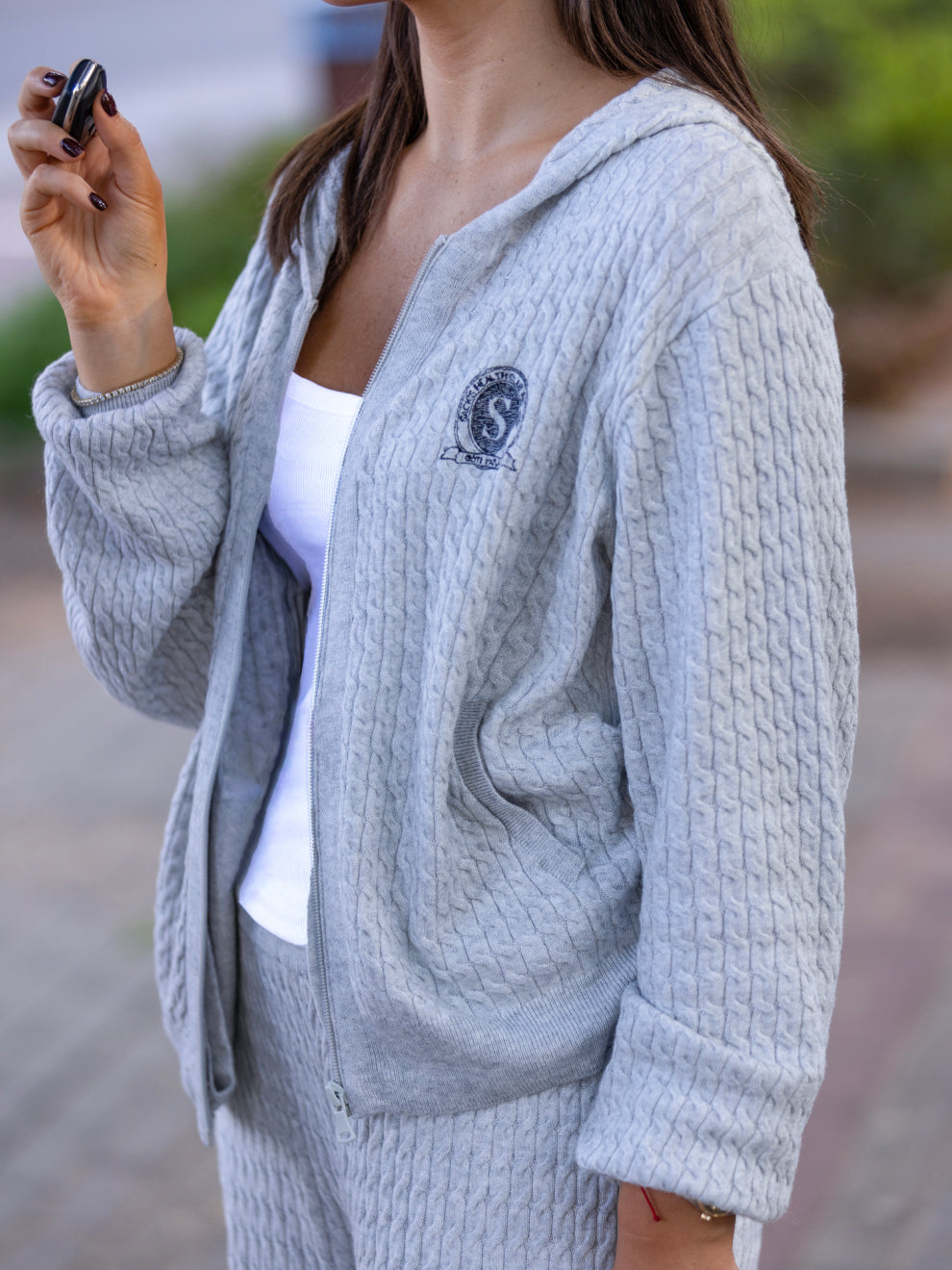 הקפוצ’ון הסרוג צמות מביא ווייב קולג' עם נגיעות לבוש רחוב אדג’י. עם לוגו סמל בולט, סגירת רוכסן קדמית נקייה וגימורי ריבד בנוחות – הוא משלב נוחות מקסימלית עם מראה מוקפד. הקפוצ’ון המובנה והכיסים האלכסוניים מוסיפים טאץ’ פרקטי וקריר בדיוק במקום הנכון. יש מכנסיים תואמים. מידות: XS–XL זמין ב-3 צבעים: חום, נייבי ולבן מלנג’.