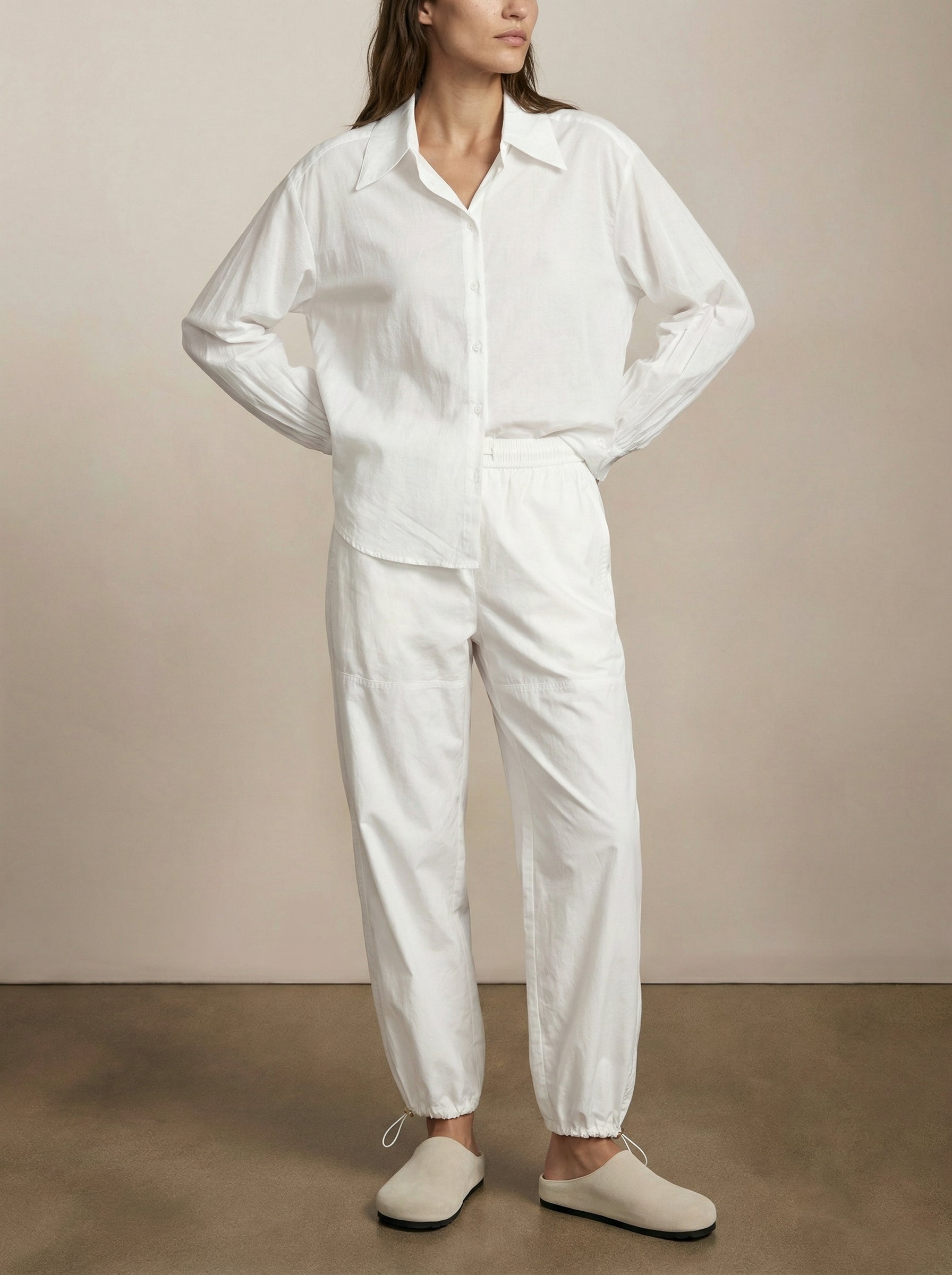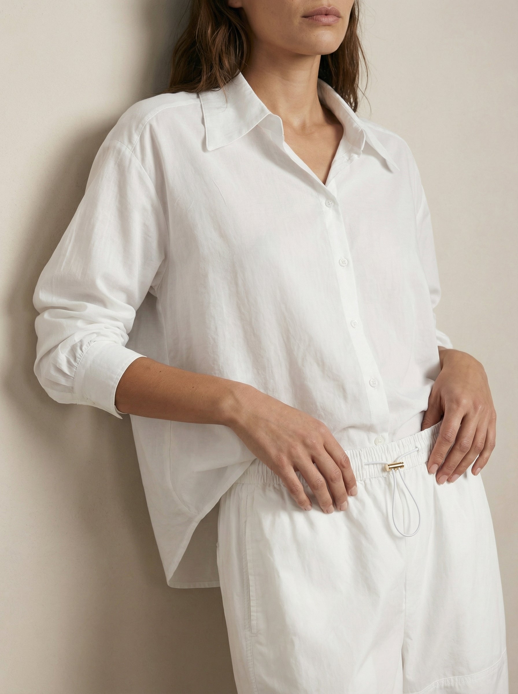חולצה מכופתרת קלאסית עם פרשנות מודרנית. צווארון מחויט, גזרה רפויה ושרוולים עם כיווץ עדין יוצרים מראה מוקפד אך נינוח. שולי חולצה מעוגלים ותפרים נקיים משלימים מראה אלגנטי שמתאים ליום ולערב. זמינה בלבן, שחור וחול.