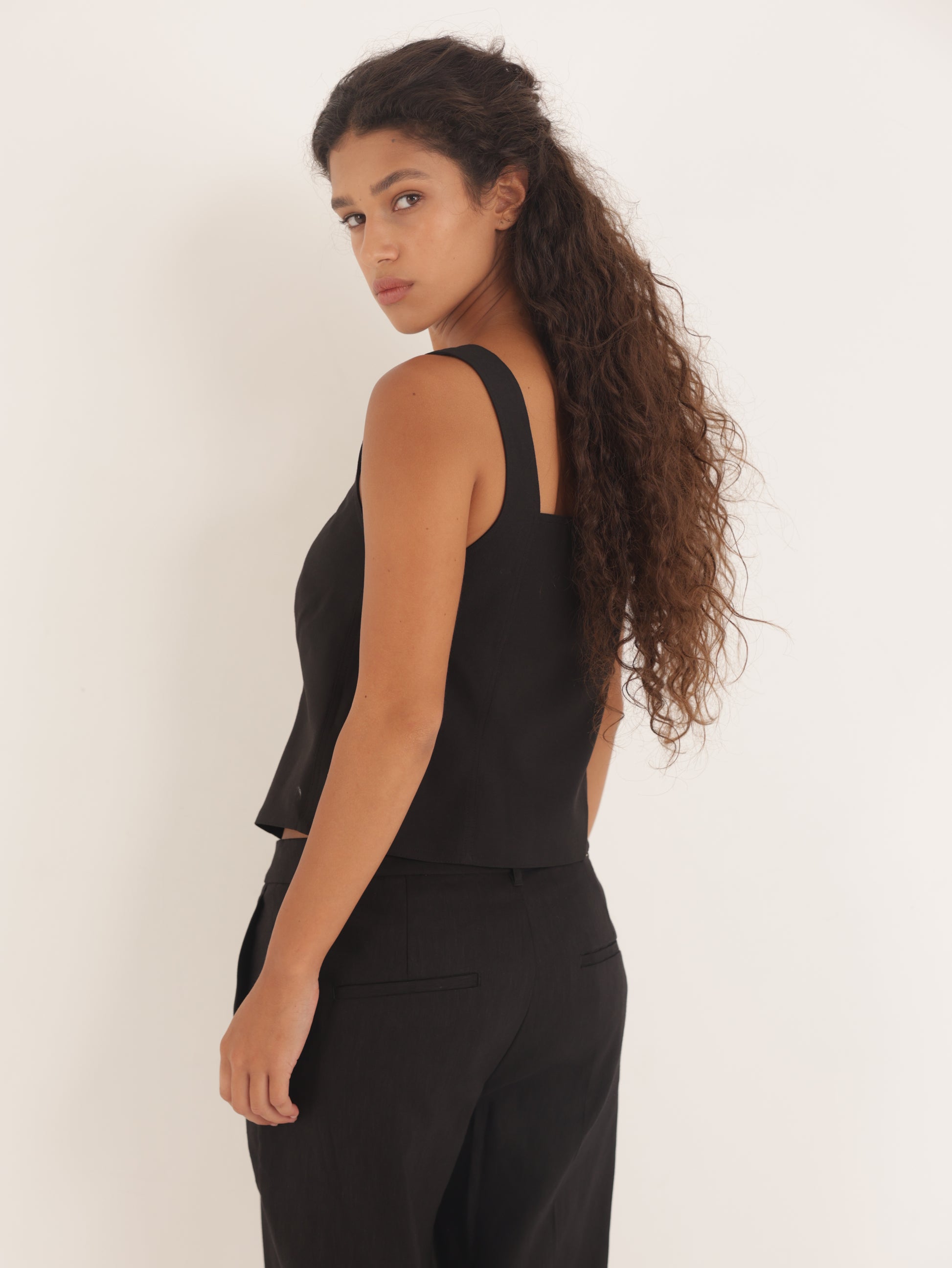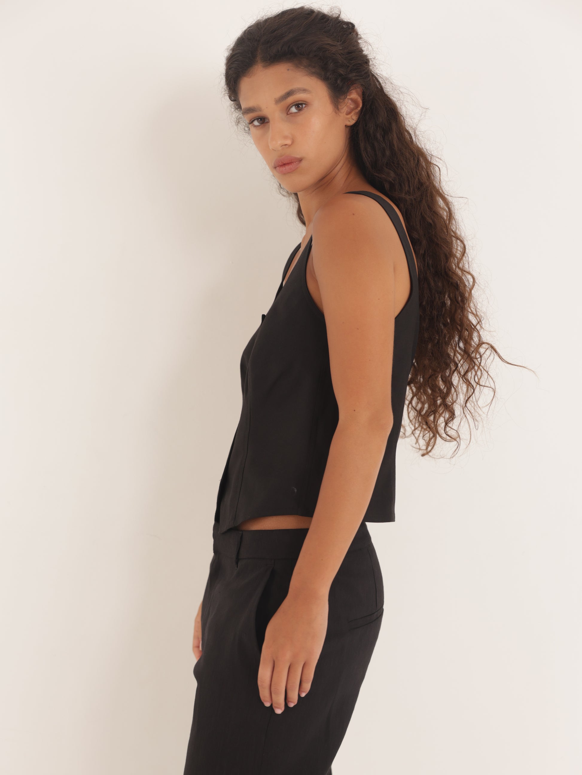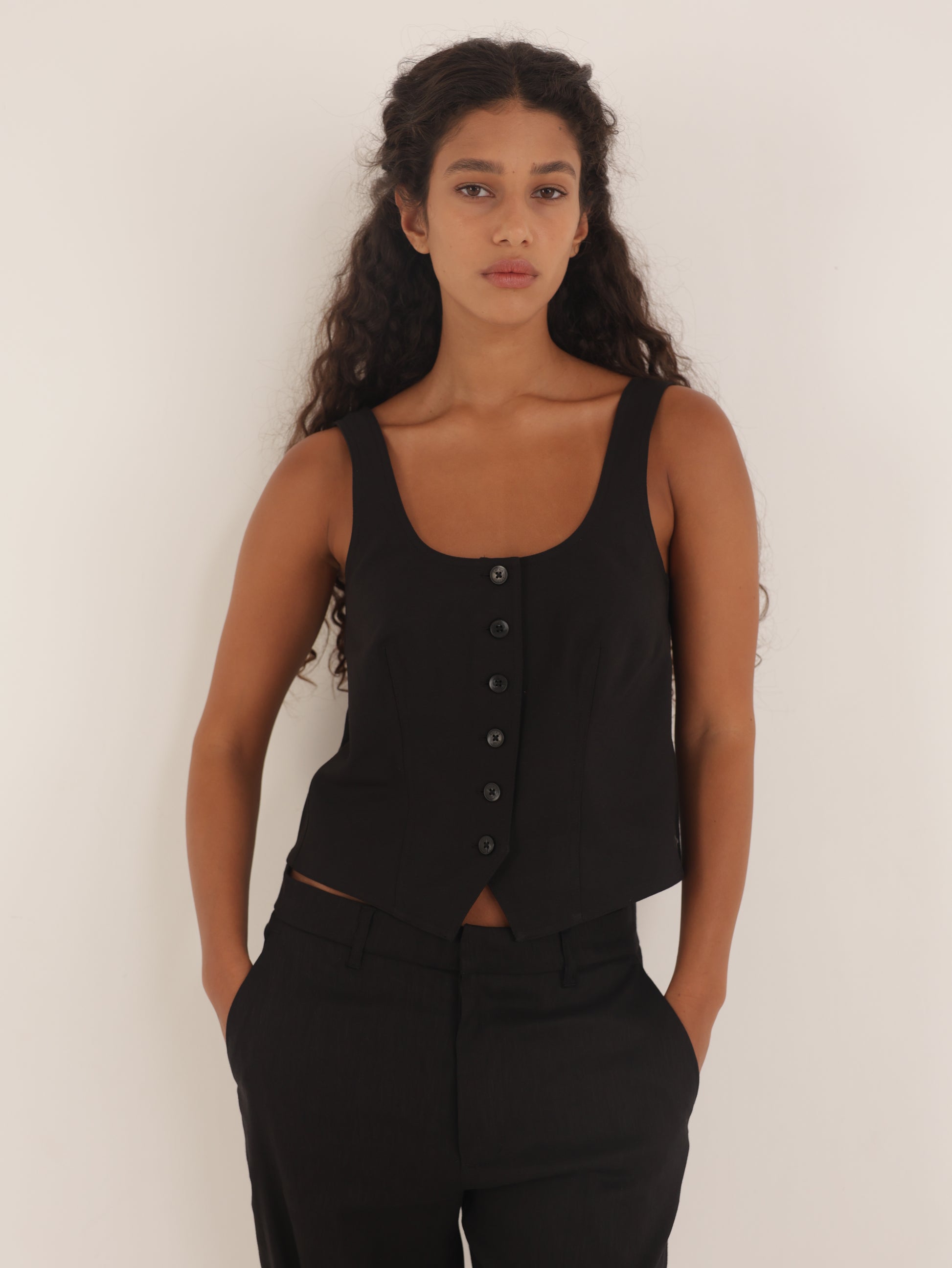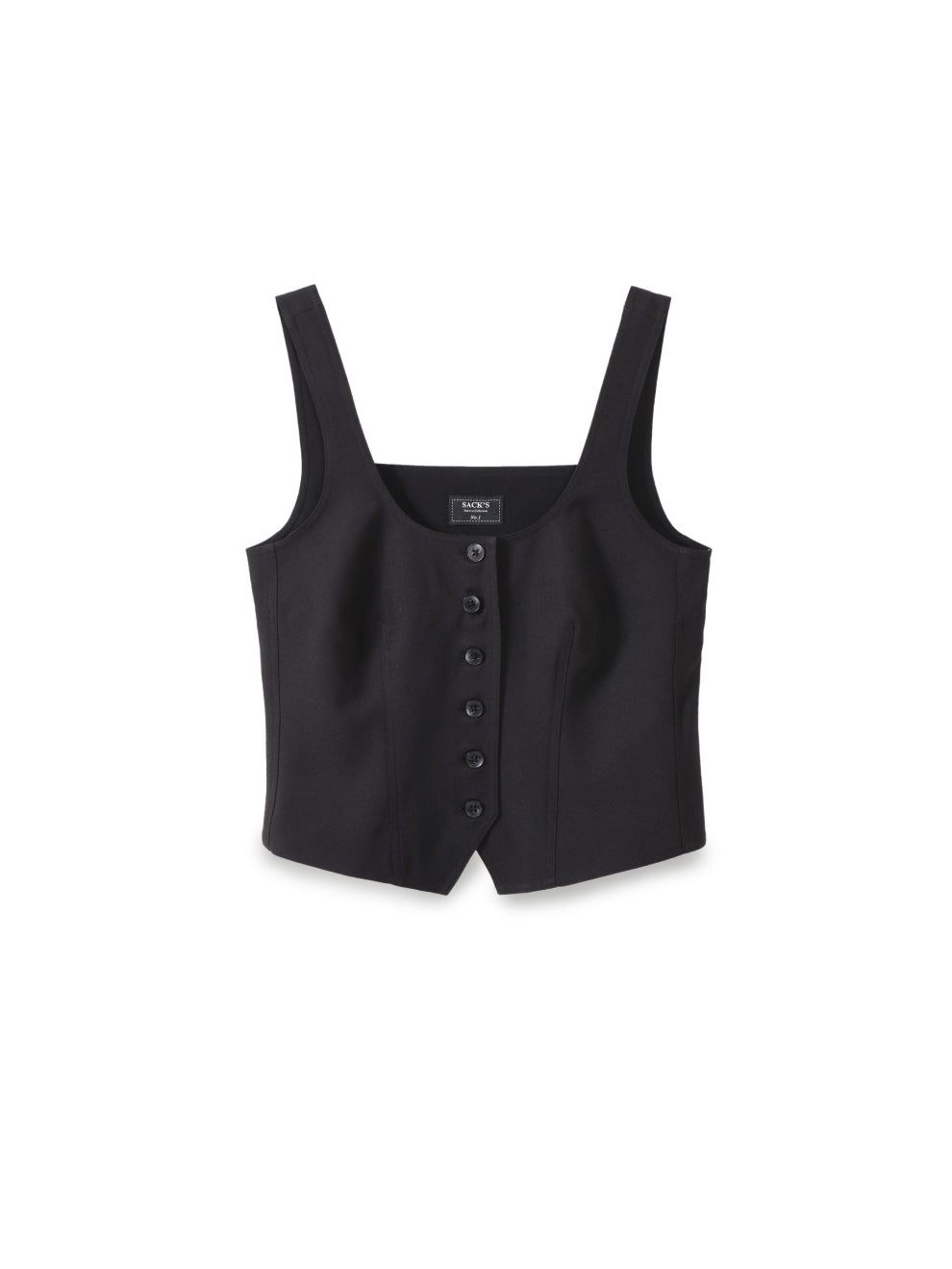 מחוך עם כתפיות עם סגירת כפתורים. כולל חזייה פנימית. זמין בצבעי קרם או שחור, במידות 0-4. שלבי עם הז'קט, הווסט או המכנסיים התואמים למראה אלגנטי ומחויט.