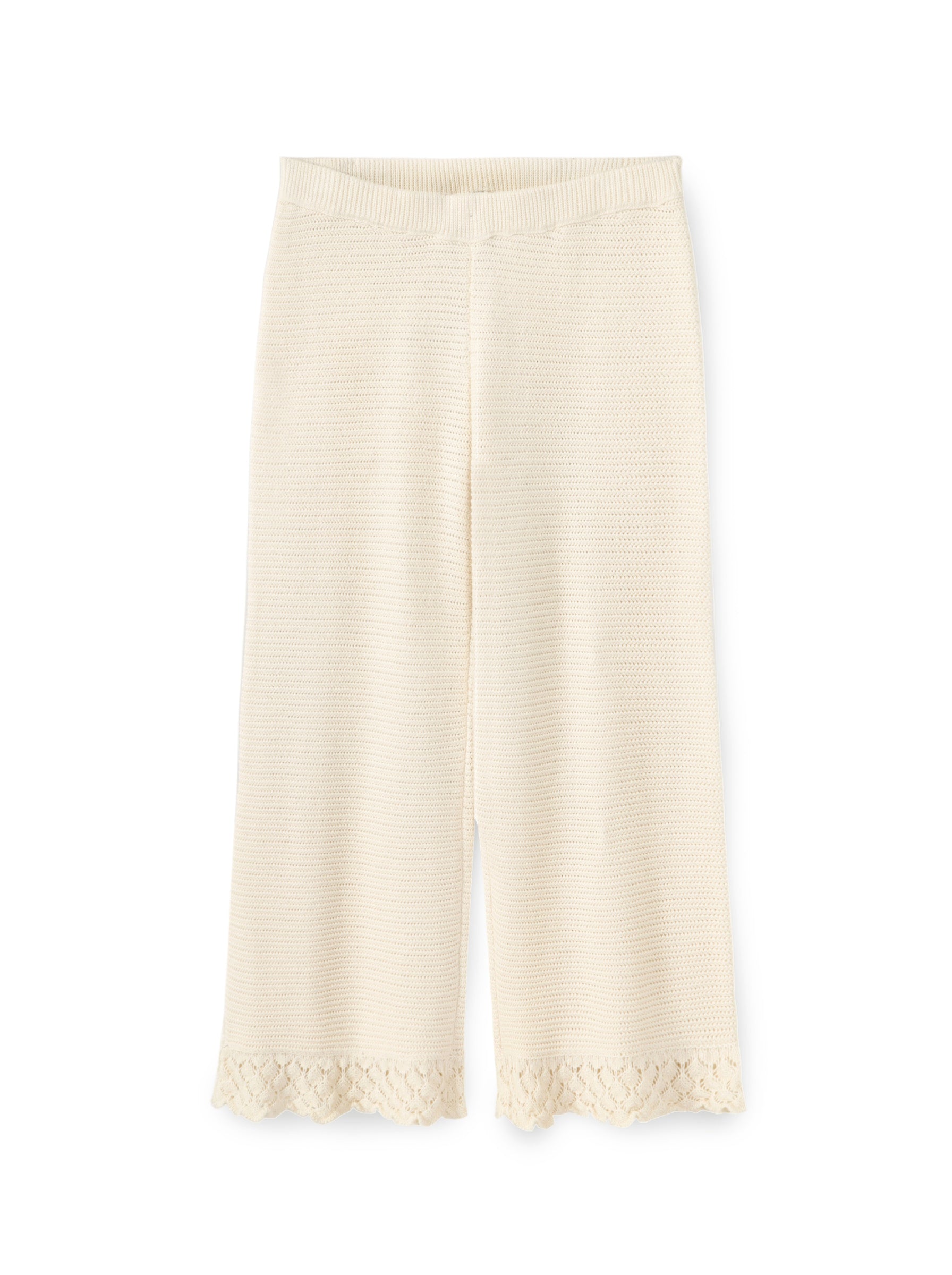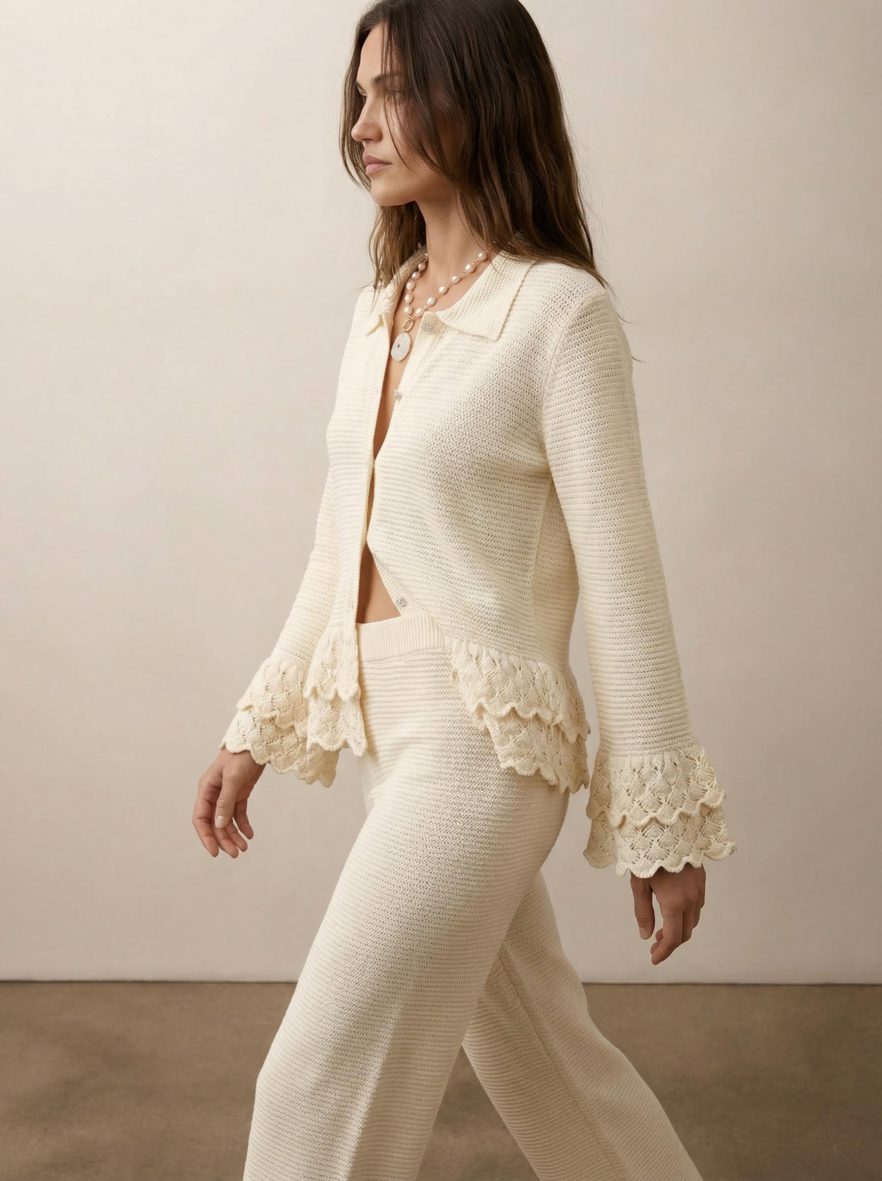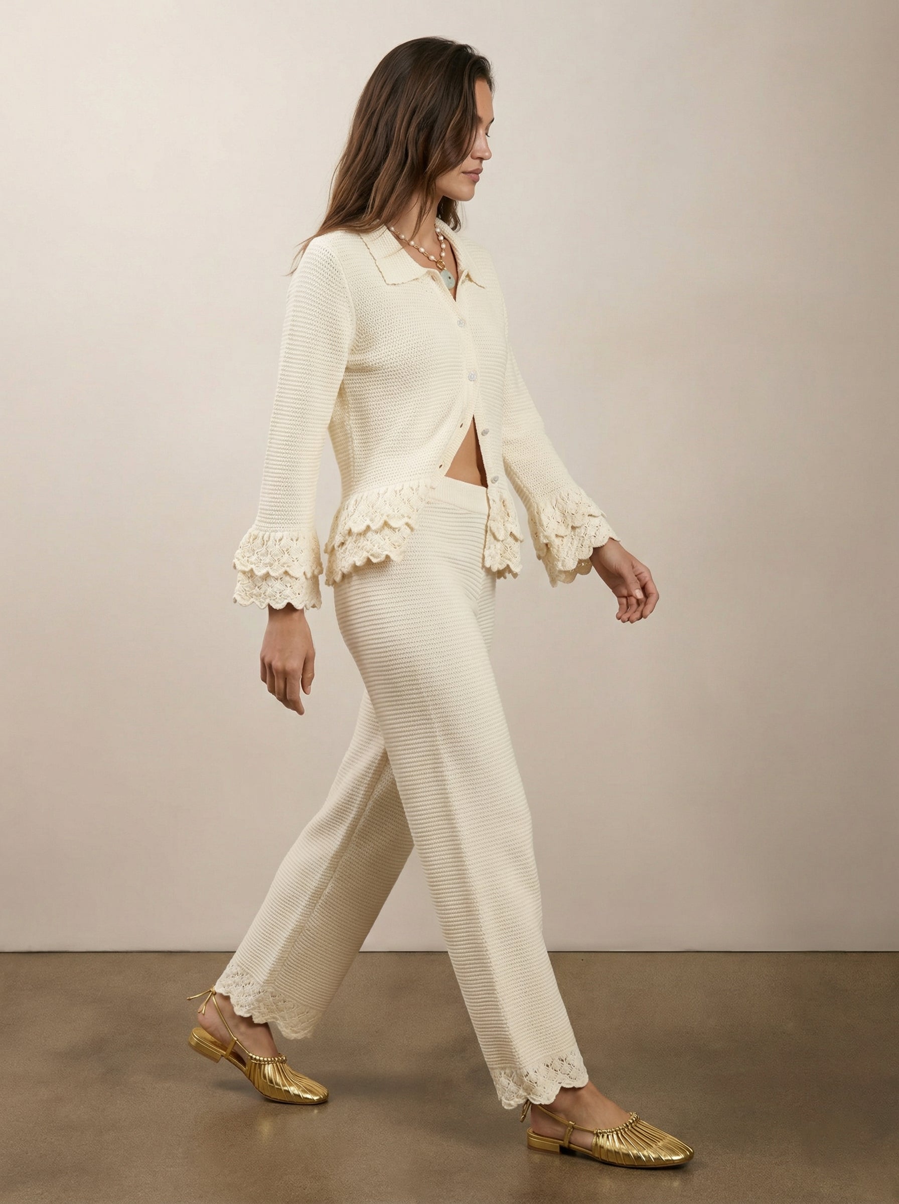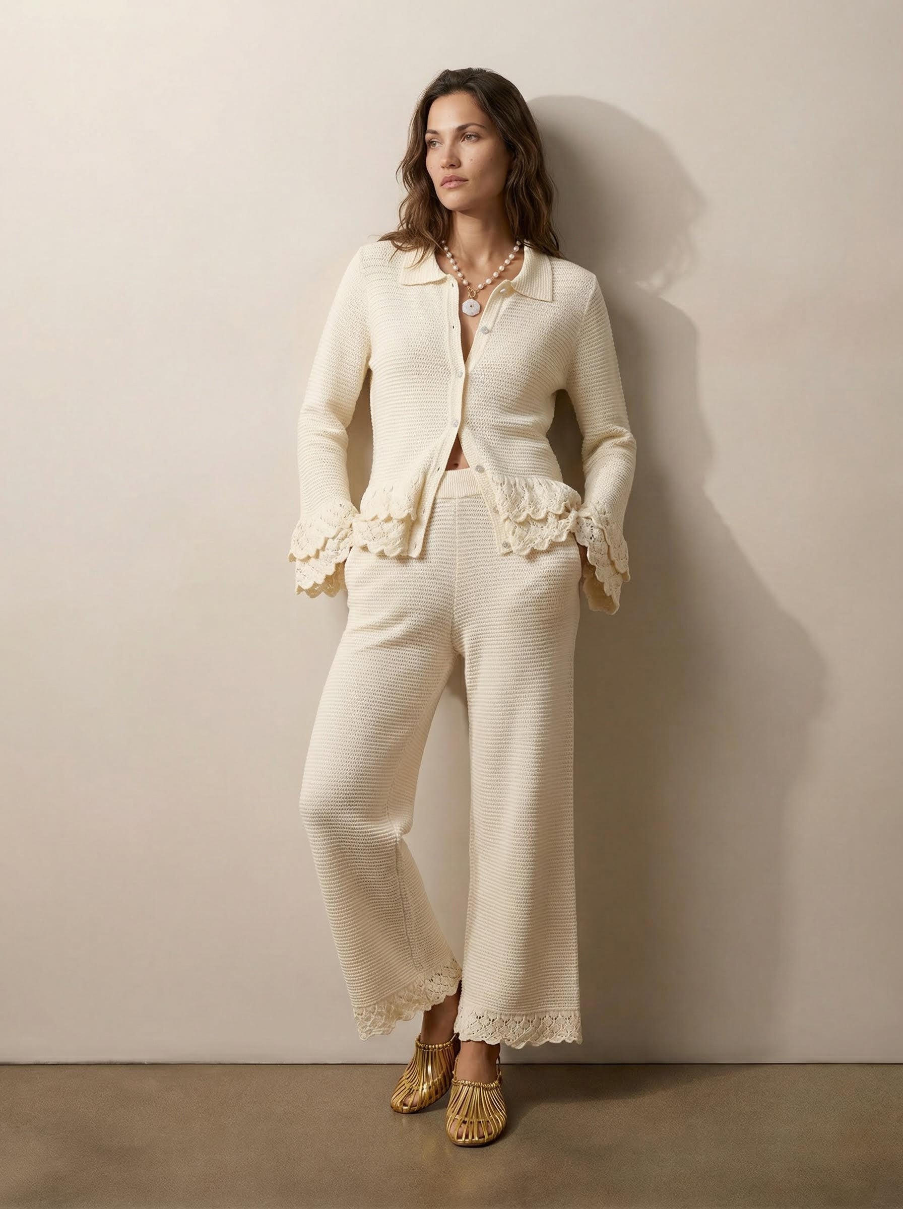 מכנסי סריג רחבים המשלבים בין נוחות לעיצוב מוקפד. מותן אלסטית רכה וגזרה רפויה ונשפכת מעניקות התאמה קלה ותנועה יפה. בד סרוג בטקסטורה עשירה מוסיף עומק עדין, ושולי המכפלת עם קפלונים יוצרים גימור נשי ועכשווי. מתאימים ללבישה בפני עצמם או כלוק שלם, ומשתלבים בצורה מושלמת עם הטופ התואם למראה מתואם ואלגנטי. זמינים בקרם ובשחור למראה על־זמני ורב־שימושי.