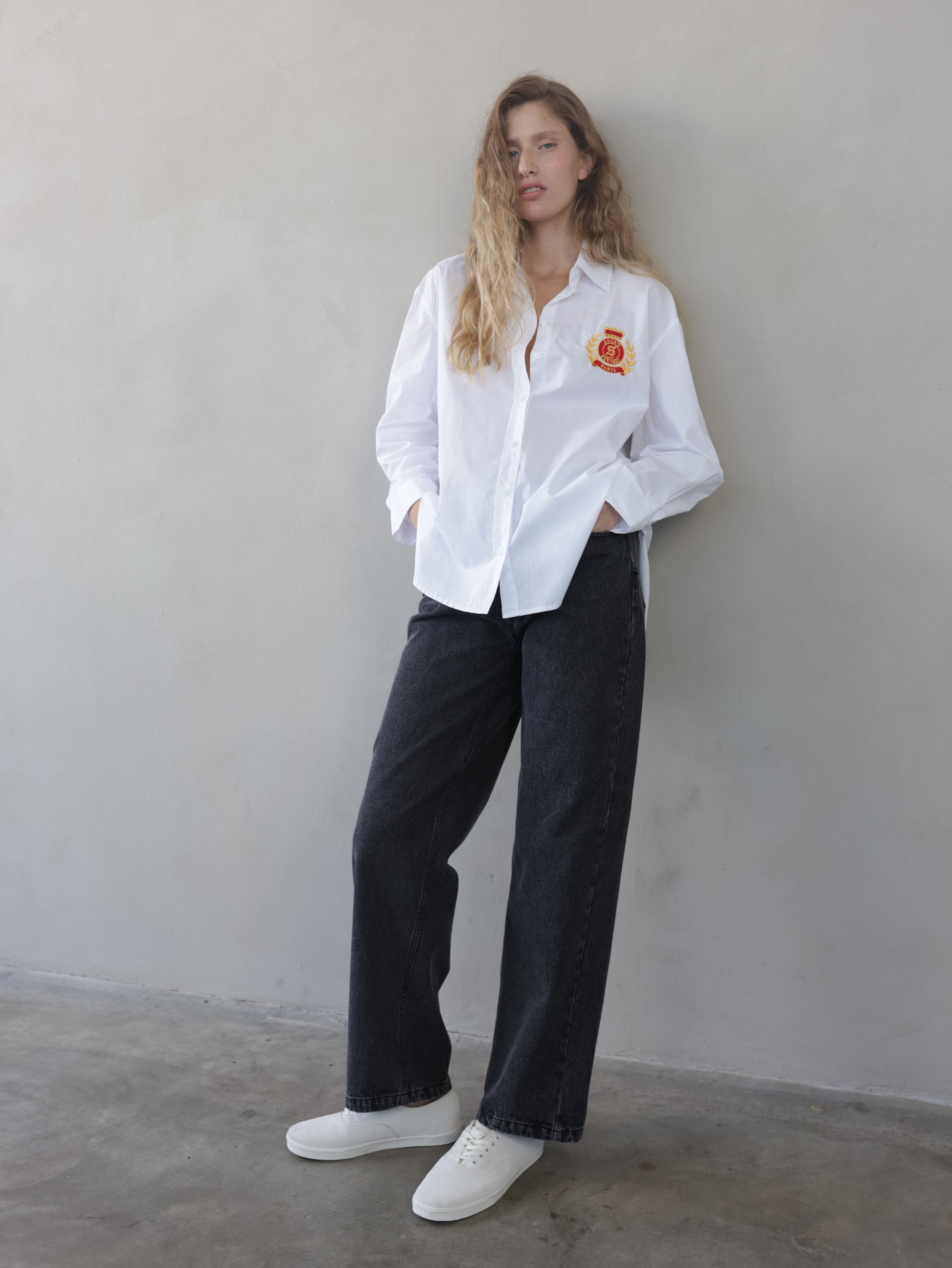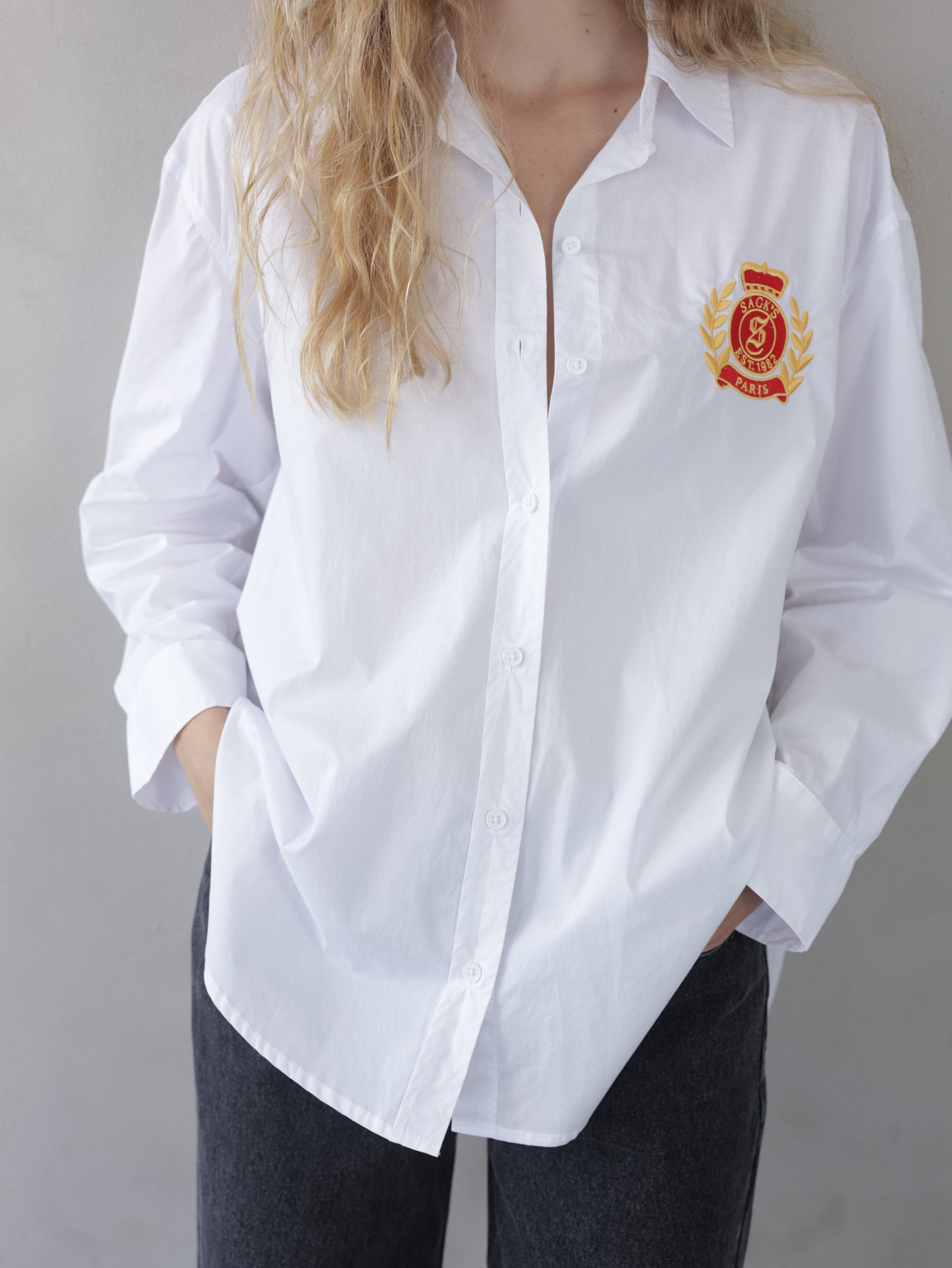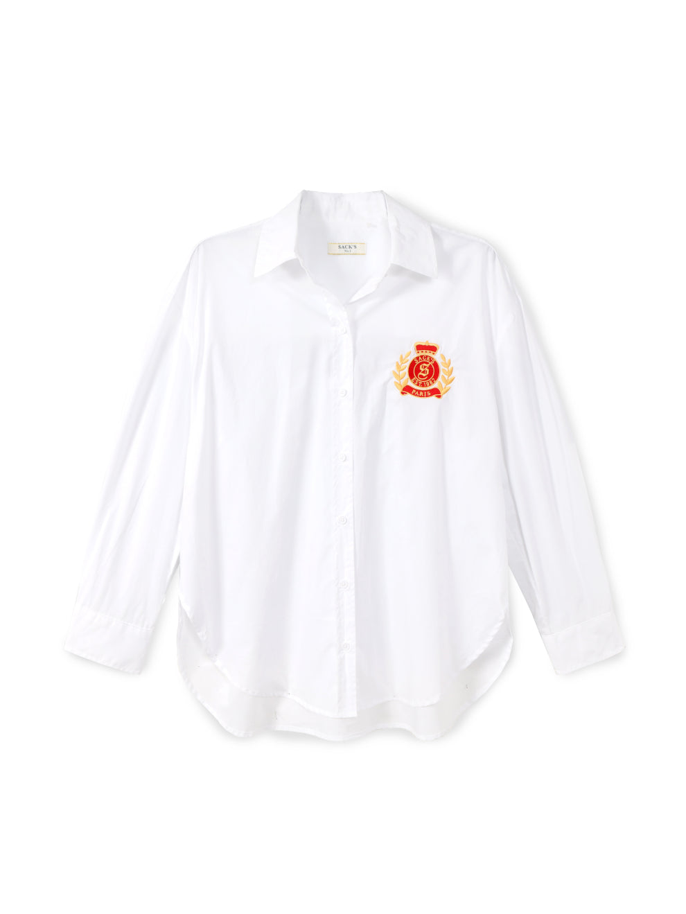 חולצה מכופתרת. חולצה ארוכה מכופתרת, עם צווארון, חפת כפתור אחד ופס תחתון מעוגל. לוגו Sack’s בחזית. זמינה בלבן, שחור ודנים במידות 0–4. מומלץ לשלב עם מכנסי ג'ינס למראה ספורטיבי ומוקפד.