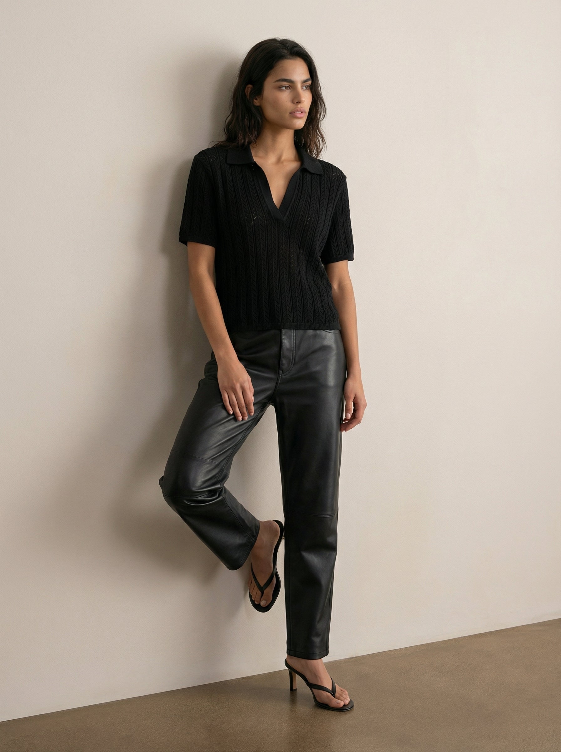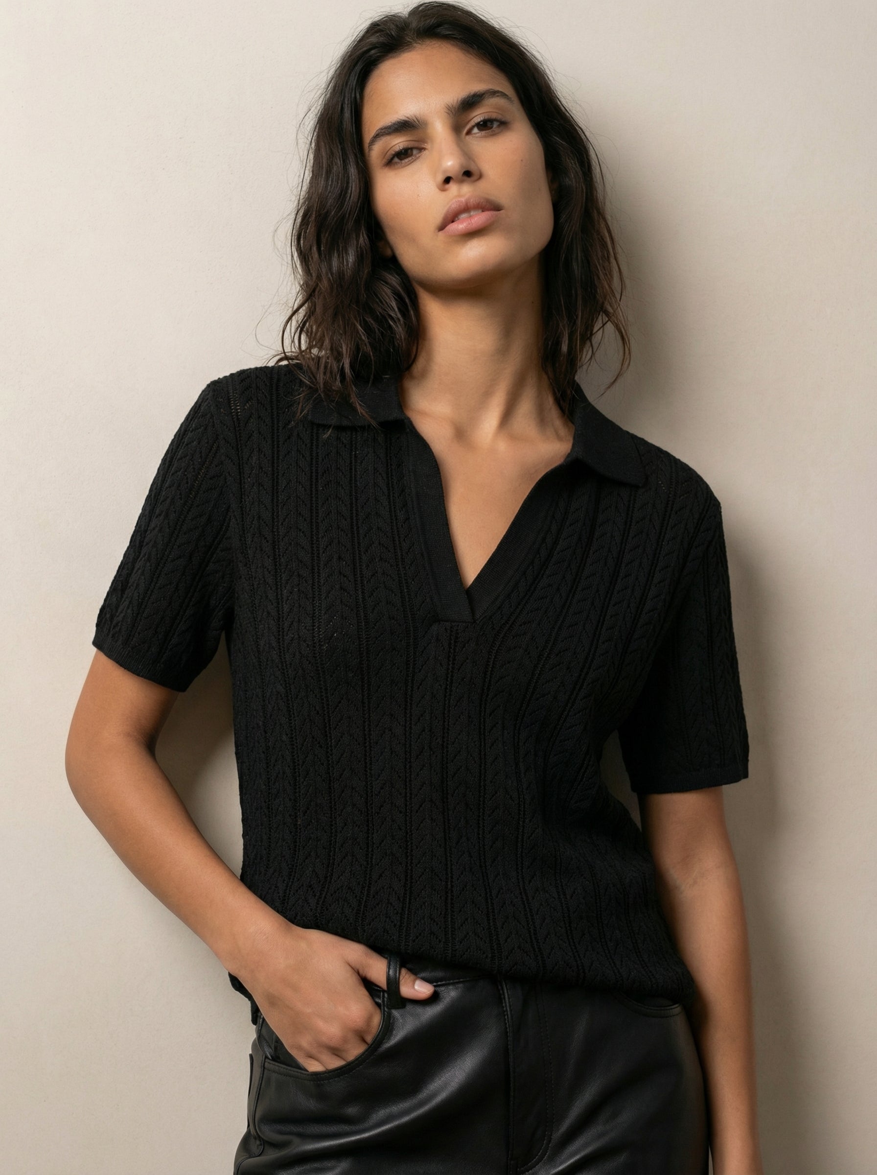 חולצת פולו סרוגה עם שרוולים קצרים מתערובת כותנה, פריט יומיומי מוקפד עם תחושה מודרנית ונינוחה. עיצוב עם צווארון קלאסי ומפתח נקי ופתוח יוצר איזון מושלם בין מראה מסודר לנוחות. בד רך ונושם מאפשר לבישה נוחה לאורך כל היום, בין אם בלוק קז’ואלי או מוקפד יותר. הגזרה העל־זמנית משתלבת בקלות עם ג’ינס, מכנסיים מחויטים או חצאיות. זמינה בצבעים נטורל, שחור וחום לשילוב קל בכל מלתחה.