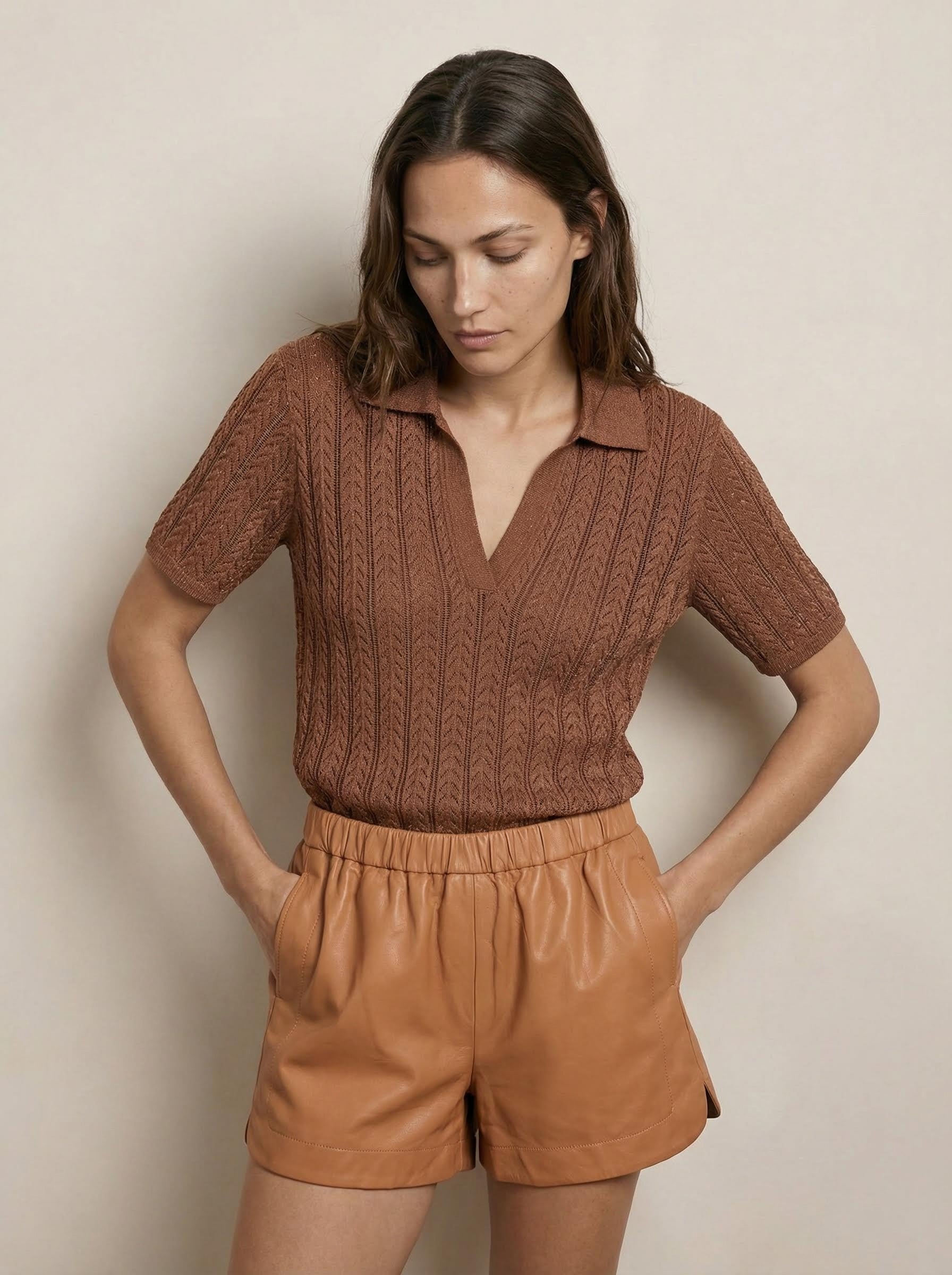 חולצת פולו סרוגה עם שרוולים קצרים מתערובת כותנה, פריט יומיומי מוקפד עם תחושה מודרנית ונינוחה. עיצוב עם צווארון קלאסי ומפתח נקי ופתוח יוצר איזון מושלם בין מראה מסודר לנוחות. בד רך ונושם מאפשר לבישה נוחה לאורך כל היום, בין אם בלוק קז’ואלי או מוקפד יותר. הגזרה העל־זמנית משתלבת בקלות עם ג’ינס, מכנסיים מחויטים או חצאיות. זמינה בצבעים נטורל, שחור וחום לשילוב קל בכל מלתחה.