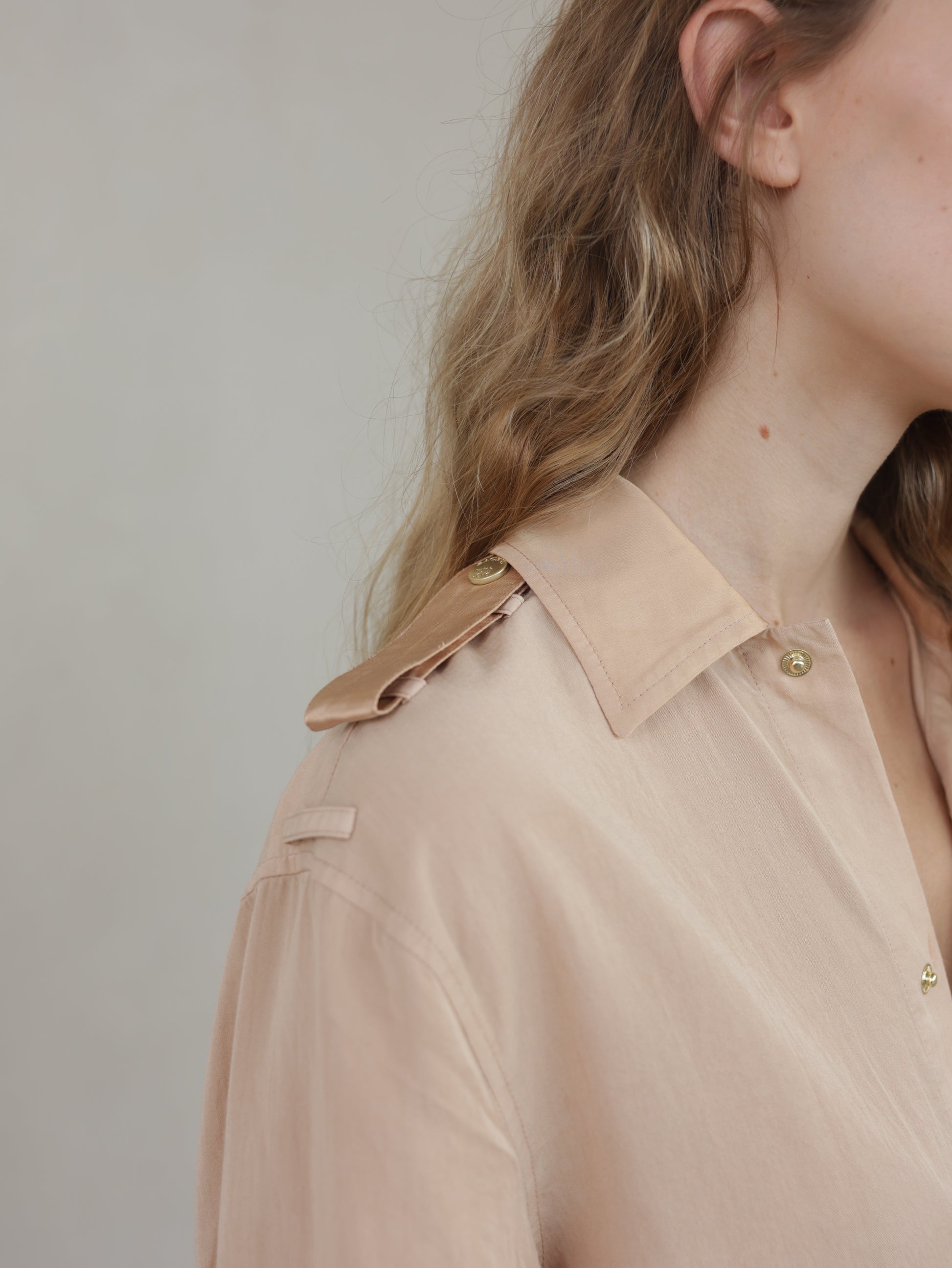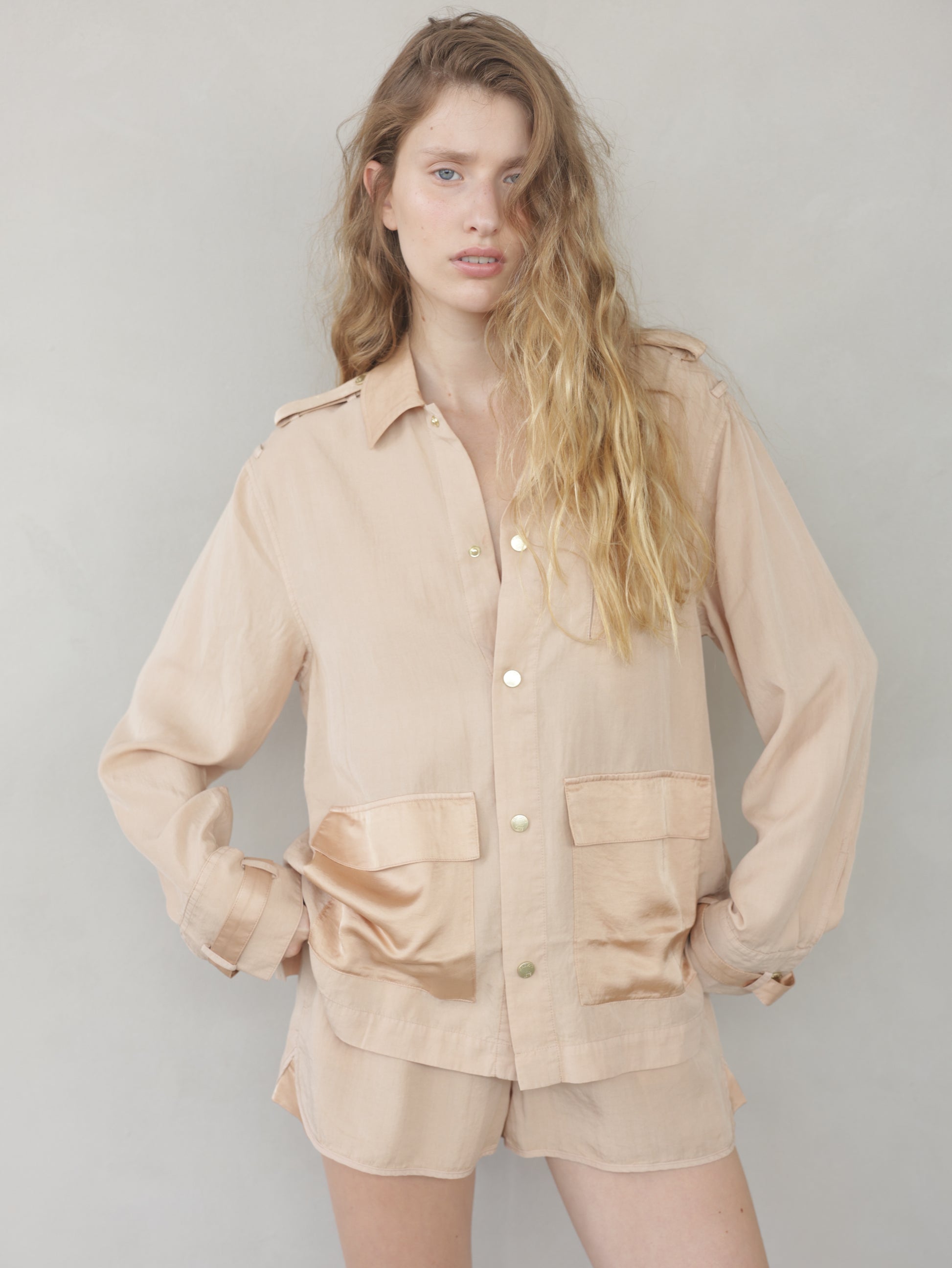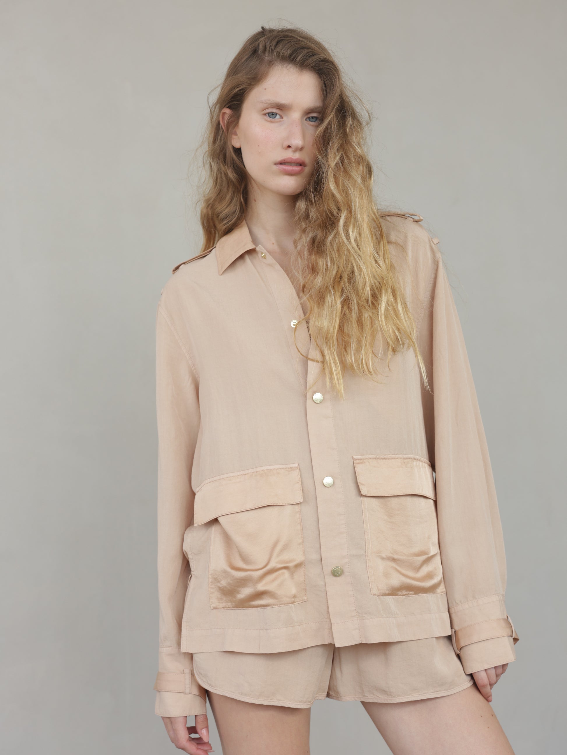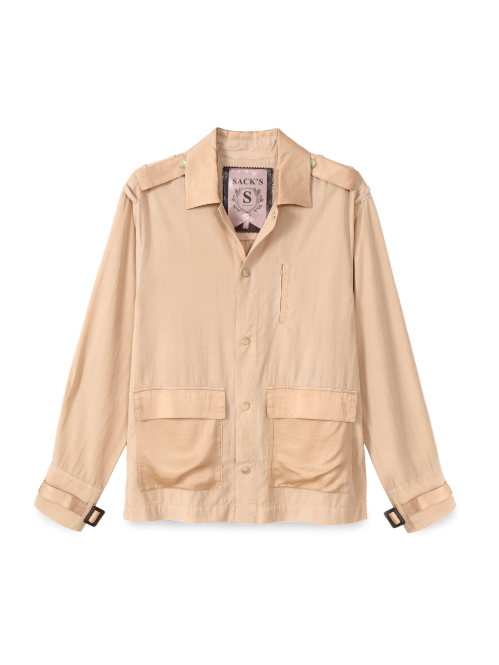 ז׳קט סאטן מכופתר עם שרוולים ארוכים. בחזית- דש אנכי קטן בגובה החזה ושני כיסים עם דשים בקו המכפלת. הצווארון, השרוולים והכיסים בצבע קונטרסטי. זמין בוורוד, נטורל או חאקי, במידות 1–3. שלבי עם מכנס קצר תואם למראה ספורטיבי וכיפי.