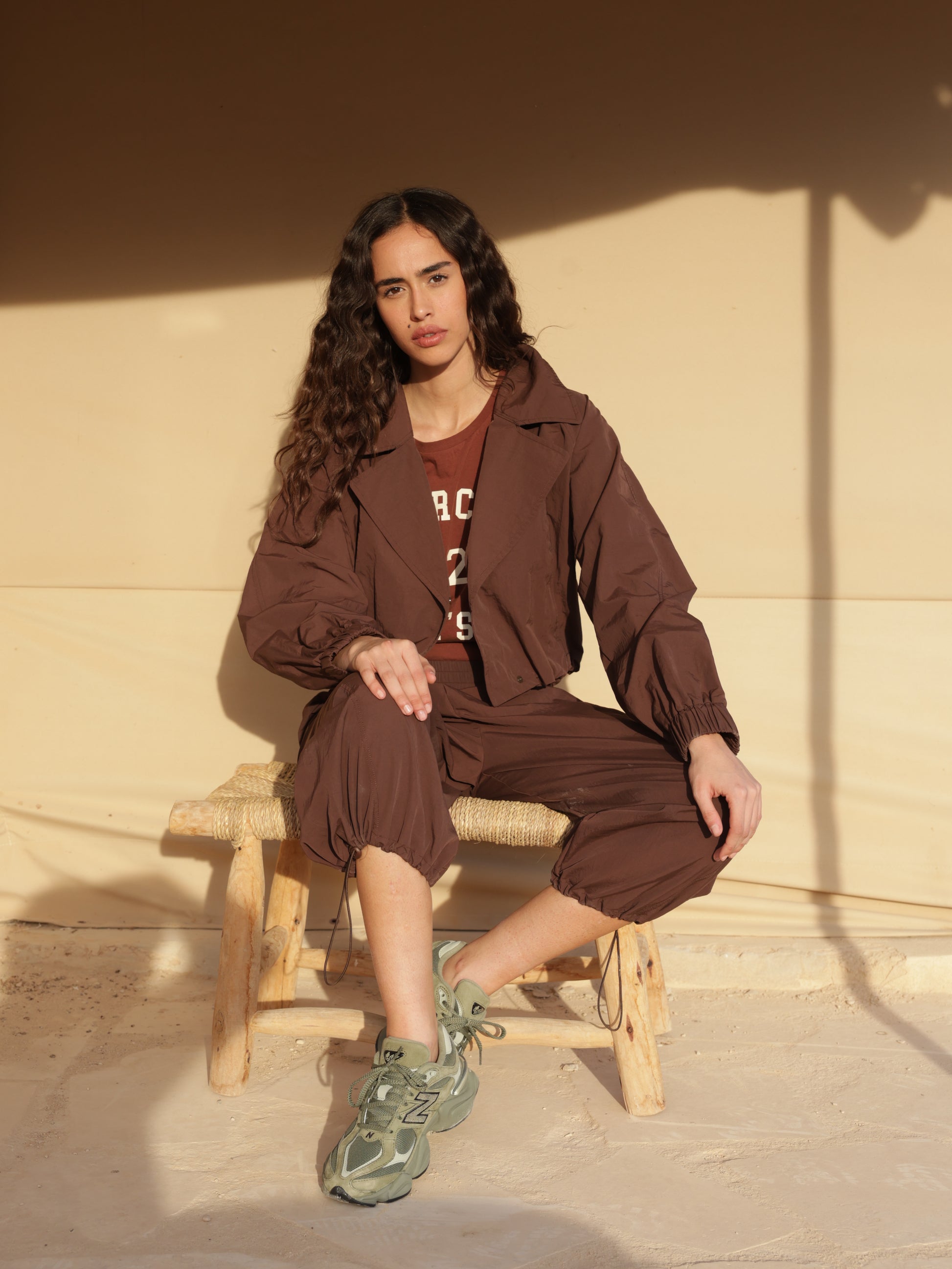 ג'קט ניילון באורך קצר עם שרוולים רחבים וחפתים אלסטיים. לשרוולים יש תפר מעוגל מהכתף ועד אמצע השרוול בחזית וישר לרוחב מאחור. חצים אלכסוניים מלפנים מקו החזה ועד קו המכפלת. זמין בשחור, זית, חום , אבן או שקד במידות 1-3. שלבי עם המכנסיים התואמים שלנו למראה ארטיסטי שובה עין.