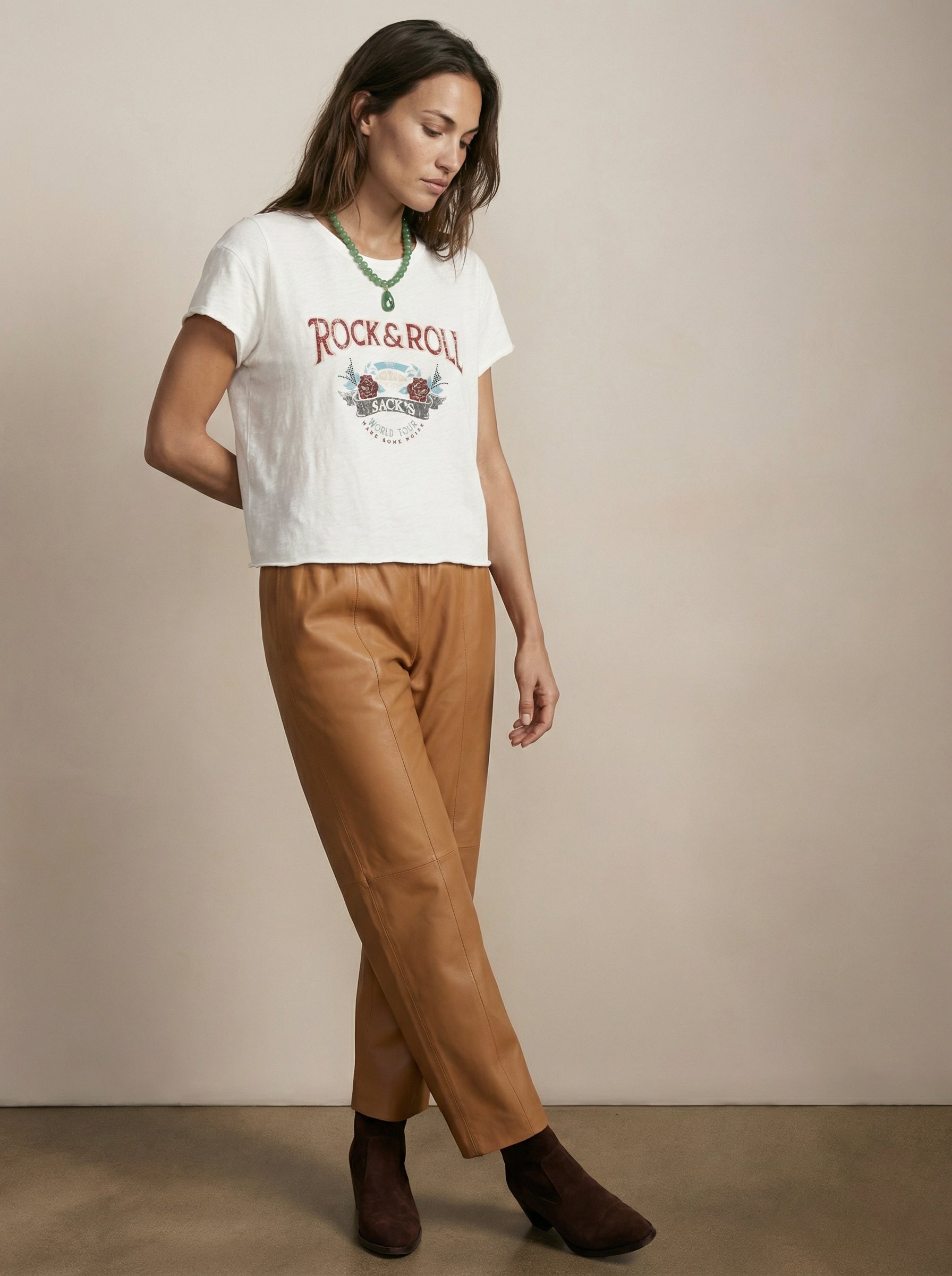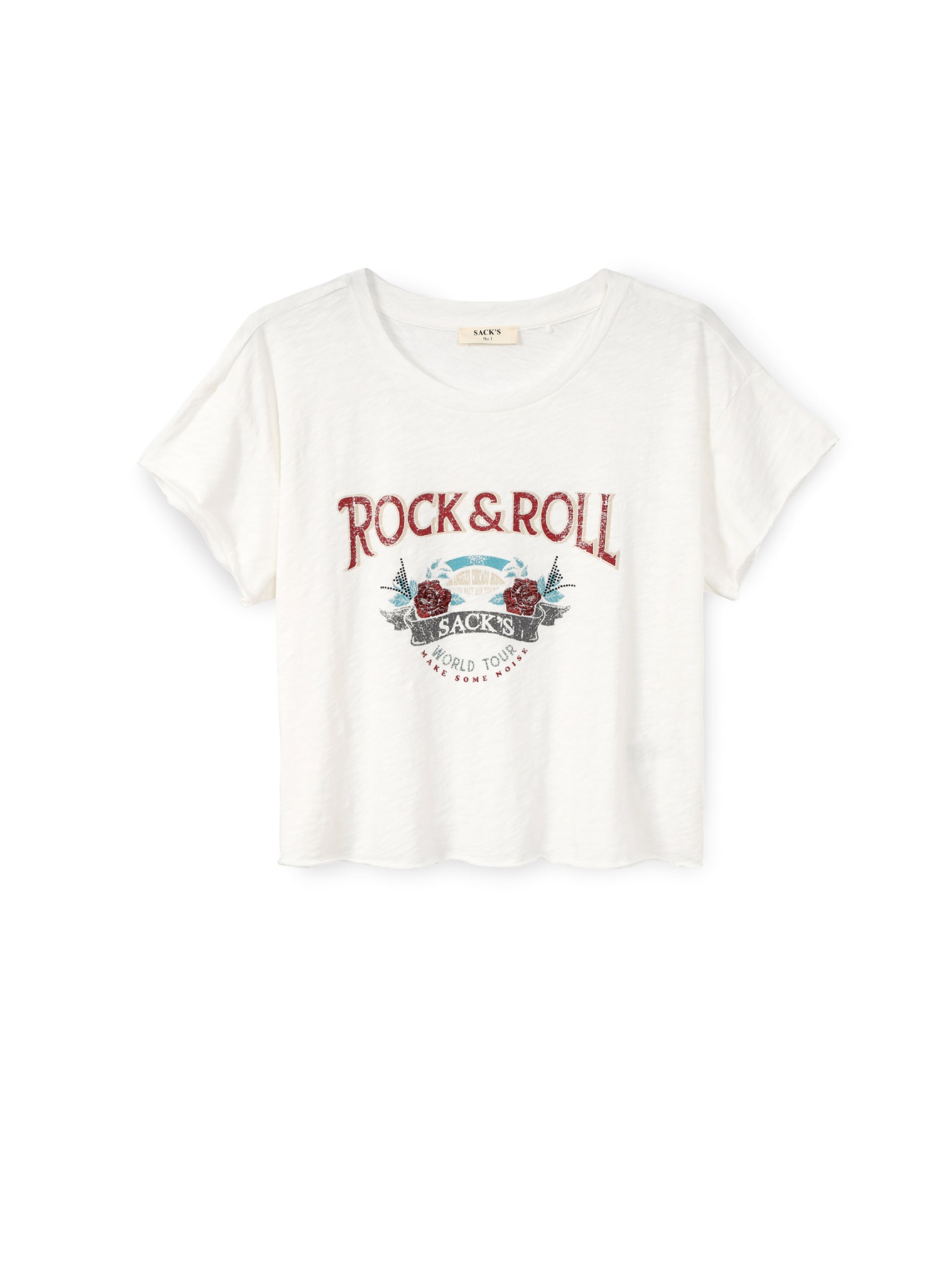 טי שירט קרופ גרפית עם וייב רוק וינטג’י. גזרה רחבה ומרובעת עם סיומת מכפלת גולמית, צווארון עגול קלאסי והדפס קדמי “Rock & Roll” בשילוב פרחים למראה של חולצת טור משומשת. מושלמת לשילוב עם ג’ינס בגזרה גבוהה, מכנסיים רפויים או לשכבות מתחת לז’קט. עשויה ג’רזי רך ונעים. זמינה בלבן ואפור.