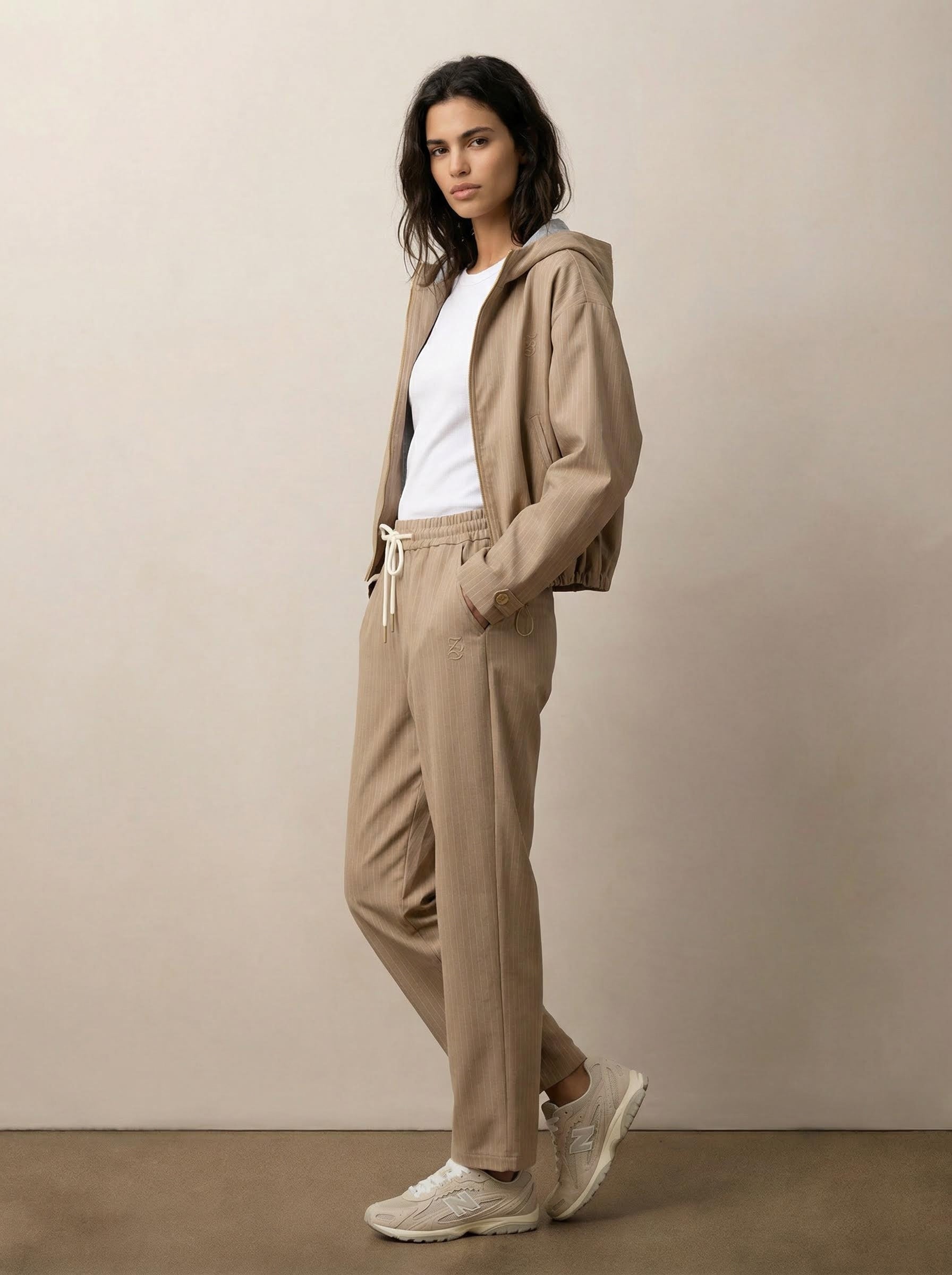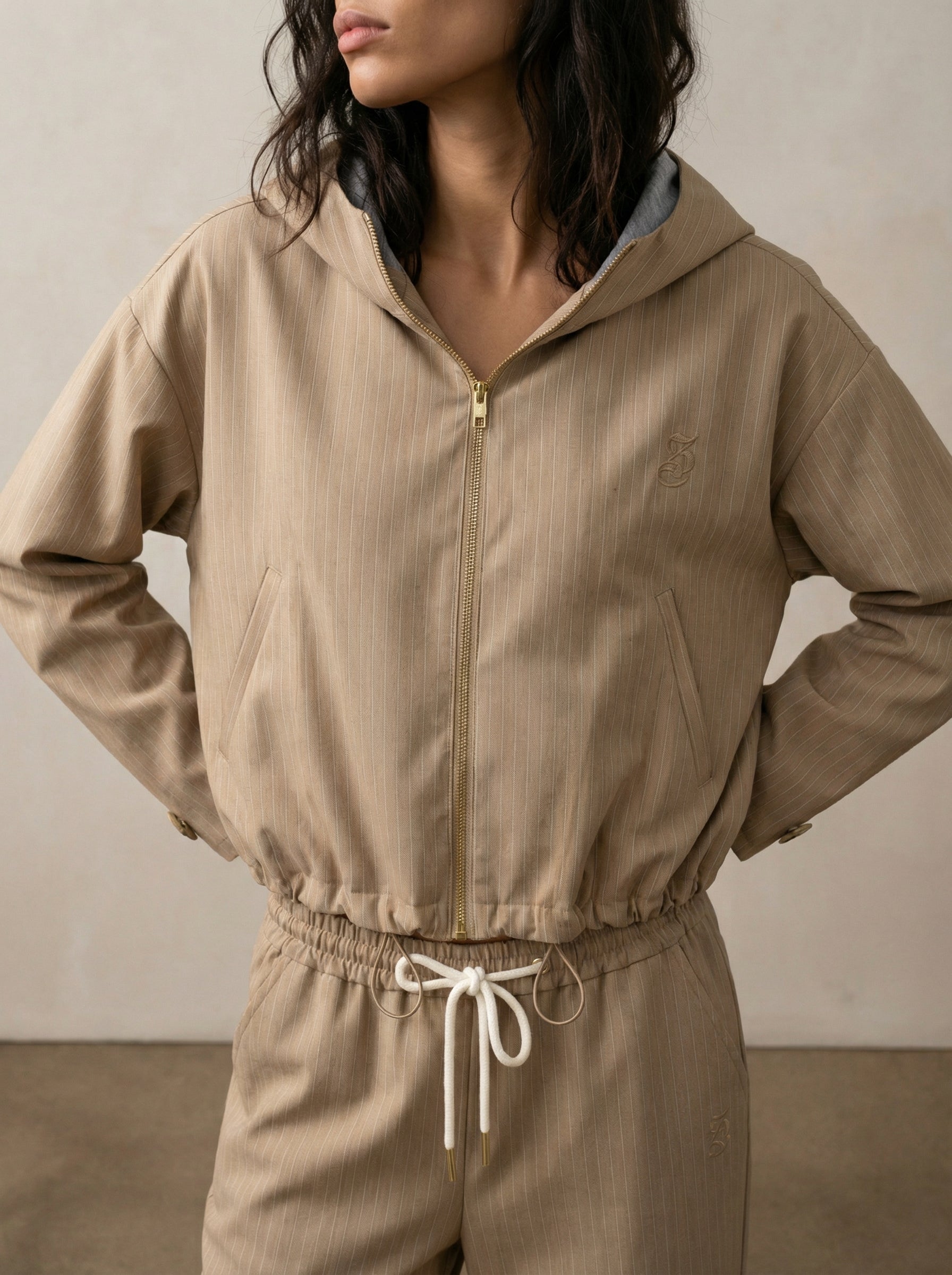 ז’קט קפוצ’ון בגזרת קרופ עם מראה ספורטיבי מודרני וגימור מוקפד. מעוצב בסילואט מובנה עם סגירת רוכסן קדמית מלאה וכיסים קדמיים פונקציונליים, המשלבים סטייל עם פרקטיות. הקפוצ’ון ופרטי התפר הנקיים מעניקים תחושה עכשווית, והגזרה הנינוחה מאפשרת שכבות בקלות. מושלם ללוק קז’ואלי משודרג, ומשתלב בצורה טבעית עם המכנסיים התואמים לסטייל מתואם מכף רגל ועד ראש. זמין בצבעים סנד וחום למראה טבעי ורב־שימושי.
