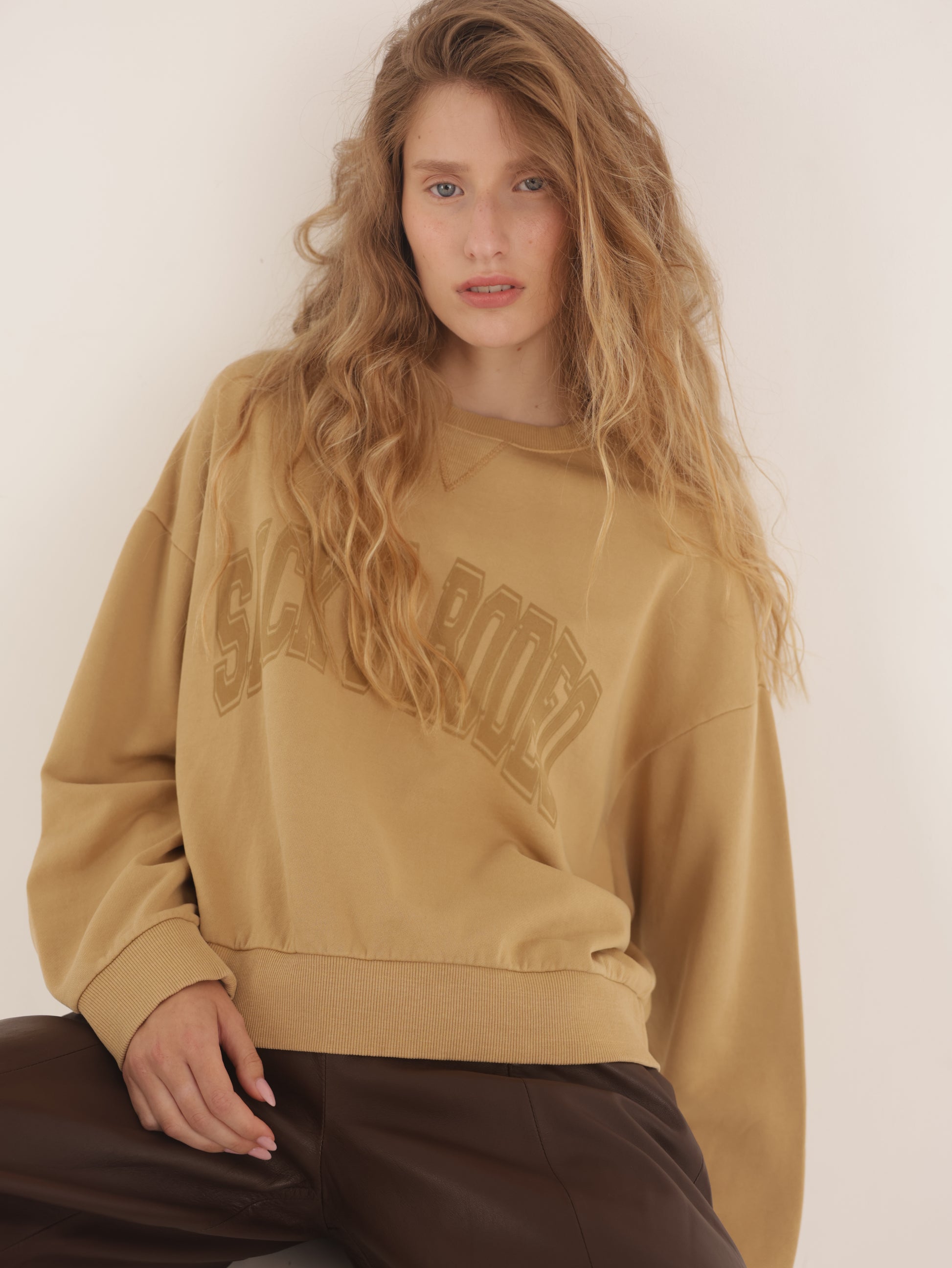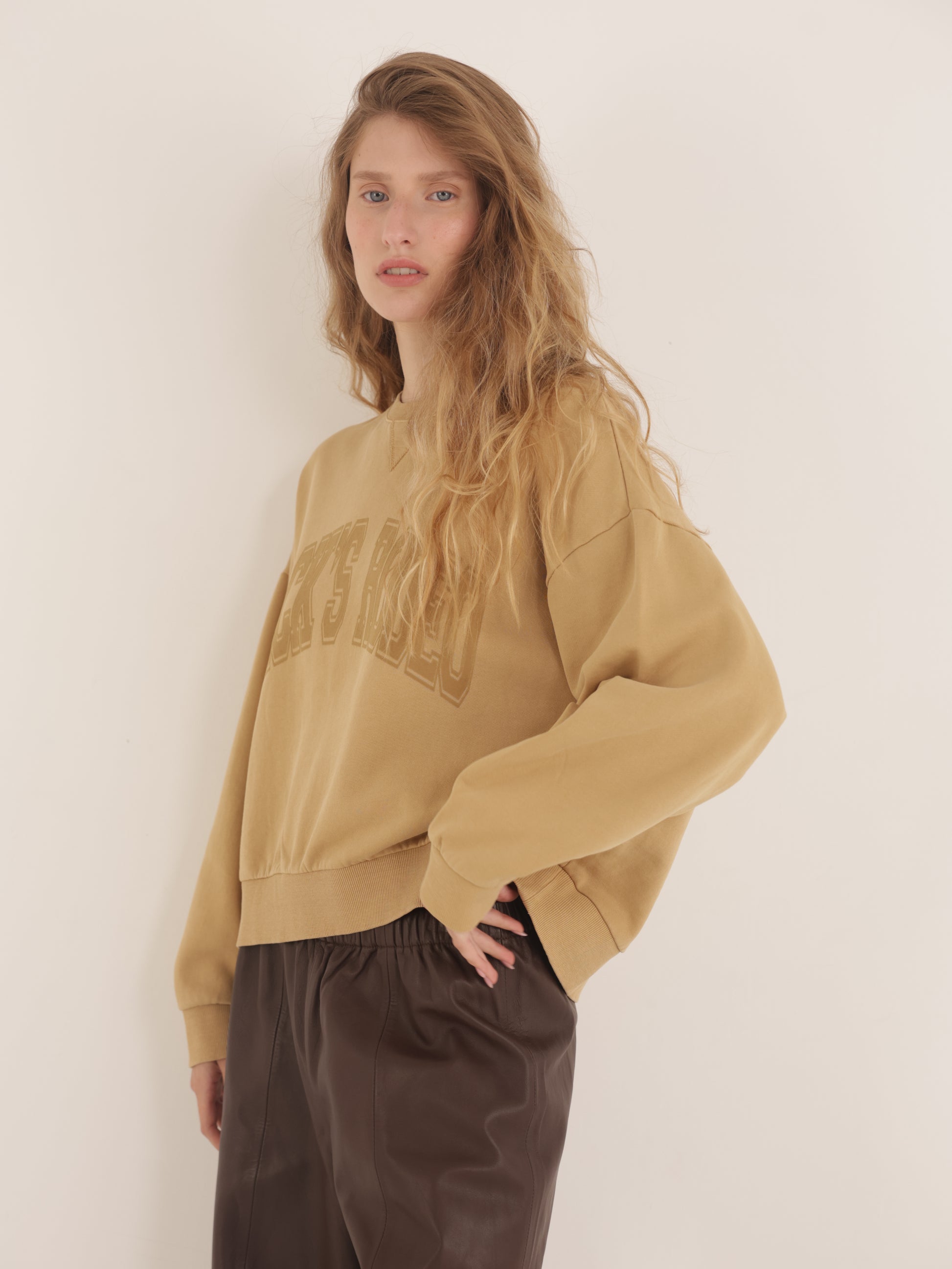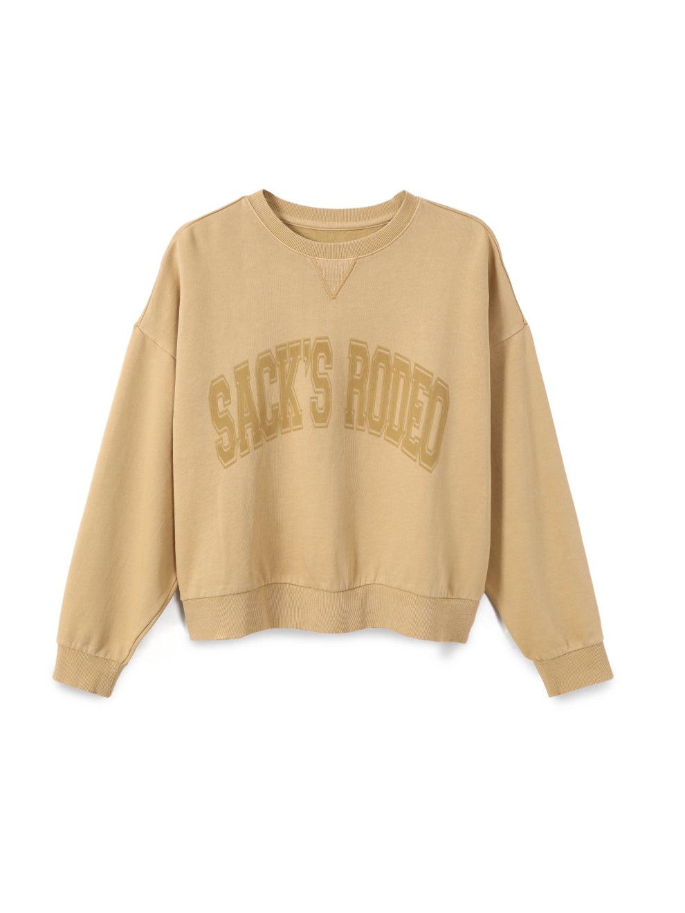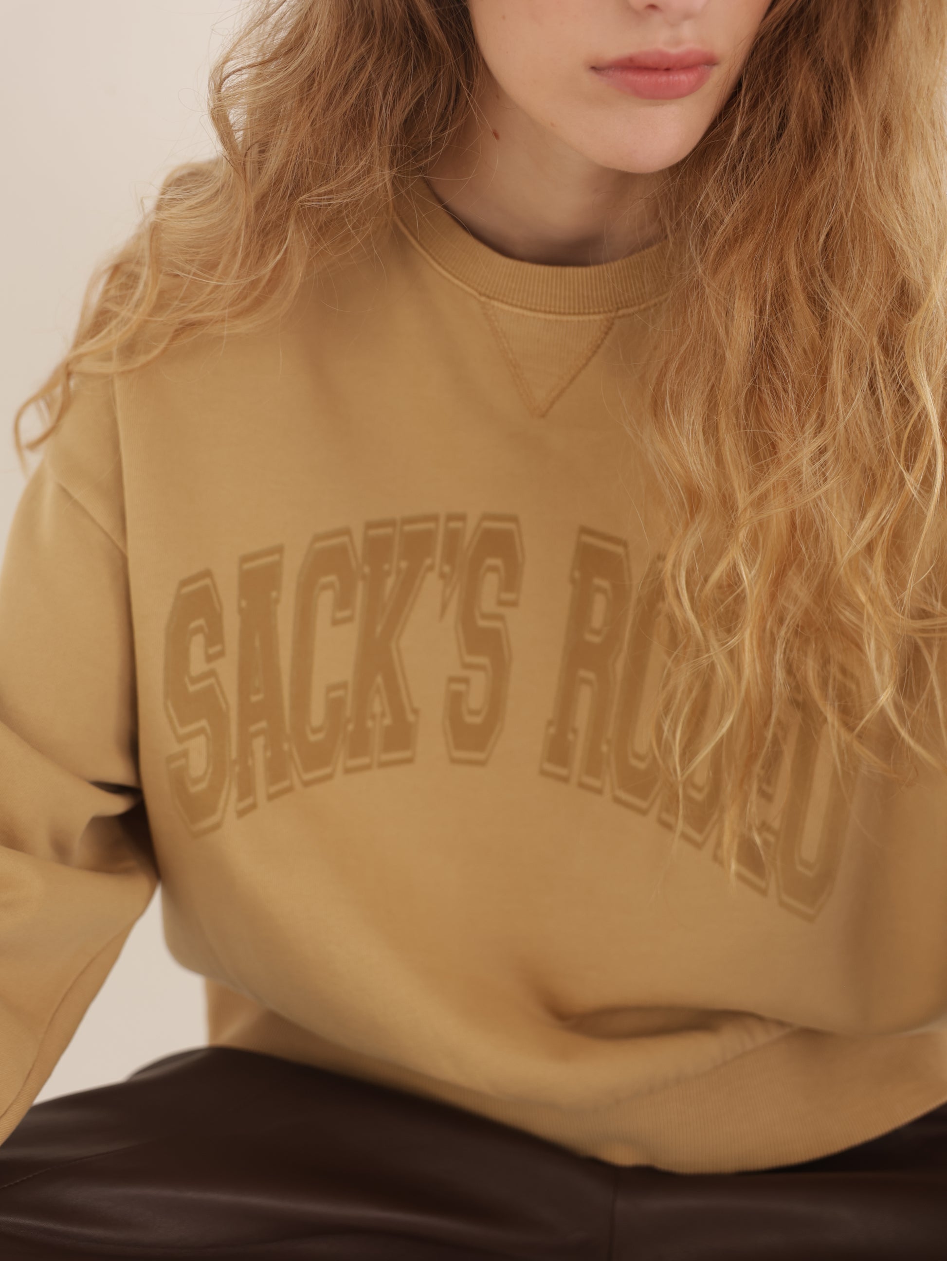 סווטשירט קצרה עם שרוולים ארוכים וצוואר עגול – סגירה קונטרסטית בצווארון, בסיום השרוולים ובחגורת המותן. החזית מודפסת ב-"SACK’S RODEO". זמינה בצבעים חול או פחם, במידות 0–4. שלבי עם מכנסיים רחבים למראה חמוד ונוח.