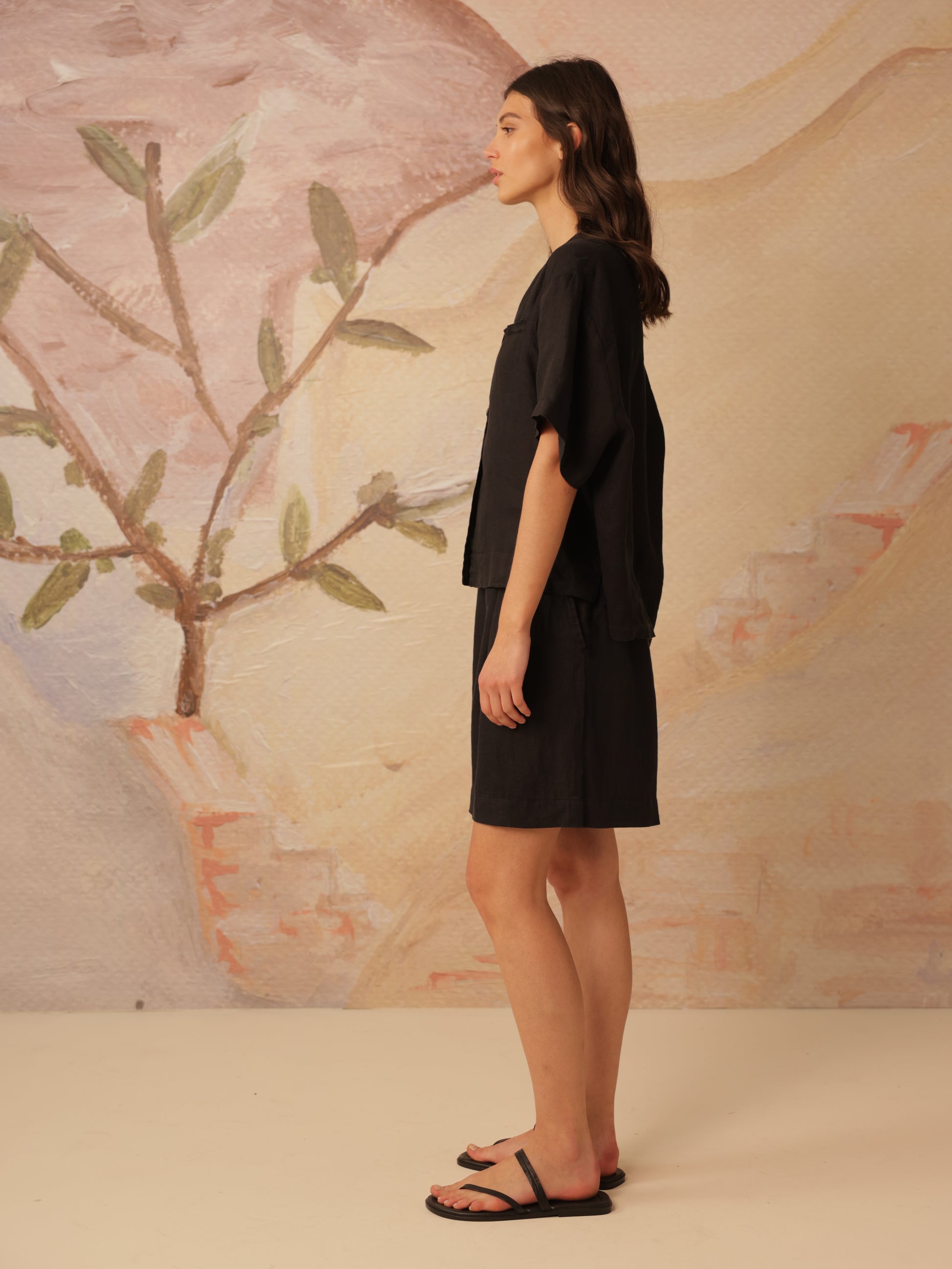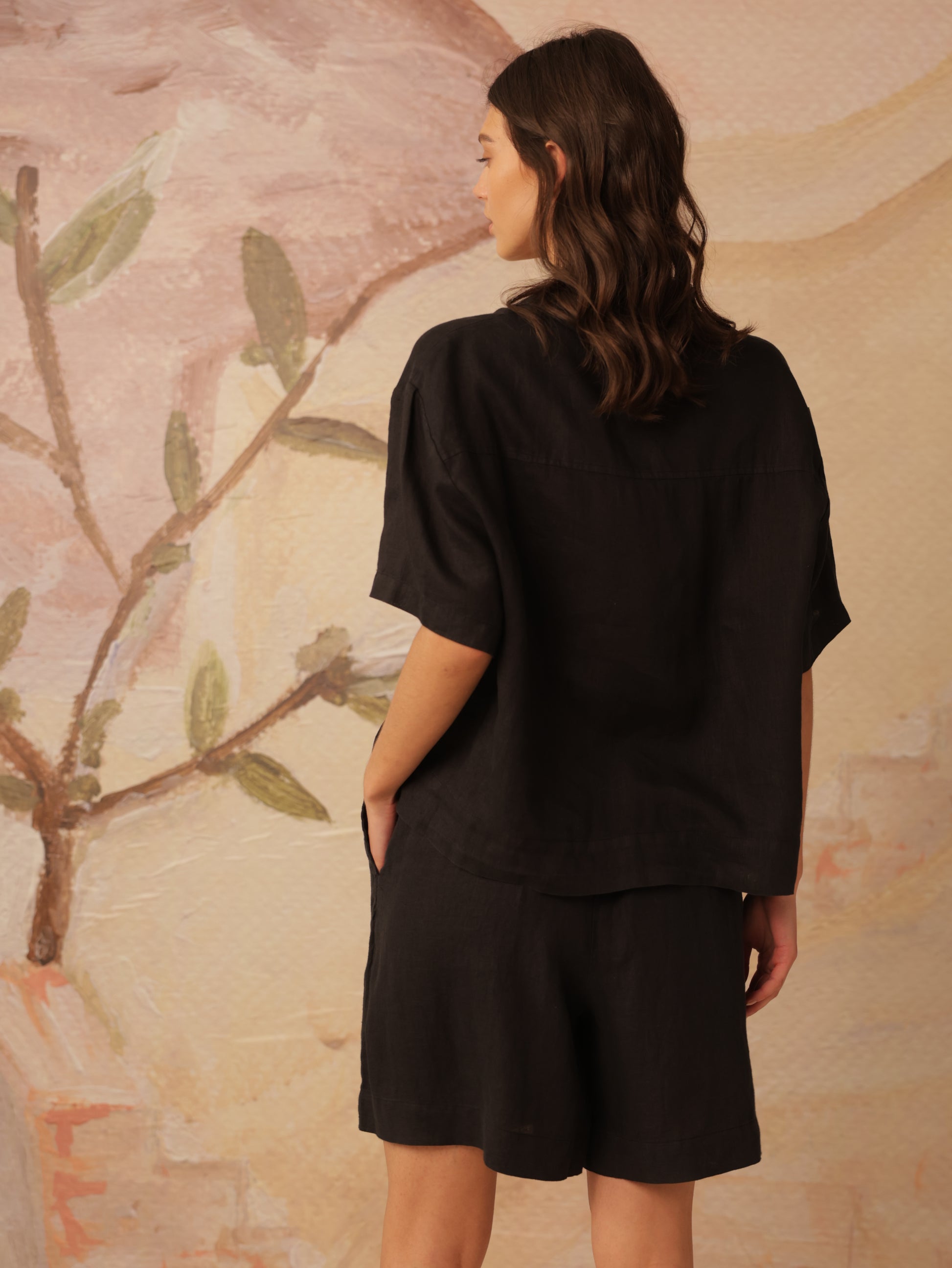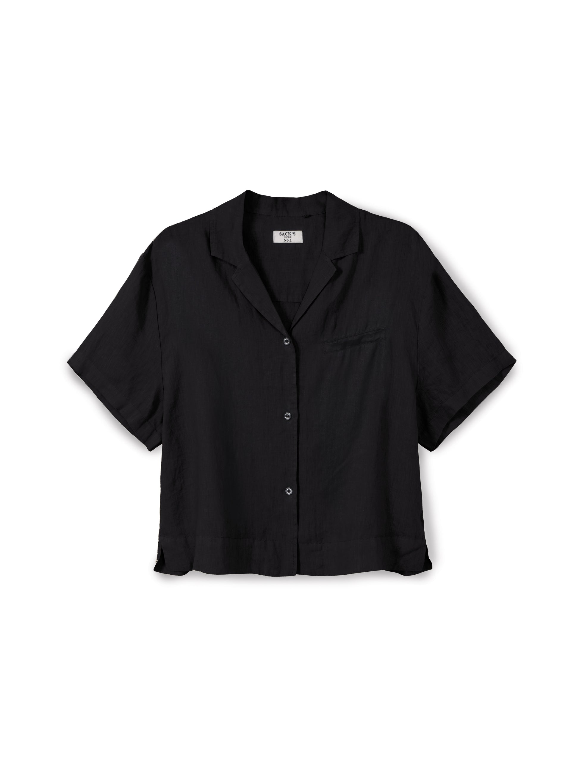 חולצת קרופ שרוולים קצרים 100% פשתן. סגירת כפתורים. החלק העליון קצר וקו המכפלת ישר לרוחבו. זמינה בצבעים לבן, שחור או אגוז. שלבי עם מכנסי הקז'ואל שלנו למראה סופר נוח וקל ללבישה.