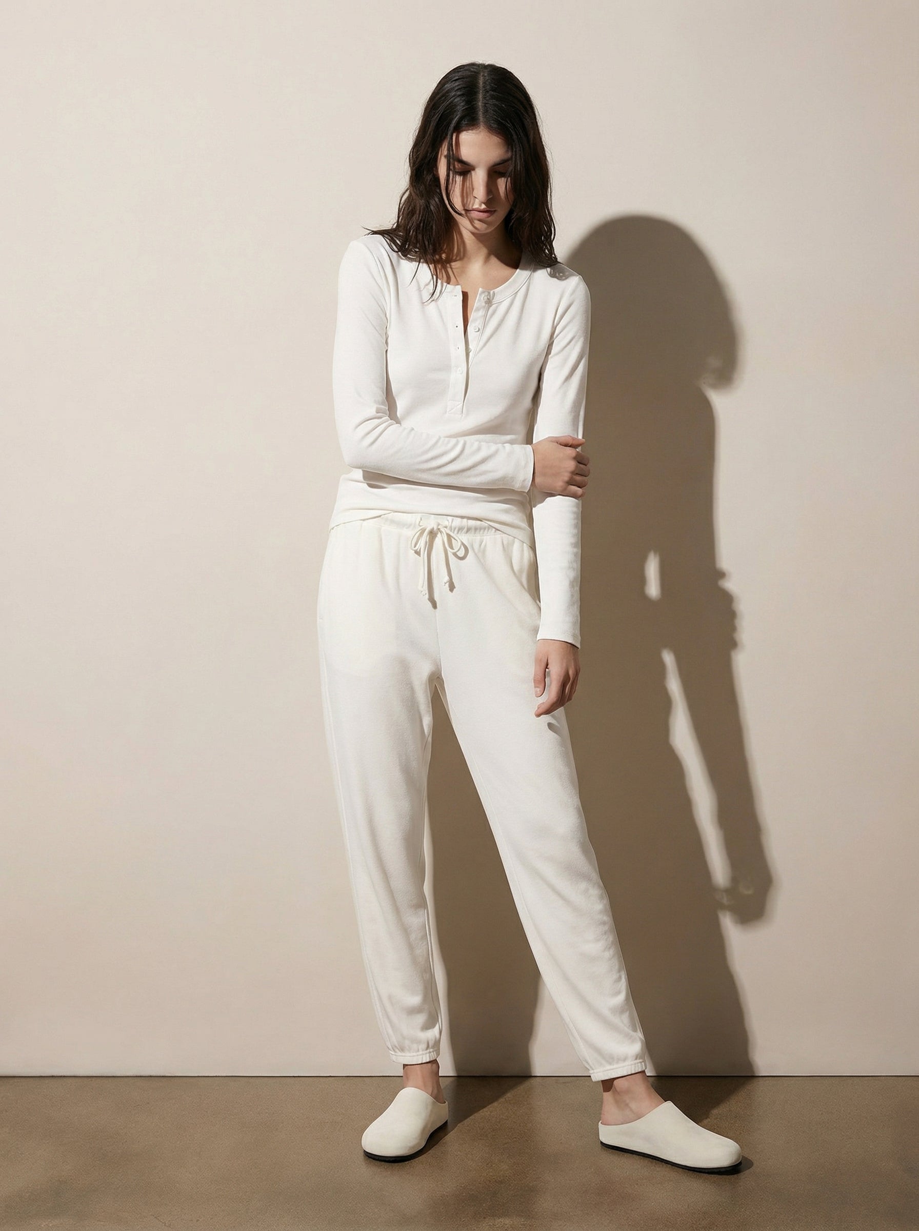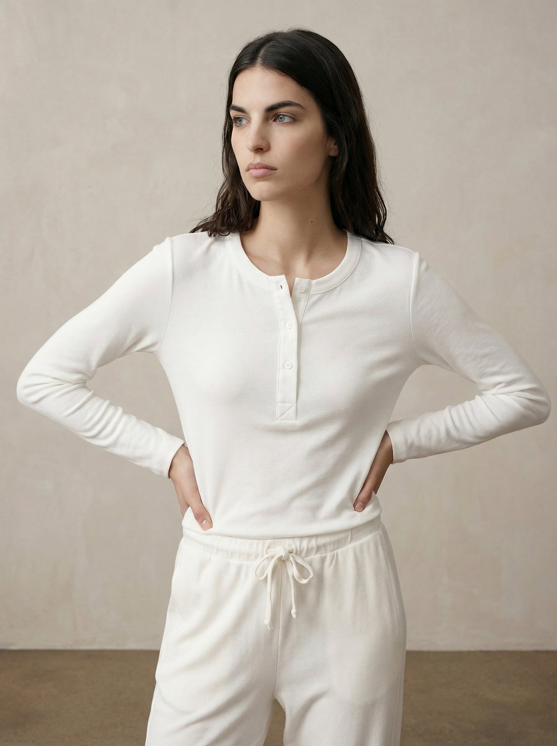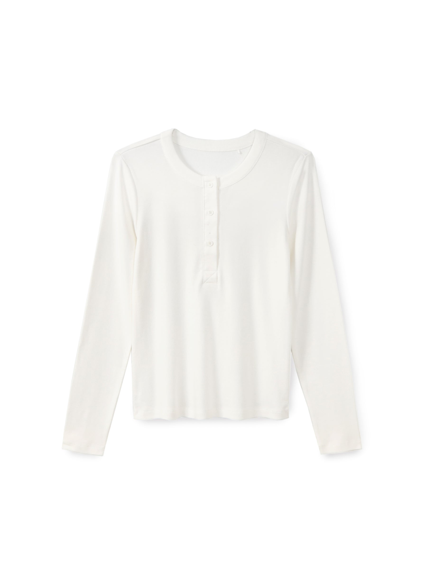 חולצת טי סלאב  עם שרוולים ארוכים בסגנון הנלי, פריט קלאסי עם מראה קז’ואלי מוקפד. צווארון עגול עם פתח כפתורים קדמי מוסיף עניין עדין. גזרה נינוחה ונוחה ללבישה יומיומית, מתאימה לשכבות או כלוק בפני עצמו בכל עונה. זמינה בלבן מלא, פחם ו־האנטר.