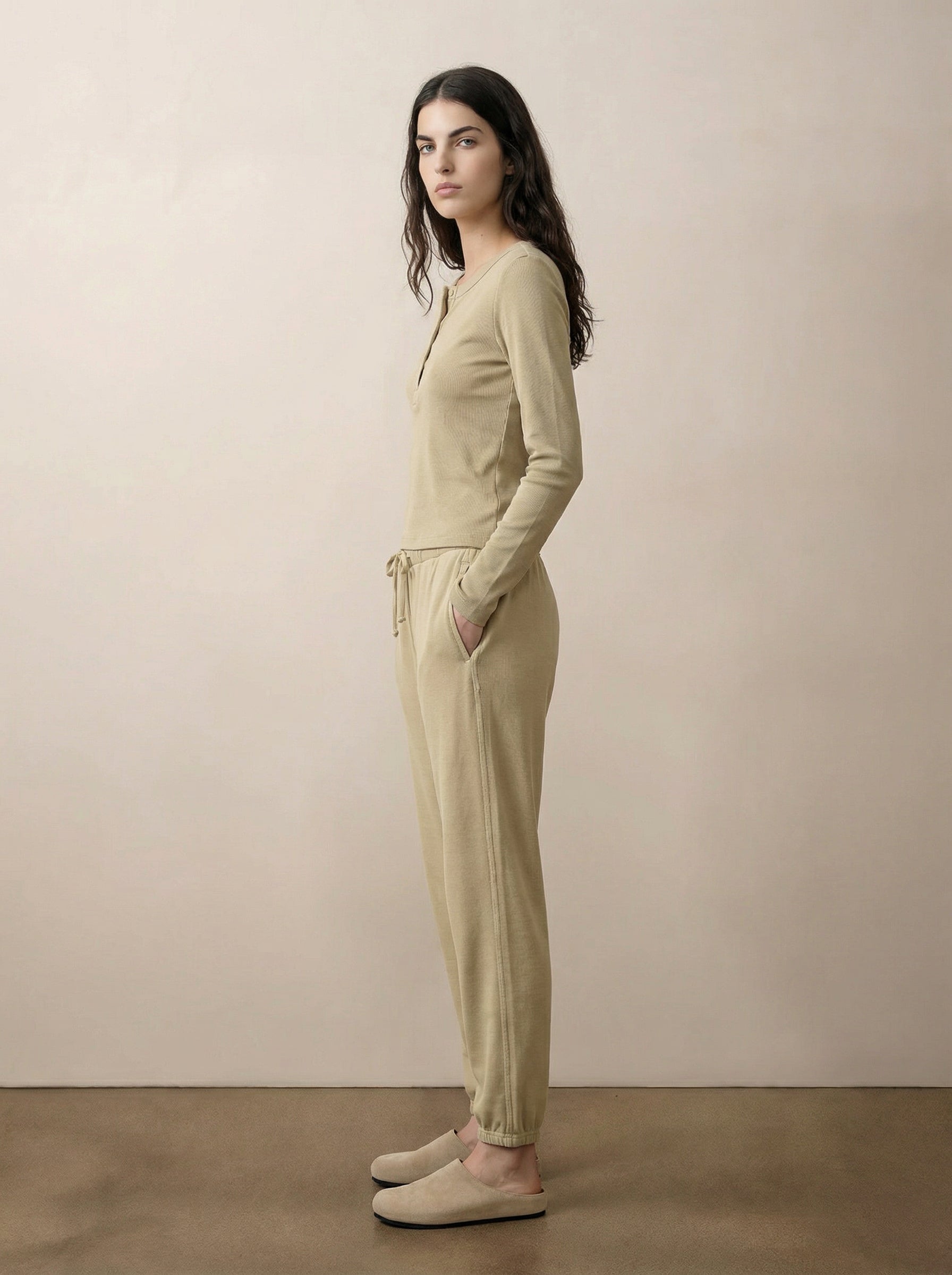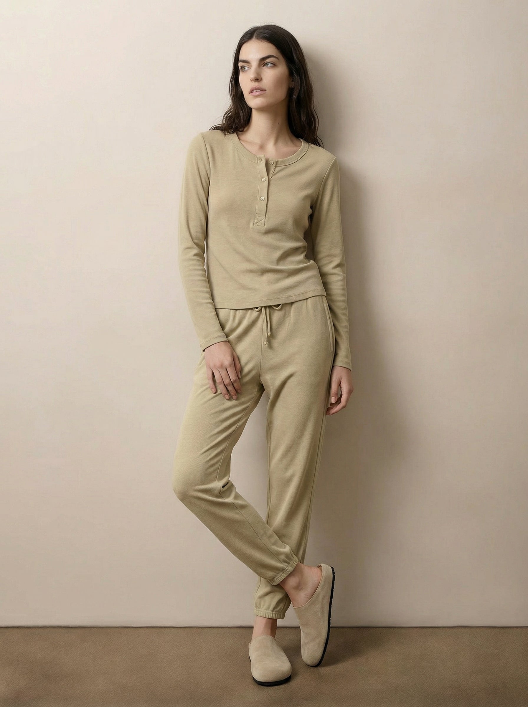 חולצת טי סלאב עם שרוולים ארוכים בסגנון הנלי, פריט קלאסי עם מראה קז’ואלי מוקפד. צווארון עגול עם פתח כפתורים קדמי מוסיף עניין עדין. גזרה נינוחה ונוחה ללבישה יומיומית, מתאימה לשכבות או כלוק בפני עצמו בכל עונה. זמינה בלבן מלא, פחם ו־האנטר.