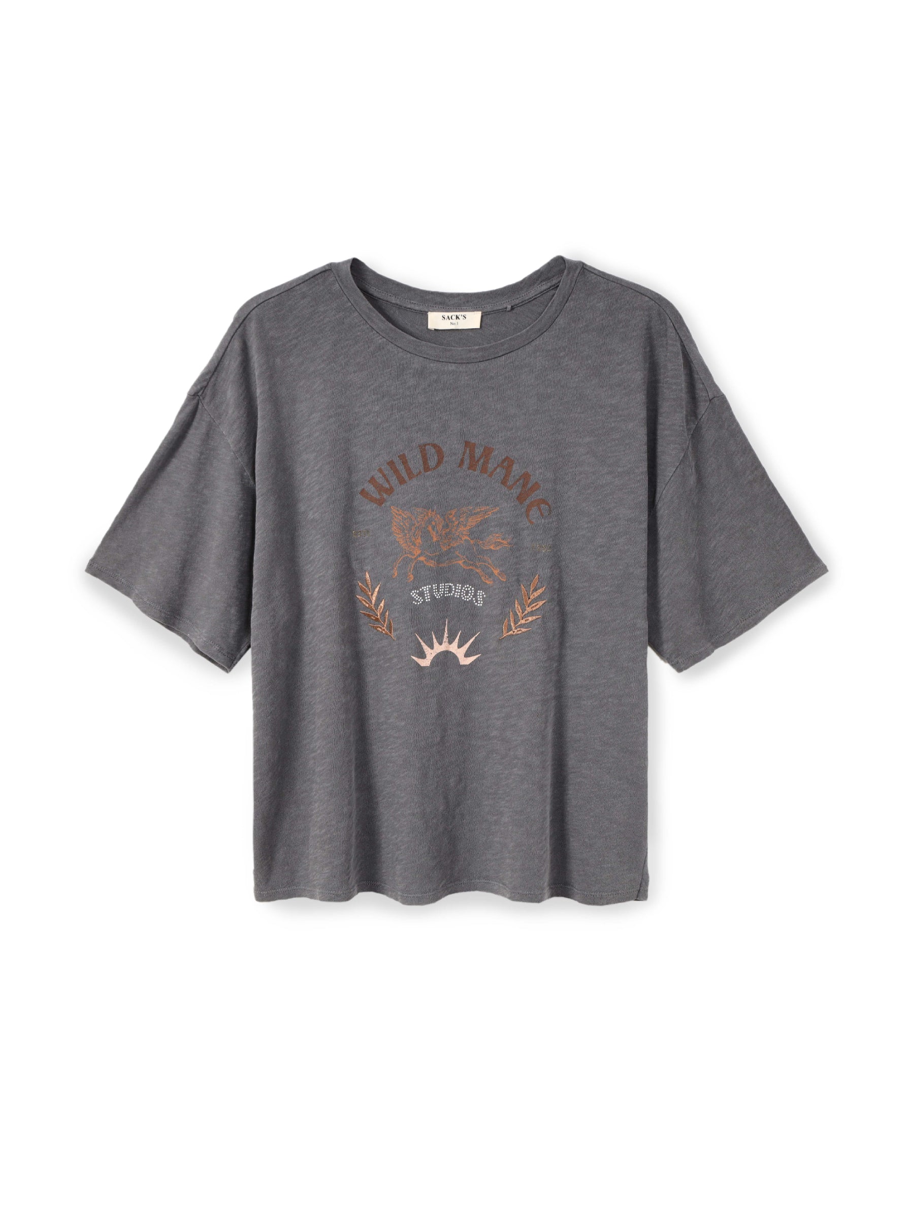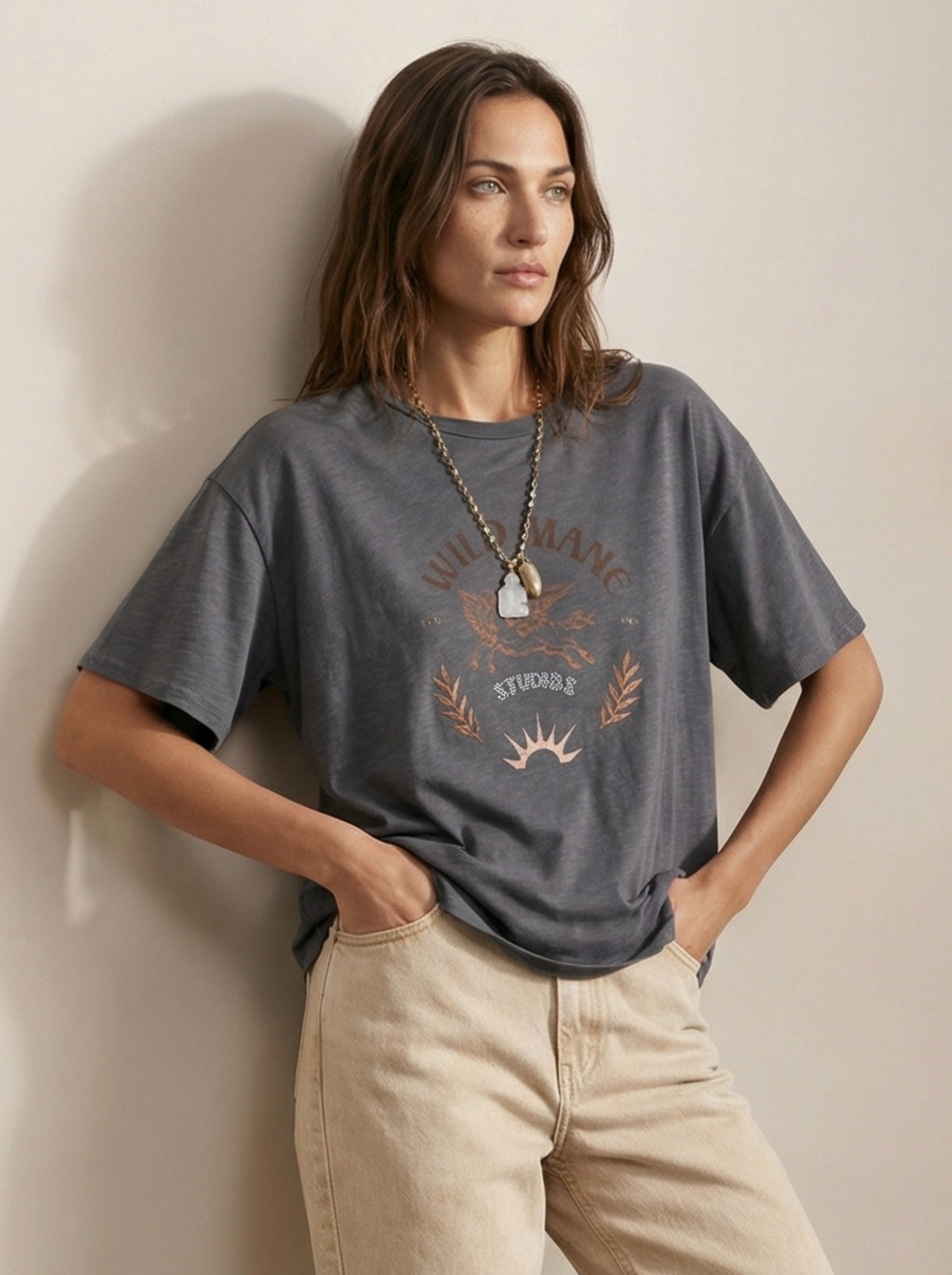טי שירט ג’רזי מודפסת עם גרפיקה, בגזרה נינוחה וסטייטמנט וינטג’י. צווארון עגול קלאסי ושרוולים קצרים, עם הדפס קדמי “Wild Mane Studios” שמוסיף אופי ומראה משומש קליל. משתלבת בקלות עם ג’ינס, מכנסיים מחויטים או כשכבה מתחת לז’קט. עשויה ג’רזי רך לנוחות לאורך כל היום. זמינה בלבן ואפור.