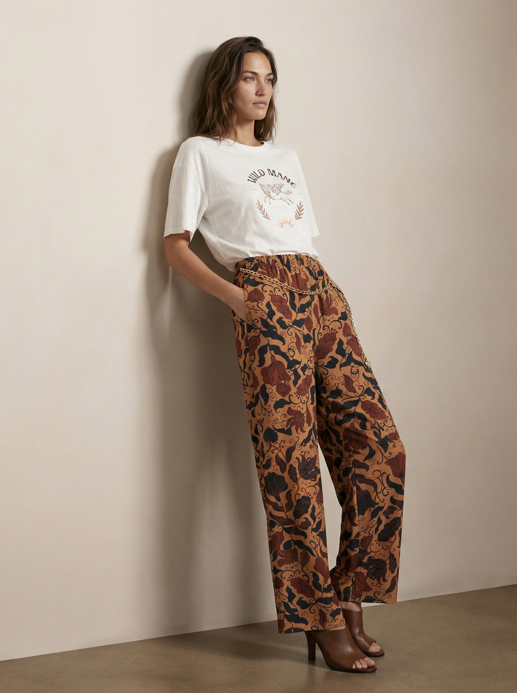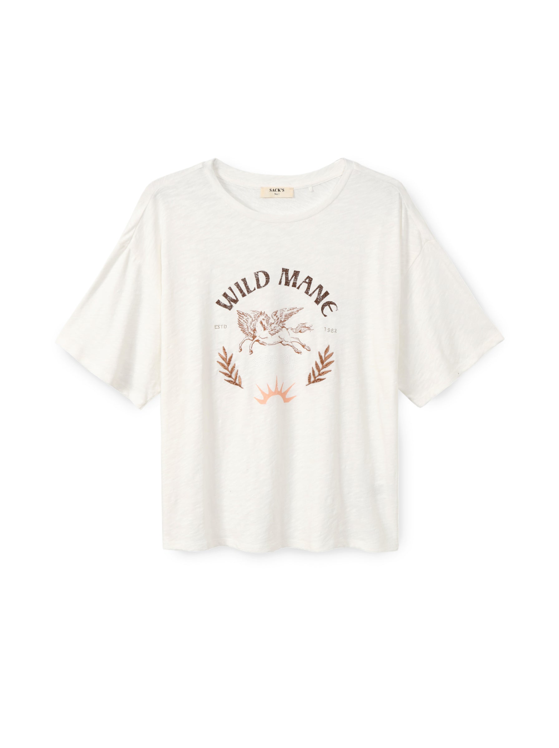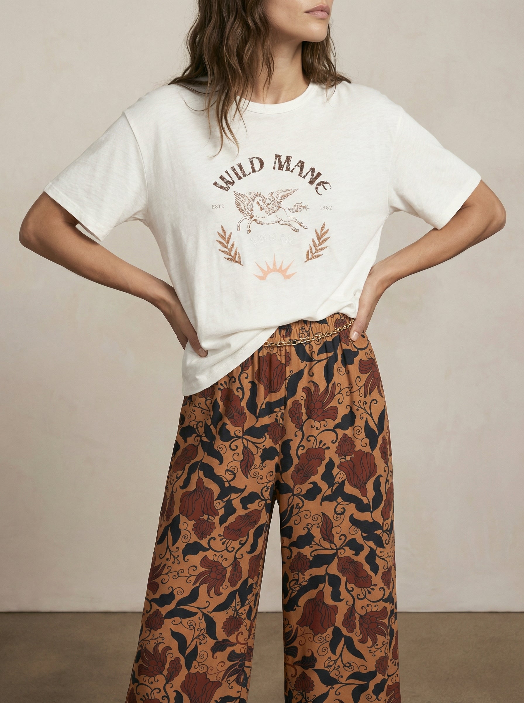 טי שירט ג’רזי מודפסת עם גרפיקה, בגזרה נינוחה וסטייטמנט וינטג’י. צווארון עגול קלאסי ושרוולים קצרים, עם הדפס קדמי “Wild Mane Studios” שמוסיף אופי ומראה משומש קליל. משתלבת בקלות עם ג’ינס, מכנסיים מחויטים או כשכבה מתחת לז’קט. עשויה ג’רזי רך לנוחות לאורך כל היום. זמינה בלבן ואפור.