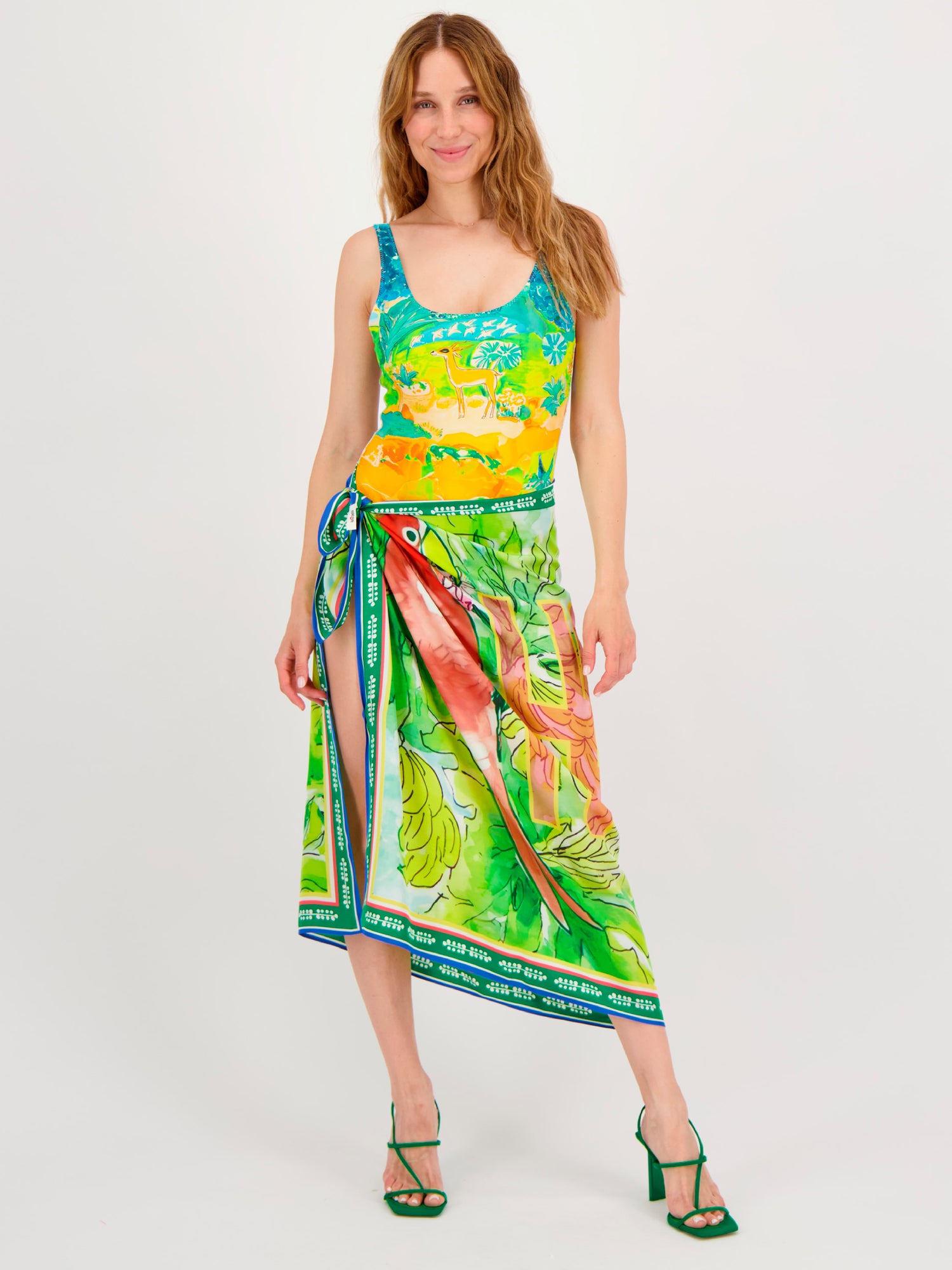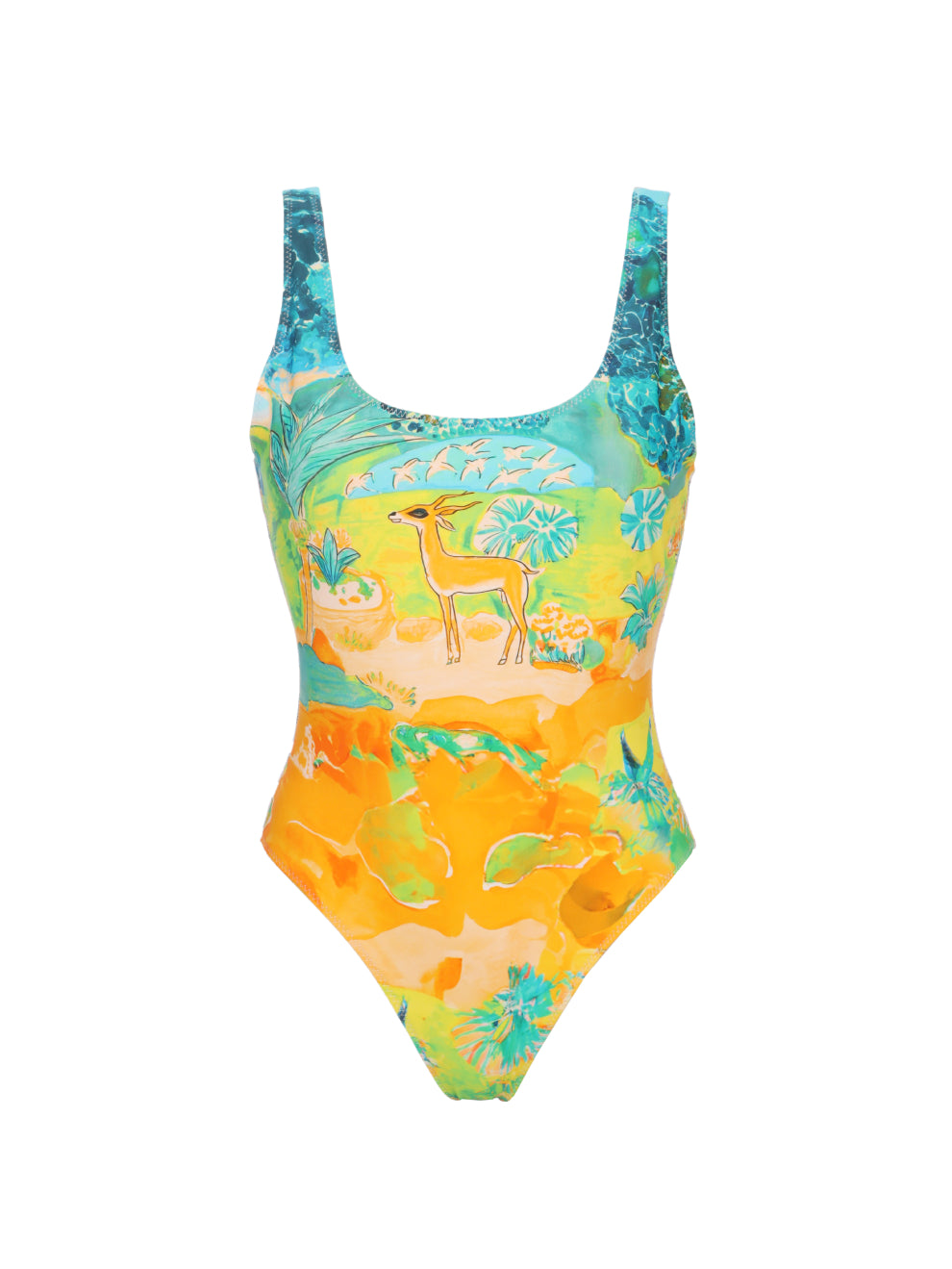 בגד ים קלאסי בדפוס בהשראת היער. צווארון עגול, רצועות סטנדרטיות. ניתן לשלב עם צעיף ריבר למראה אומנותי וקייצי.