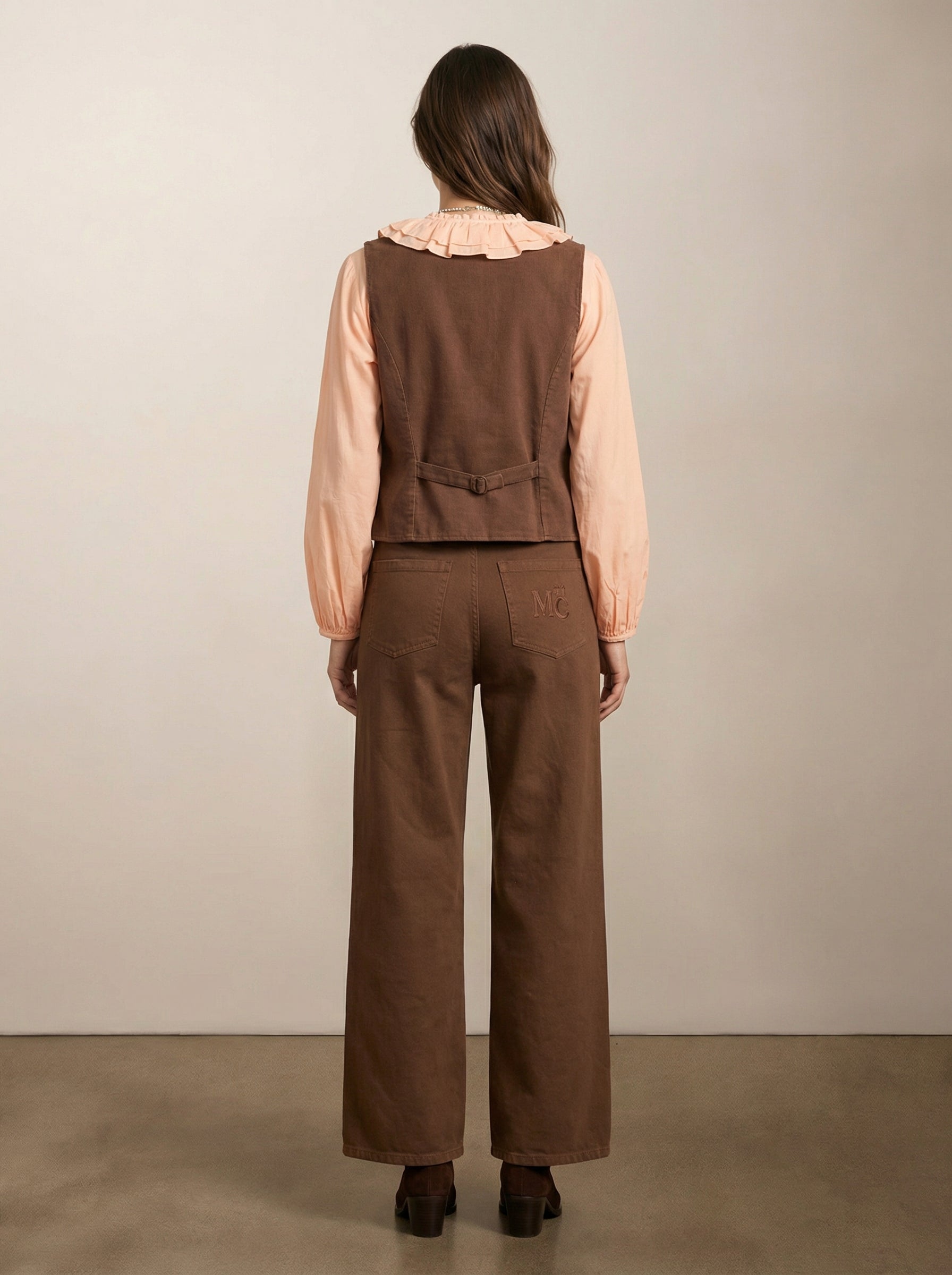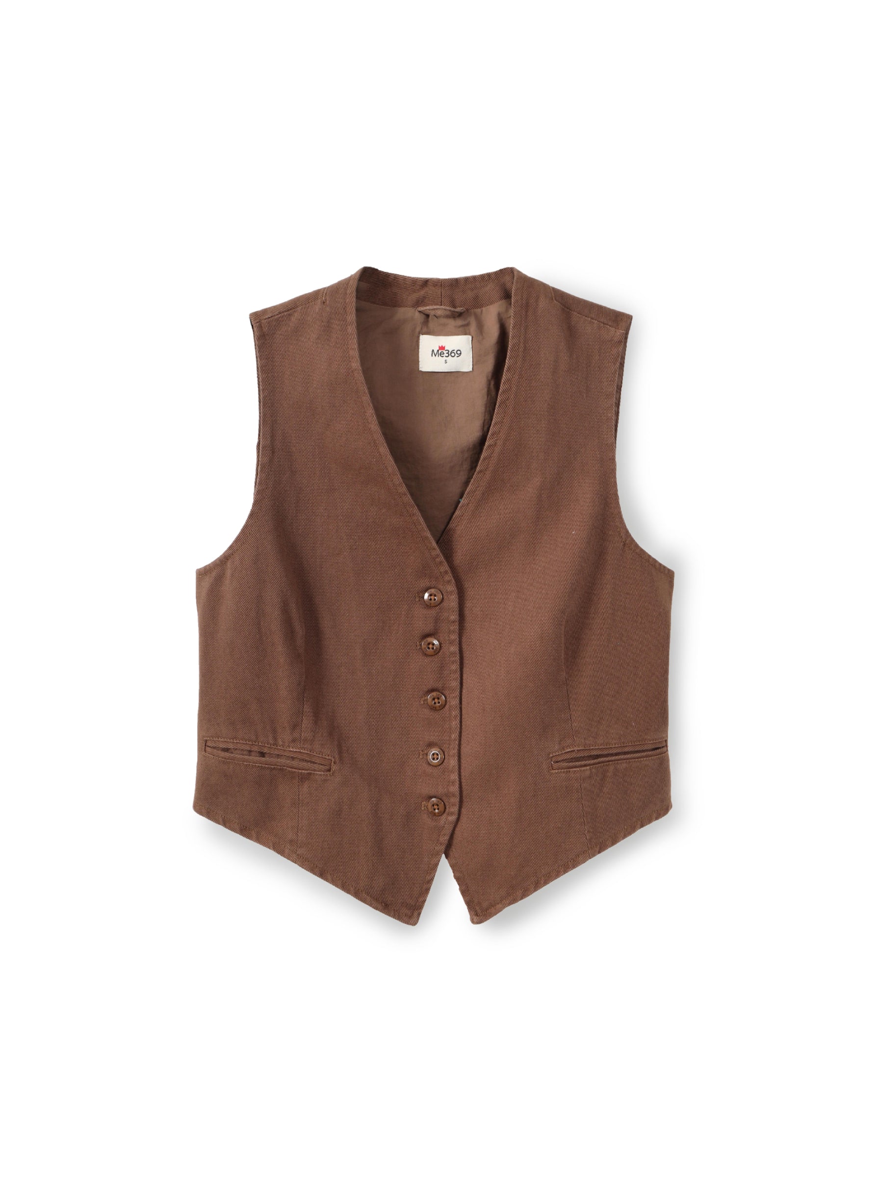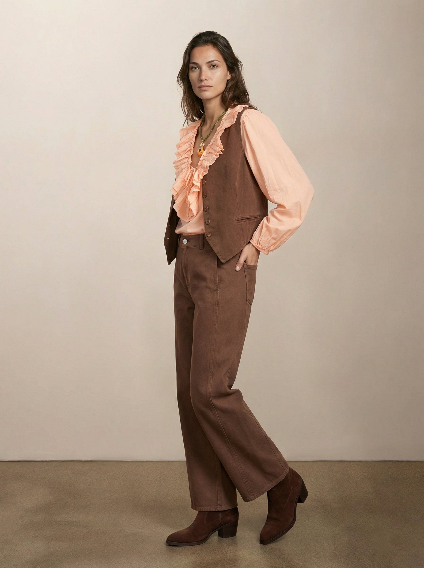 וסט כותנה מחויט בעיצוב מודרני ובעל נוכחות. מחשוף וי מחמיא, סגירת כפתורים קדמית וכיסי פס נקיים יוצרים סילואט מובנה אך קל ללבישה. גב הווסט כולל פרטי תפירה עדינים המוסיפים עומק ועניין. אידיאלי לשילוב מעל טי שירט, חולצה או שמלה, ומשדרג כל לוק בקלות. זמין בנטורל וחום.