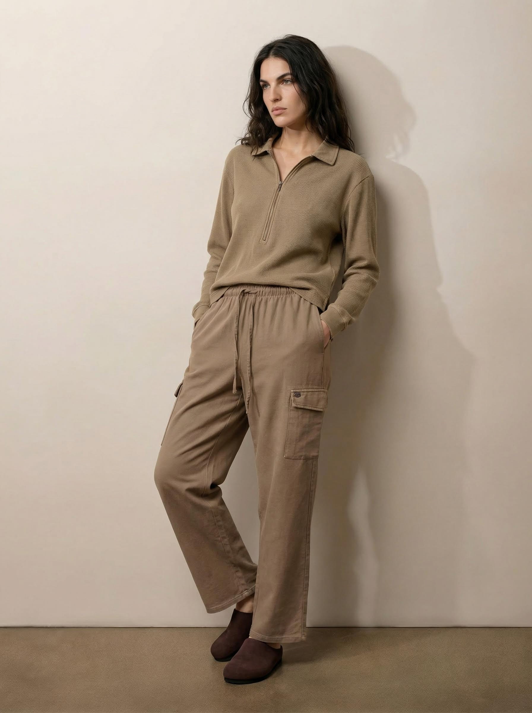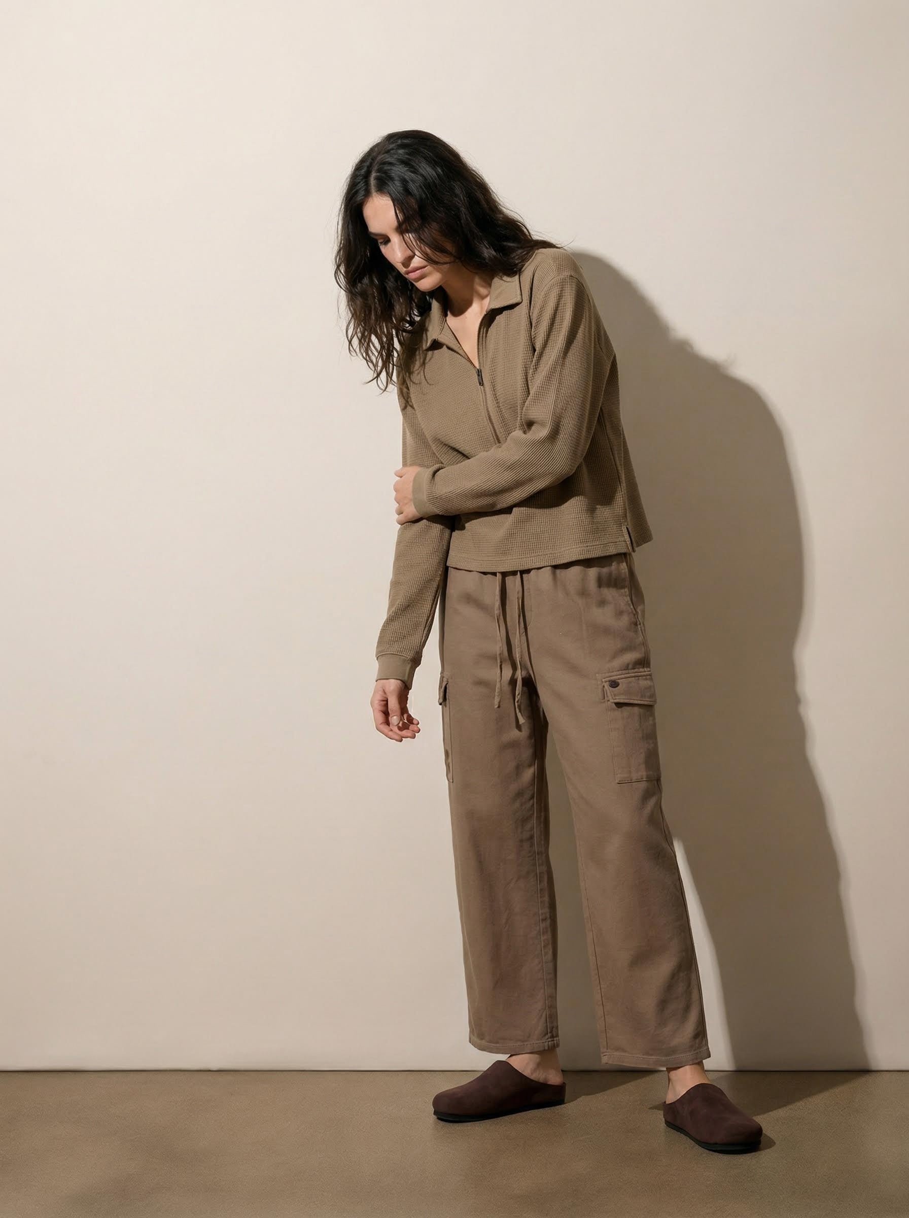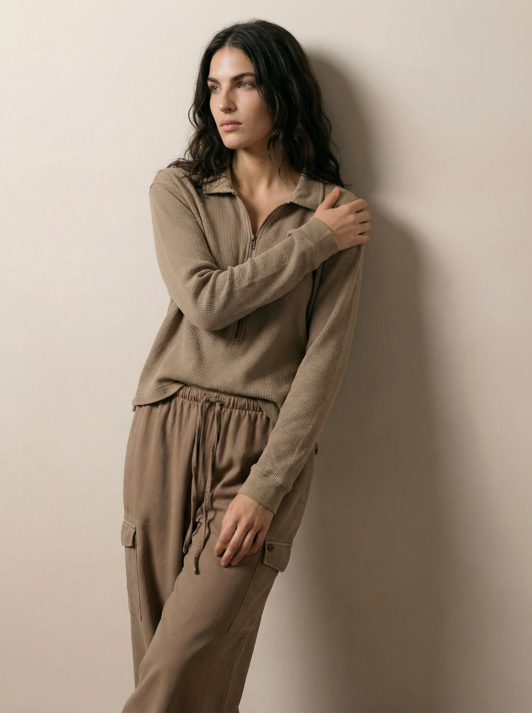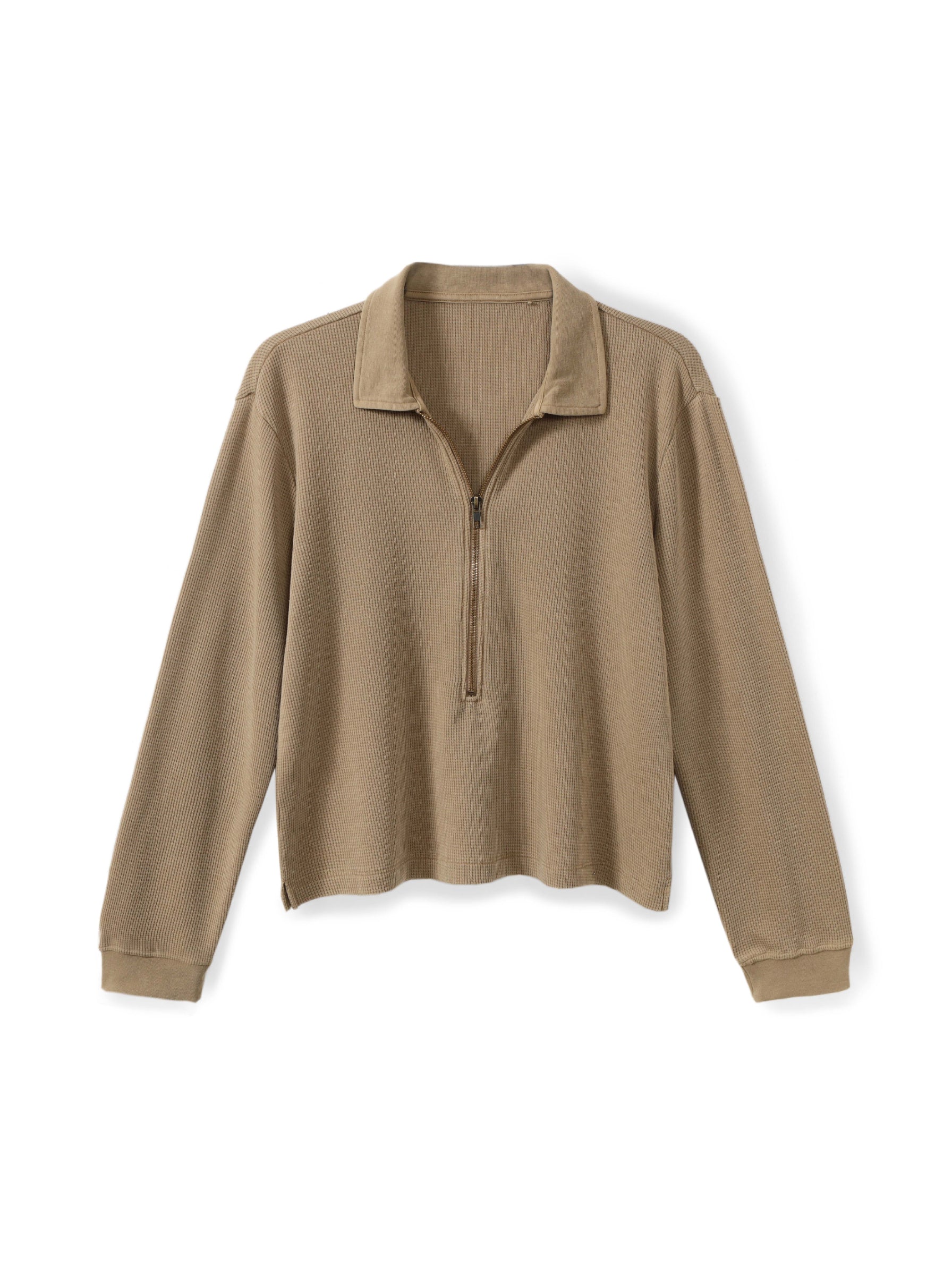 חולצת וופל ארוכת שרוולים עם מראה קז’ואלי מוקפד. צווארון קלאסי ופתח חצי רוכסן עם רוכסן בגוון זהב מט מוסיפים טאץ’ אלגנטי ועדין. בד הוופל הרך מעניק חמימות ונוחות לצד מראה נקי. קלה לשילוב ביום־יום או לשכבות רגועות. זמינה בלבן מלא, האנטר ואגוז.