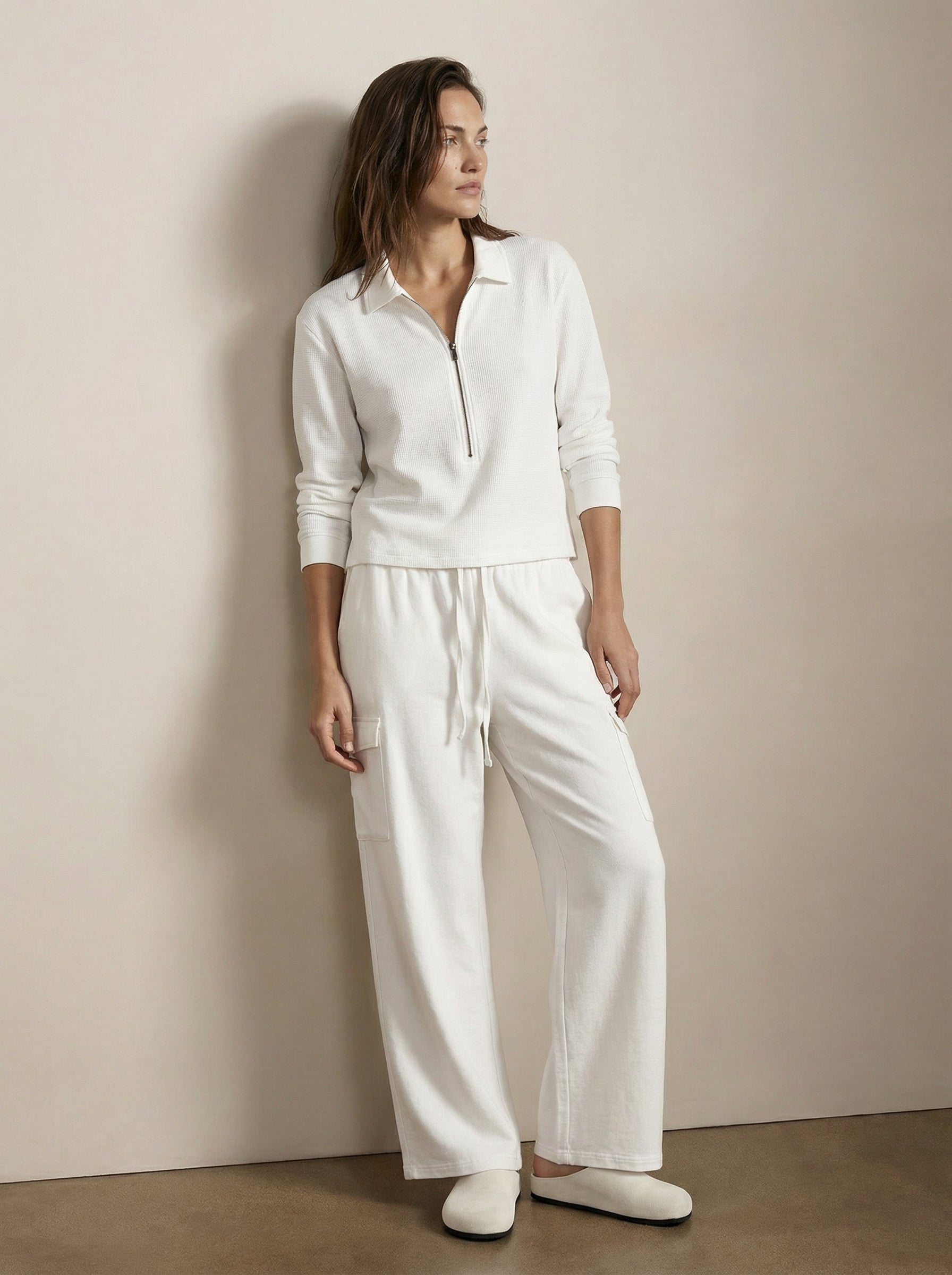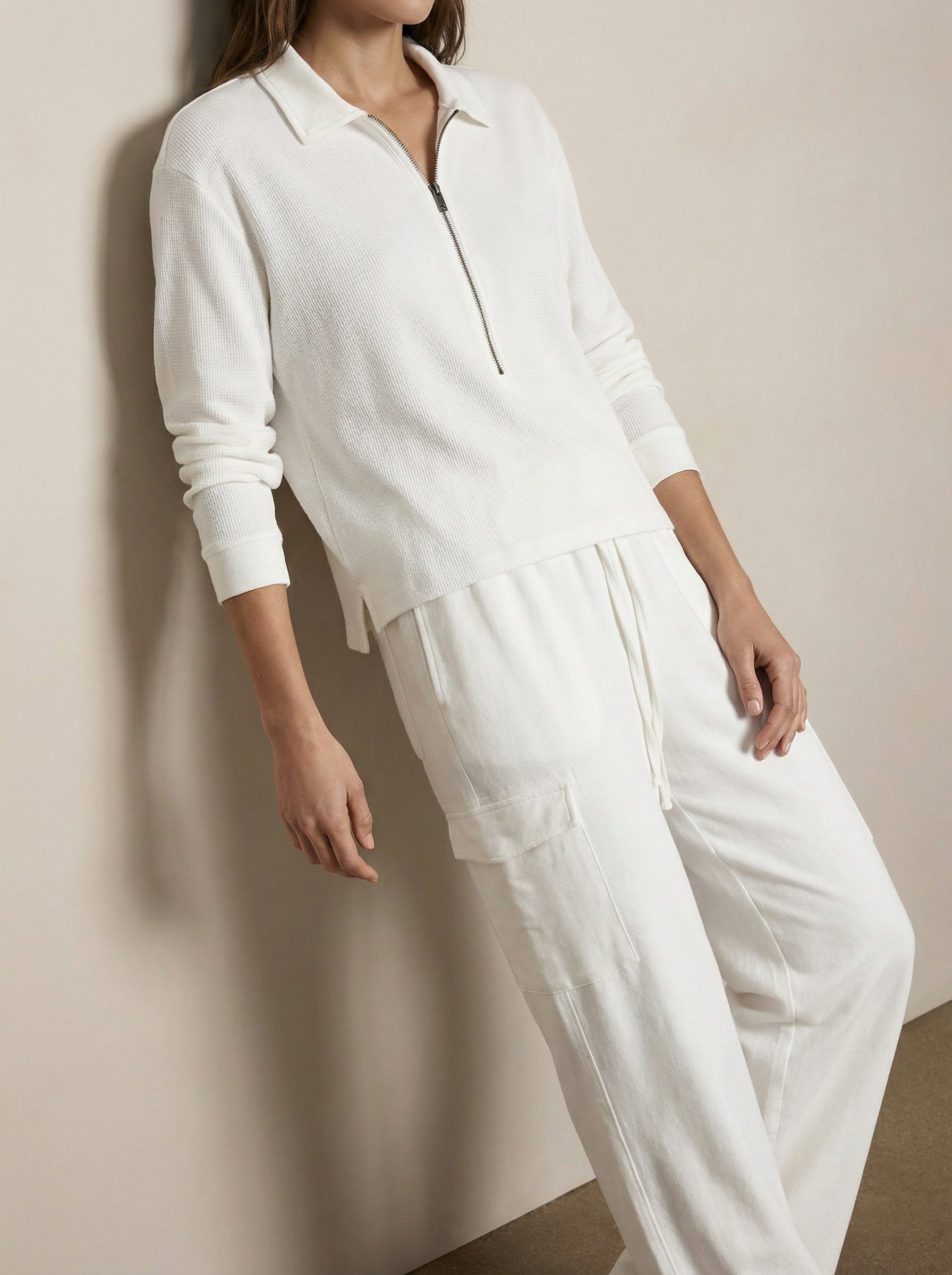 חולצת וופל ארוכת שרוולים עם מראה קז’ואלי מוקפד. צווארון קלאסי ופתח חצי רוכסן עם רוכסן בגוון זהב מט מוסיפים טאץ’ אלגנטי ועדין. בד הוופל הרך מעניק חמימות ונוחות לצד מראה נקי. קלה לשילוב ביום־יום או לשכבות רגועות. זמינה בלבן מלא, האנטר ואגוז.