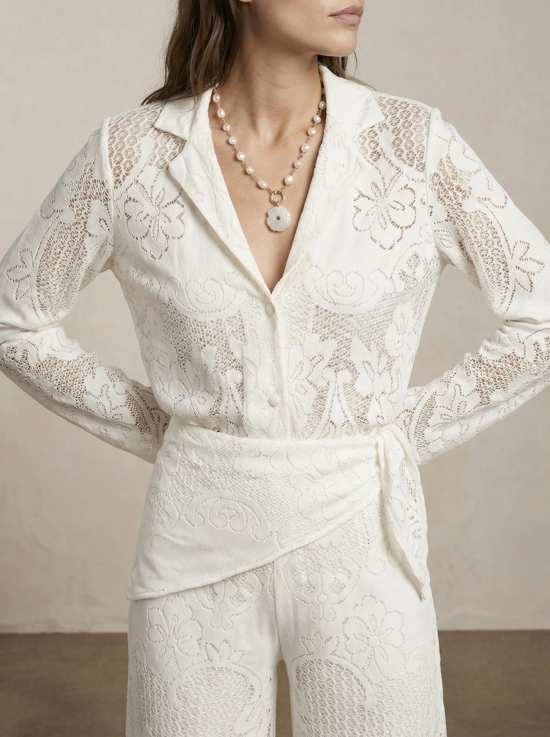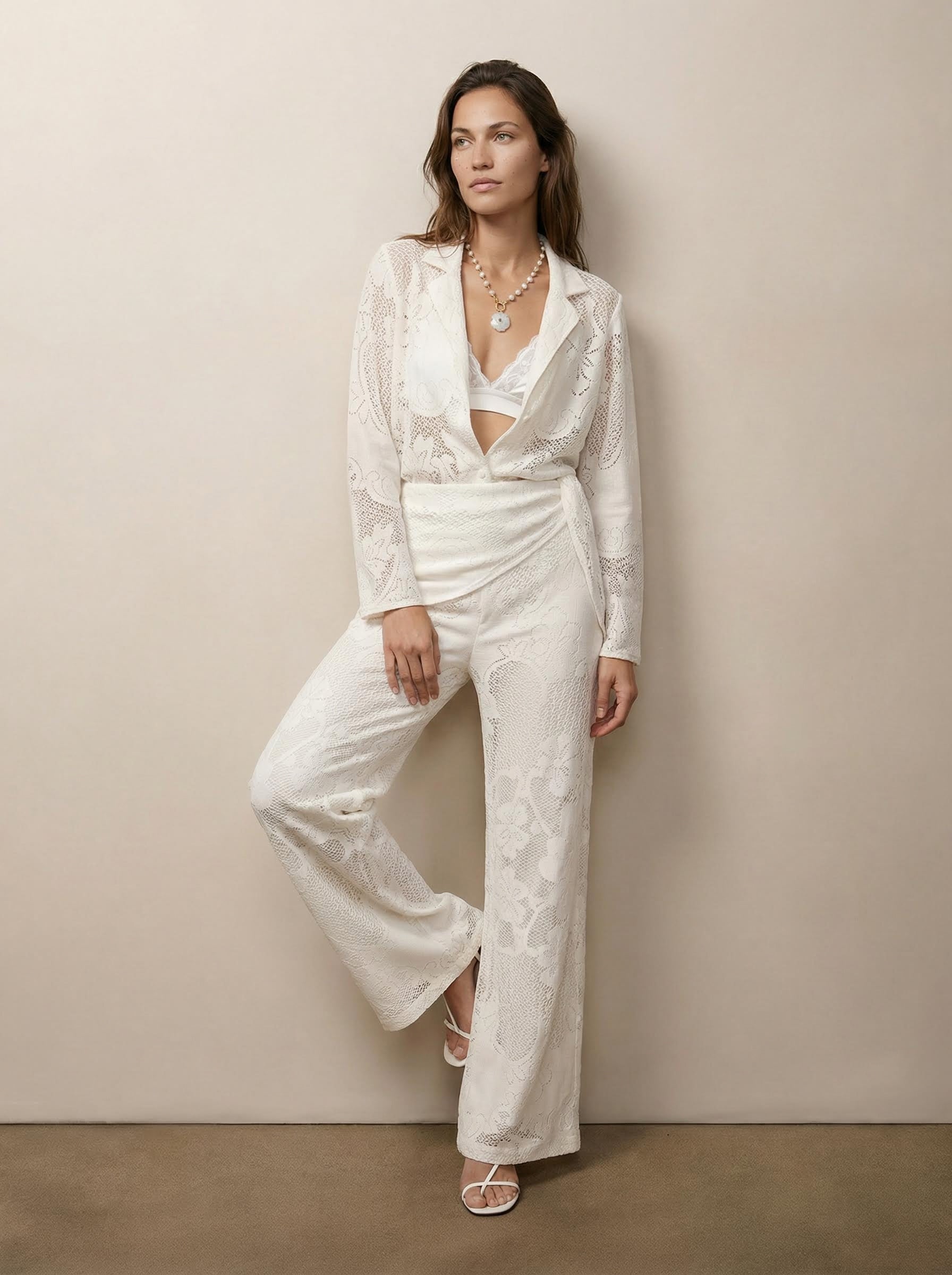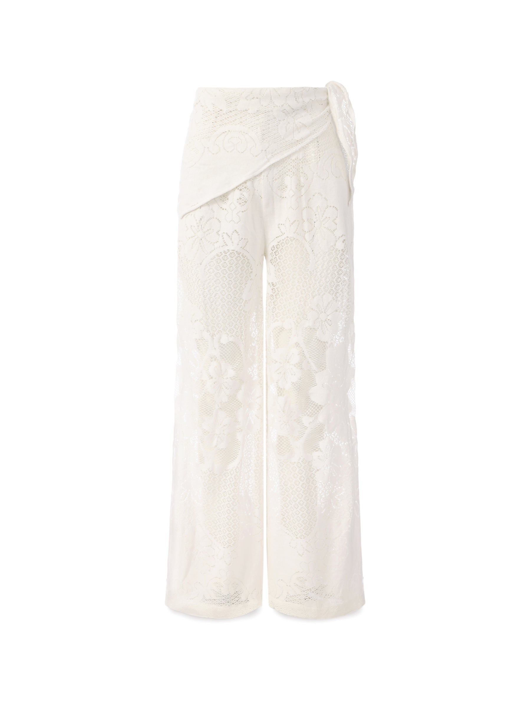 מכנסי תחרה רחבים ומרשימים בעיצוב שמאזן בין נוחות לסטייל. גזרה רפויה עם מותן אלסטית ושרוך מתכוונן ללבישה מחמיאה וקלה. תחרה מלאה ודומיננטית מעניקה מראה אלגנטי ומעודכן. בד קליל ונשפך שמלווה את תנועת הגוף. מושלמים לשילוב עם טופ תואם או חולצה חלקה, וכוללים צעיף מותן תואם להשלמת הלוק.