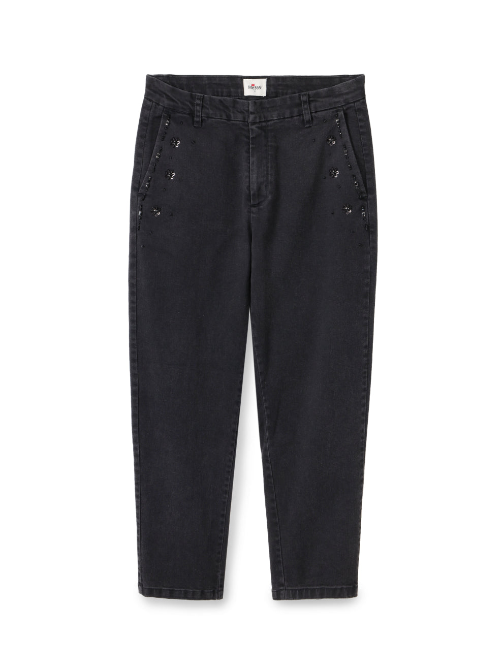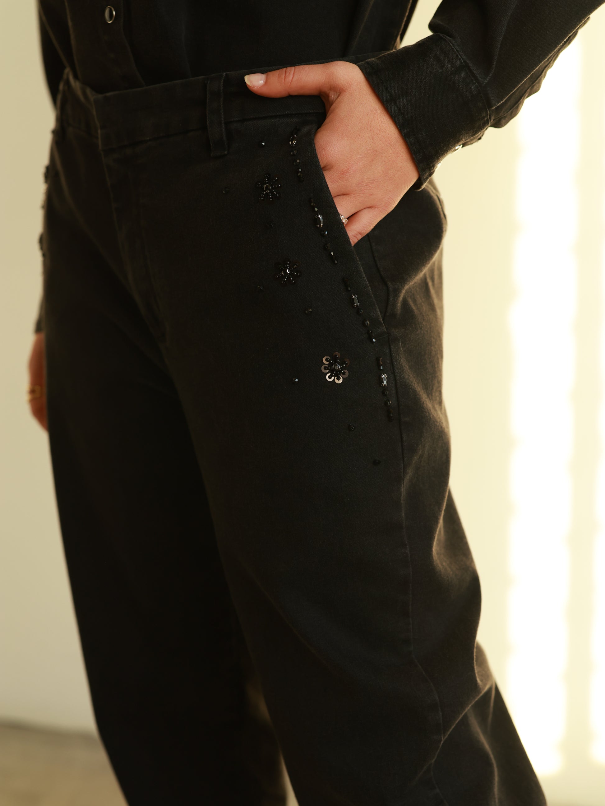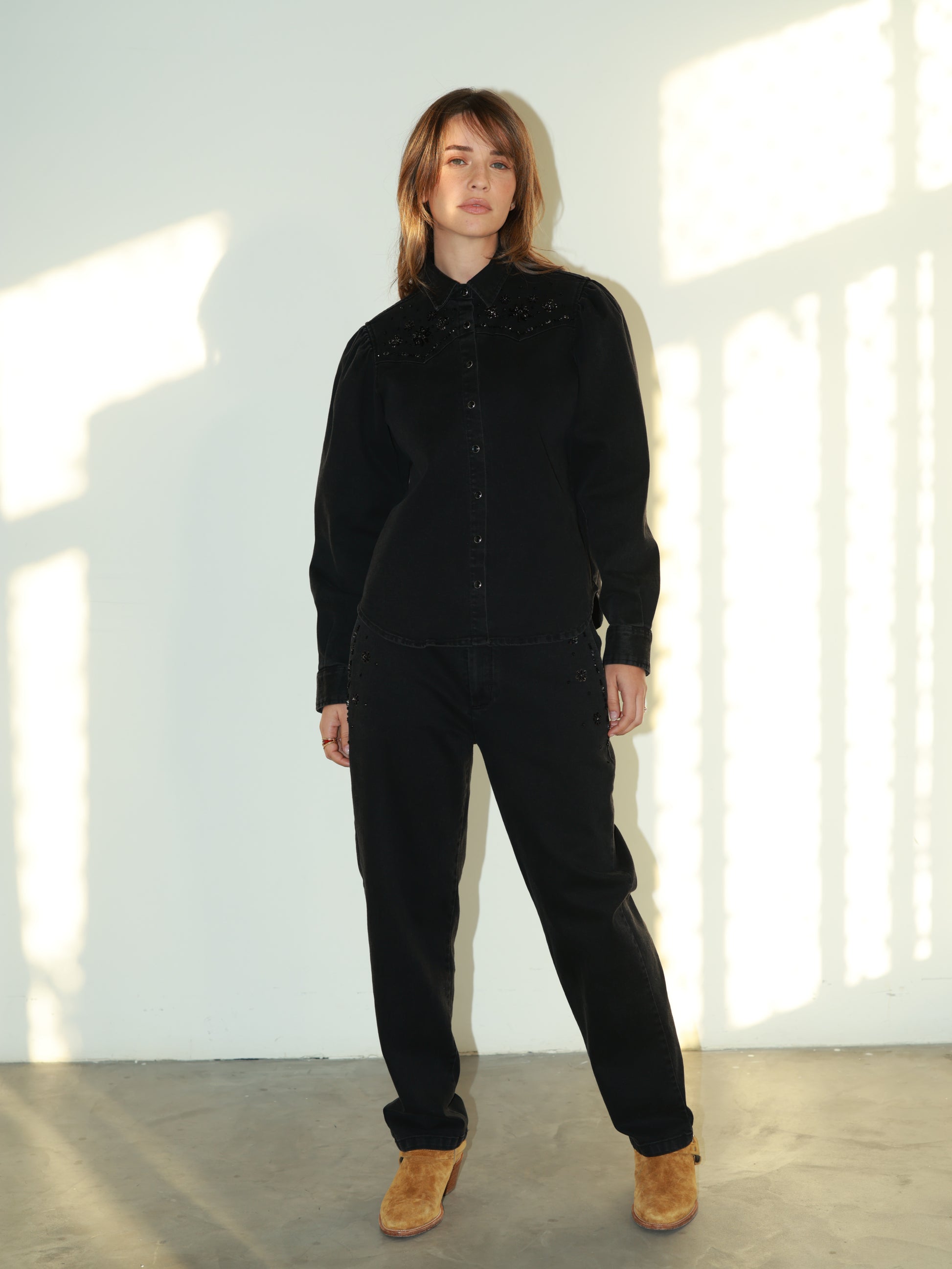 ג’ינס שחור בגזרת באגי קרופ, עם רקמת פאייטים פרחונית, שני כיסים בצד ולולאות לחגורה. שלבי עם חולצת הג’ינס המכופתרת התואמת למראה "ווסטרן שיק" מושלם.