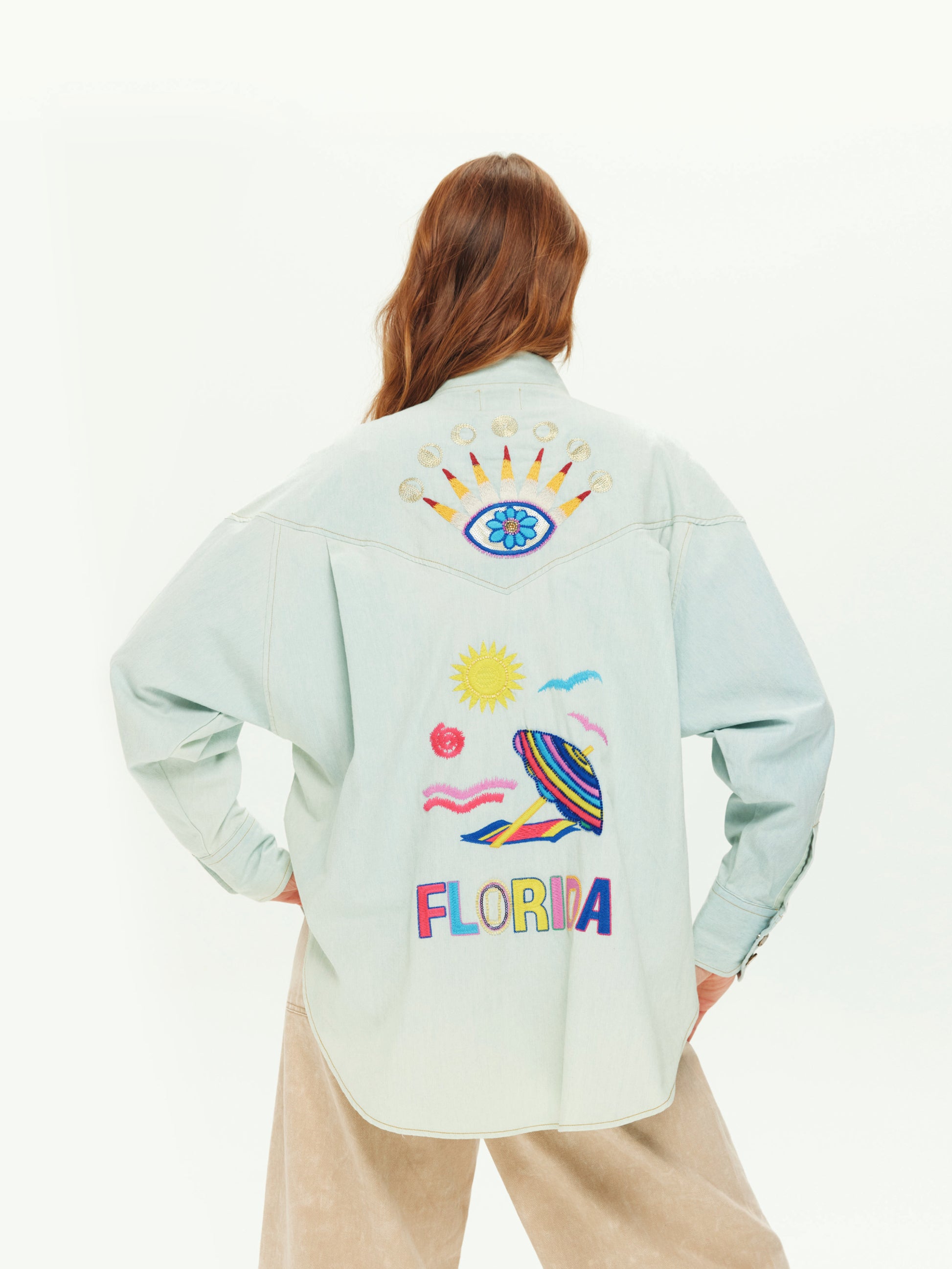 100% Cotton. Button down collar shirt with long sleeves and cuffs. Shirt has a rounded hemline. Shirt is in denim and is embroidered with many cute graphics