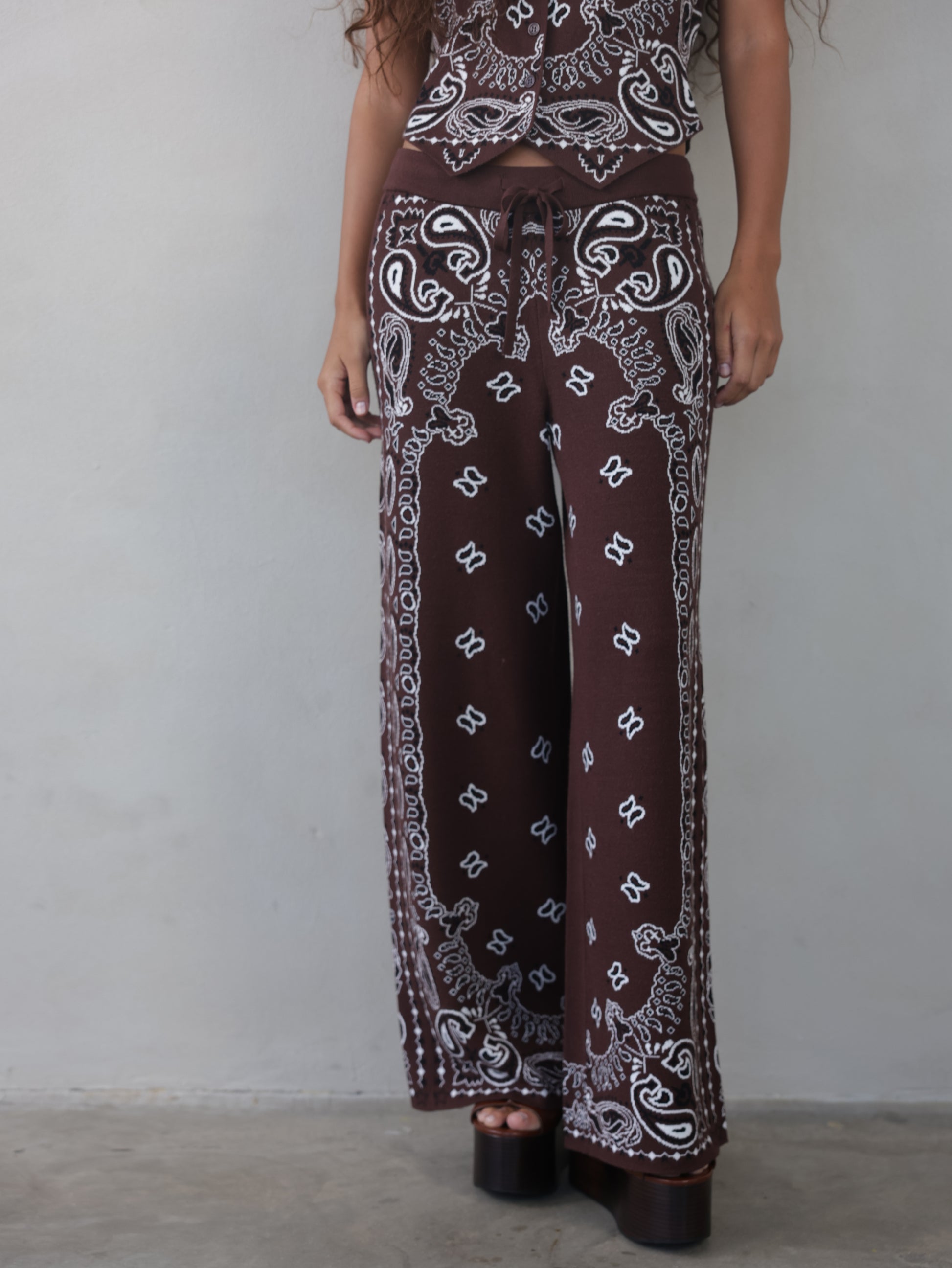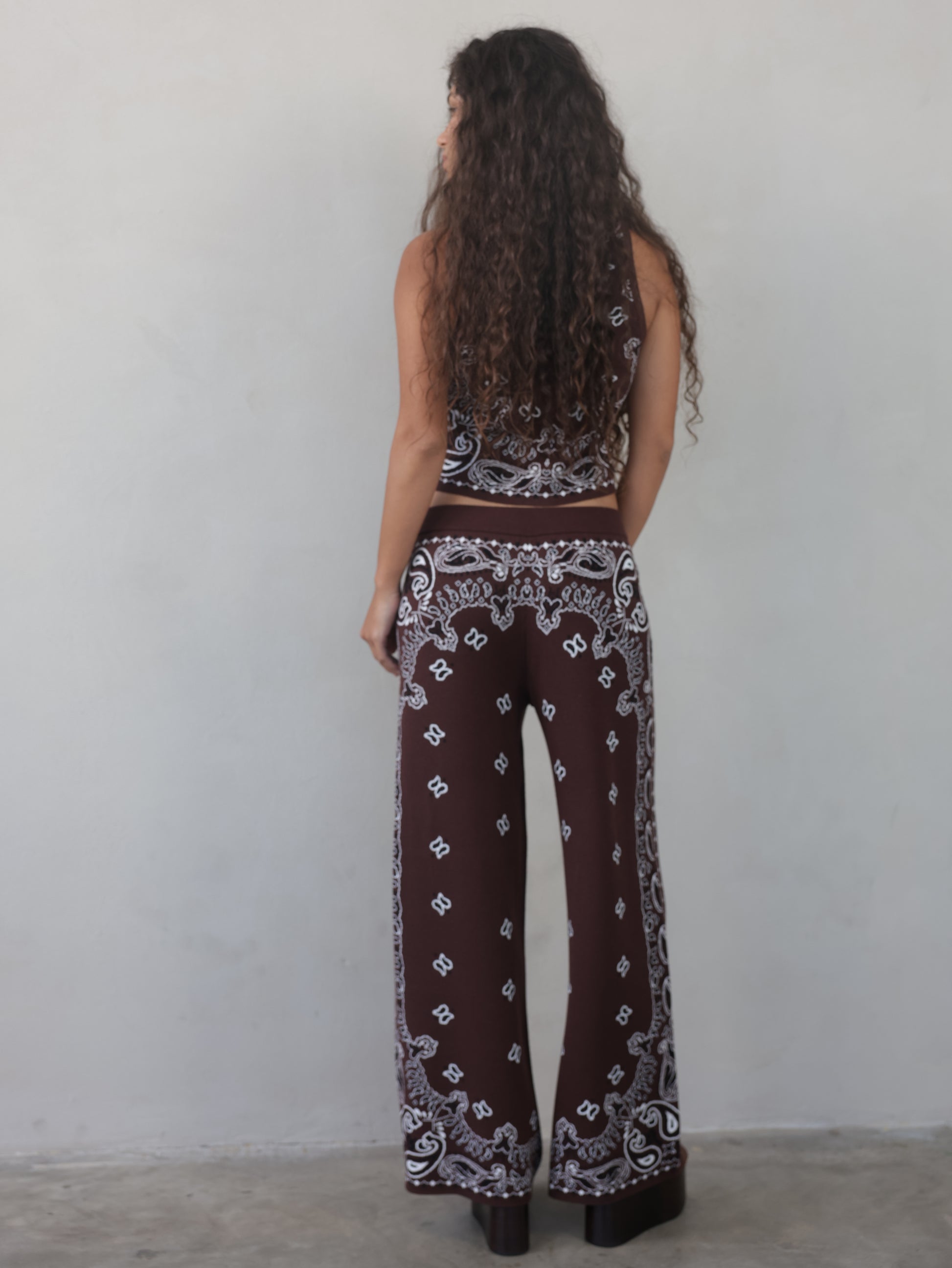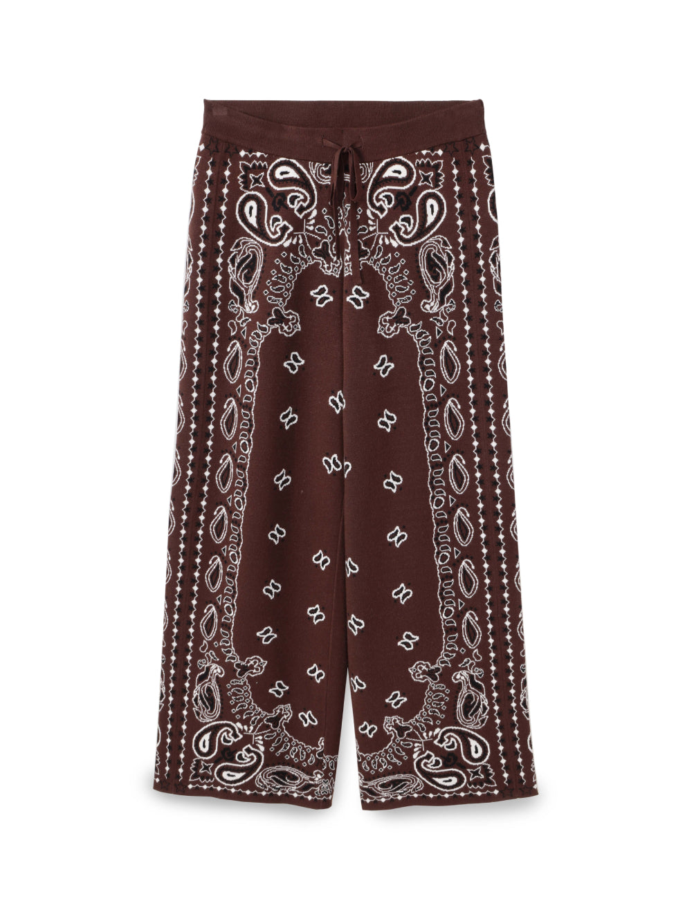 Elastic waist with tie closure, wide leg pants. Two side pockets. Available in a chocolate or orchid bandana intarsia print in sizes Y-3. Pair with our matching vest for a cool, artistic look.