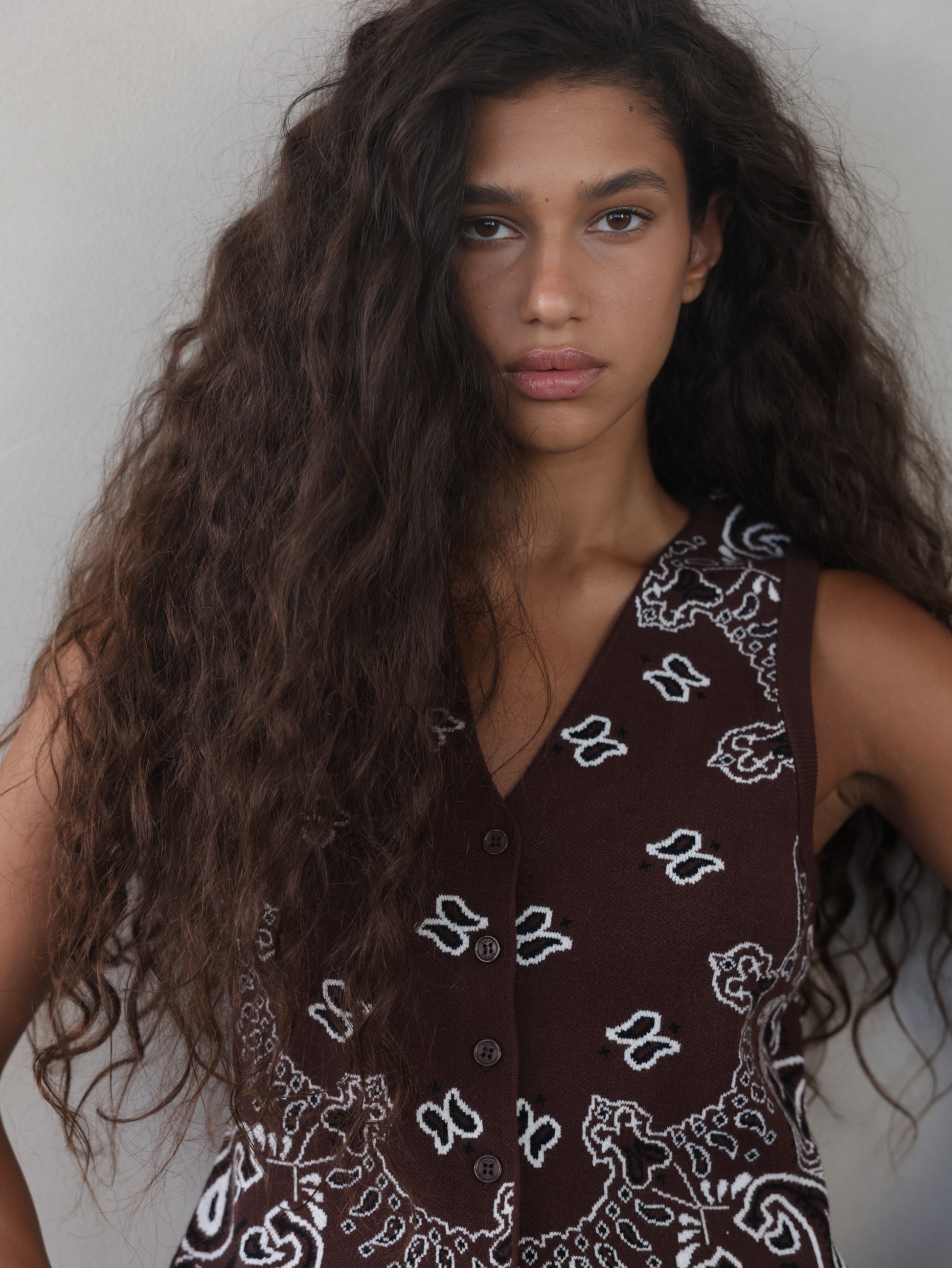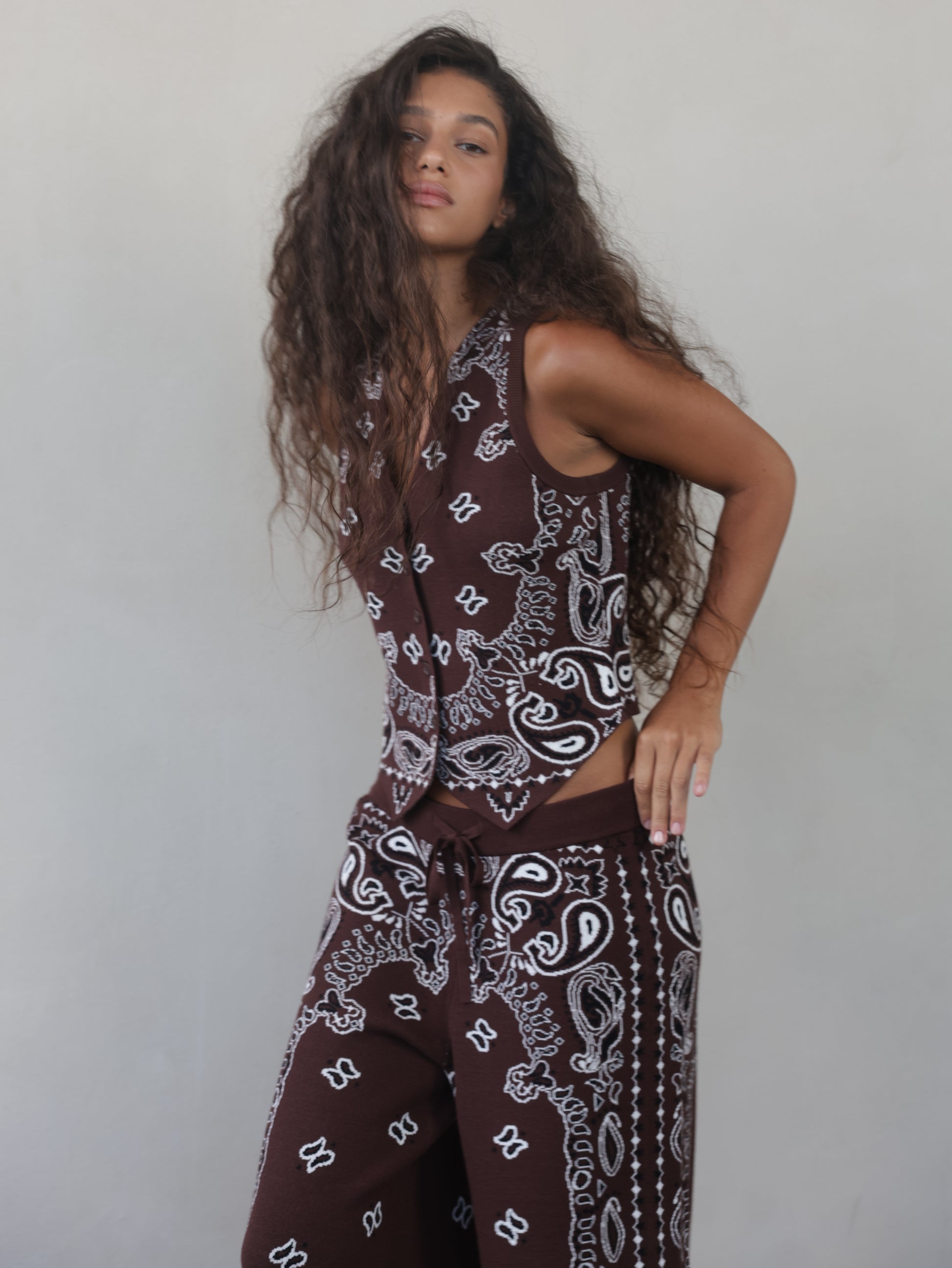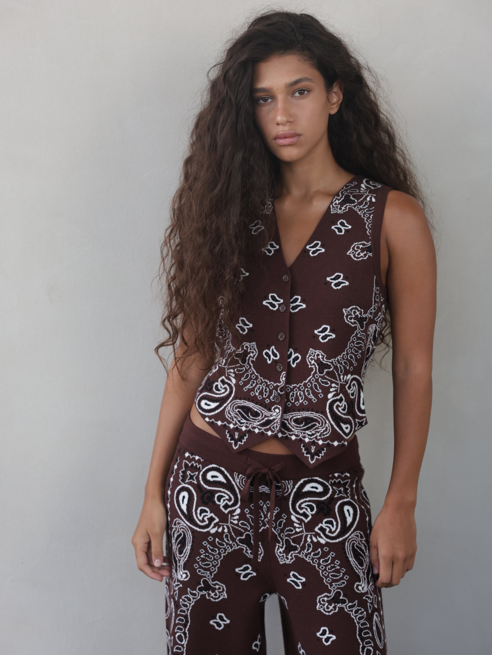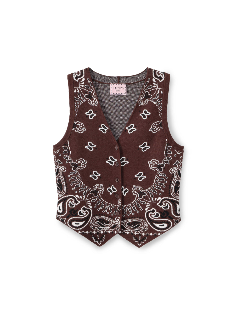 Button down V-neck vest with two pocket flaps. Pointed hemline, two vertical darts. Available in a chocolate or orchid bandana intarsia print in sizes 0-3. Pair with our matching pants for a cool, artistic look.