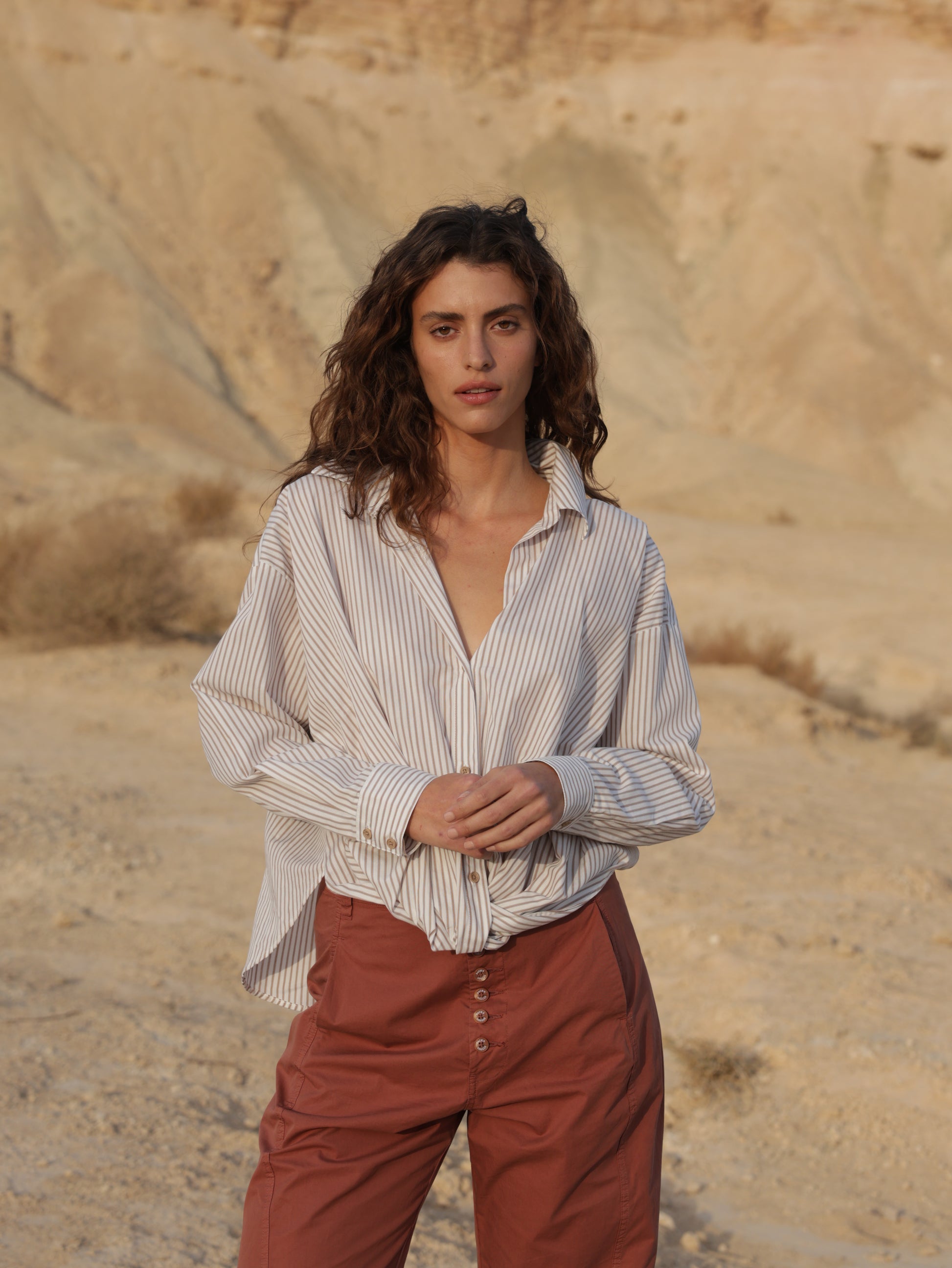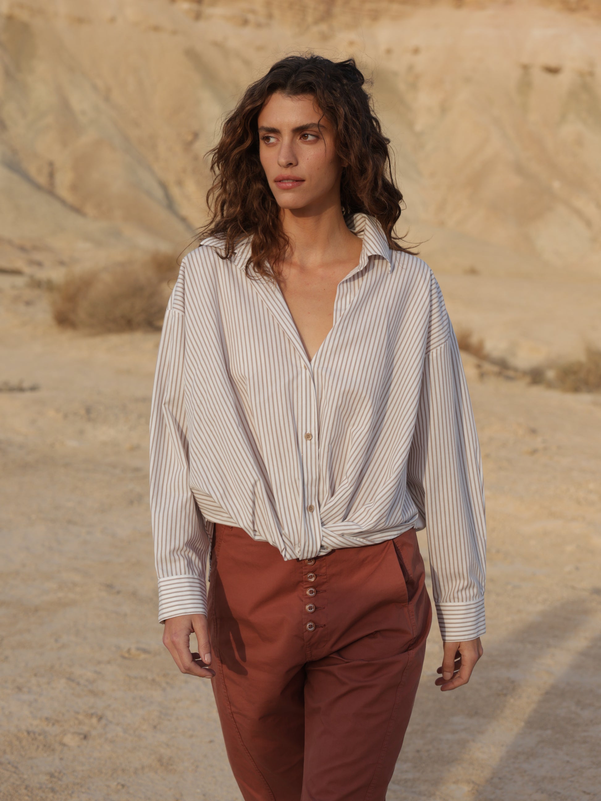 100% cotton long sleeve short length top. Collar, cuffs and three button closure. Hemline is gathered right below the buttons and is rounded. Available in a black stripe, white stripe or sand stripe pattern in sizes 0-4. Very cute with any of our casual pants for a feminineelevated look.