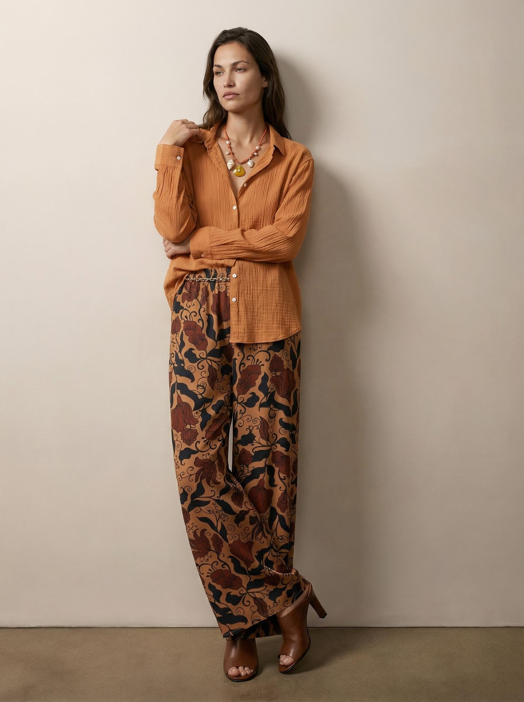 This crinkled cotton button-down shirt offers an effortless blend of comfort and timeless style. Designed with a relaxed fit, classic collar, and soft texture, it brings a laid-back yet polished feel to everyday dressing. The lightweight gauze fabric is breathable and easy to wear, making it perfect for all-day comfort and layering. Subtle seam details and a curved hem add a refined finish. Available in Natural, Brown, Black, and Terracotta for warm, versatile styling options.