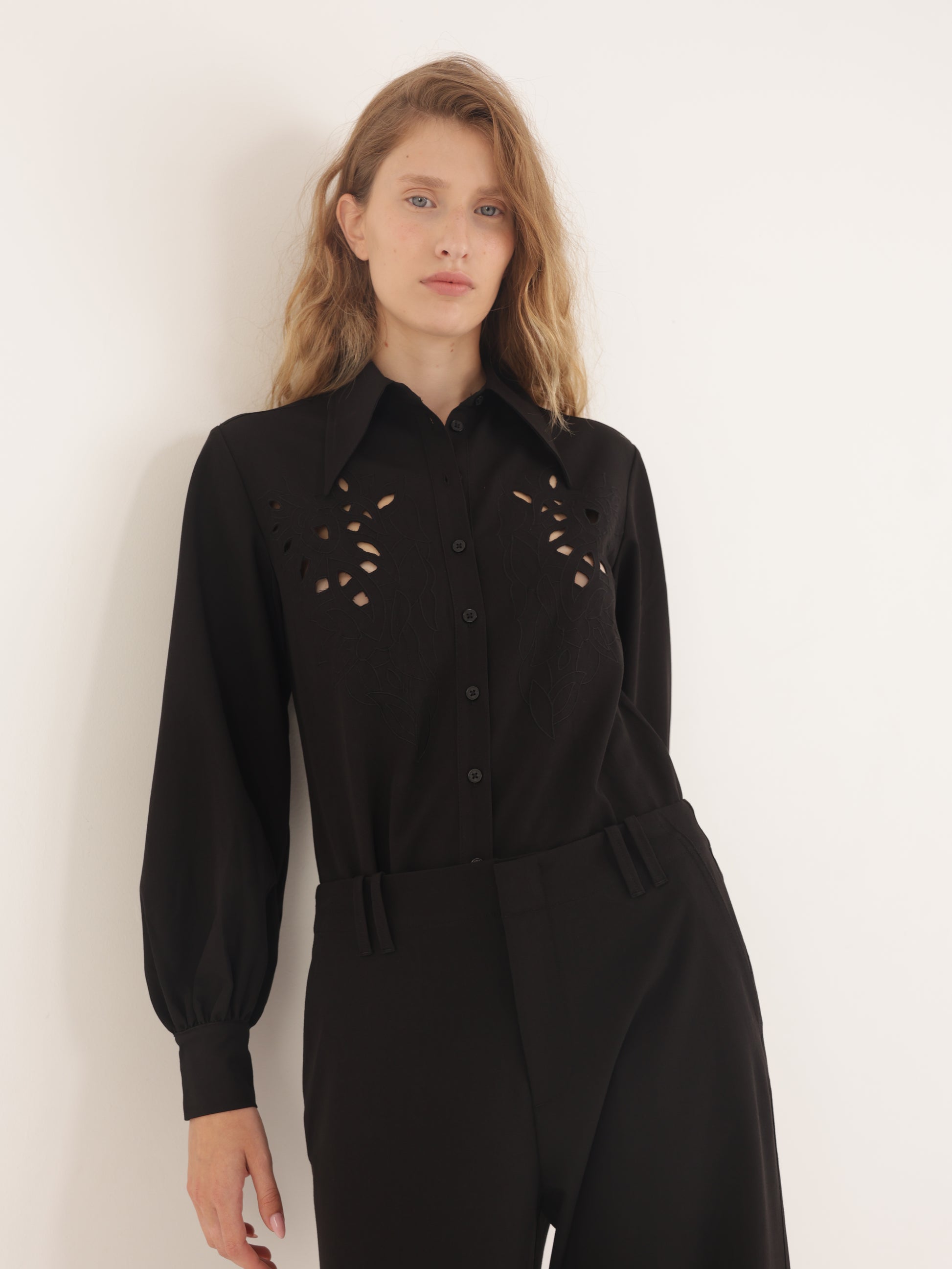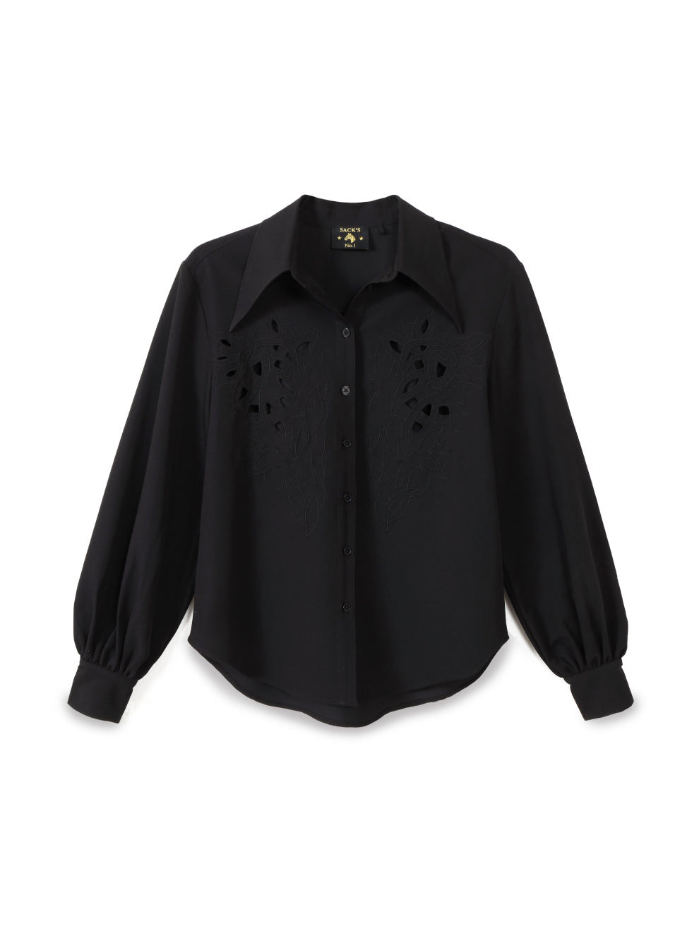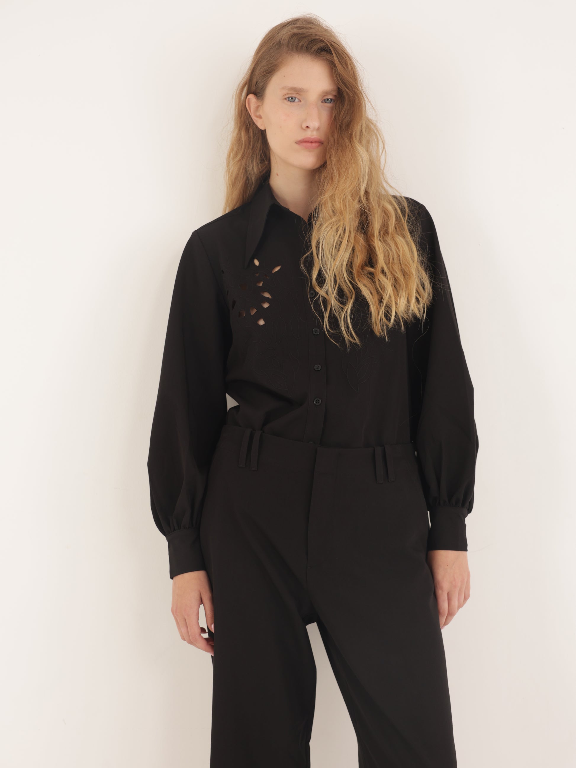 Button down shirt with collar and cuffs. Sleeves are long and puffy. The shirt is embroidered in the front. Available in cream or black in sizes 0-4. Pair this shirt with our tailored wide leg pants for a sophisticated, feminine look.