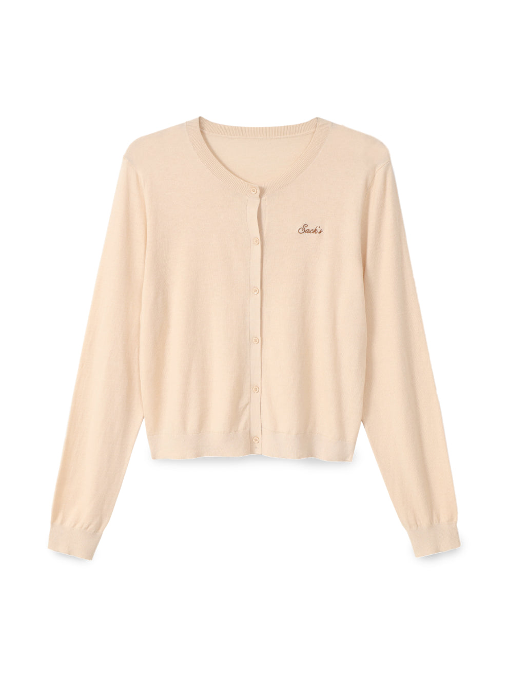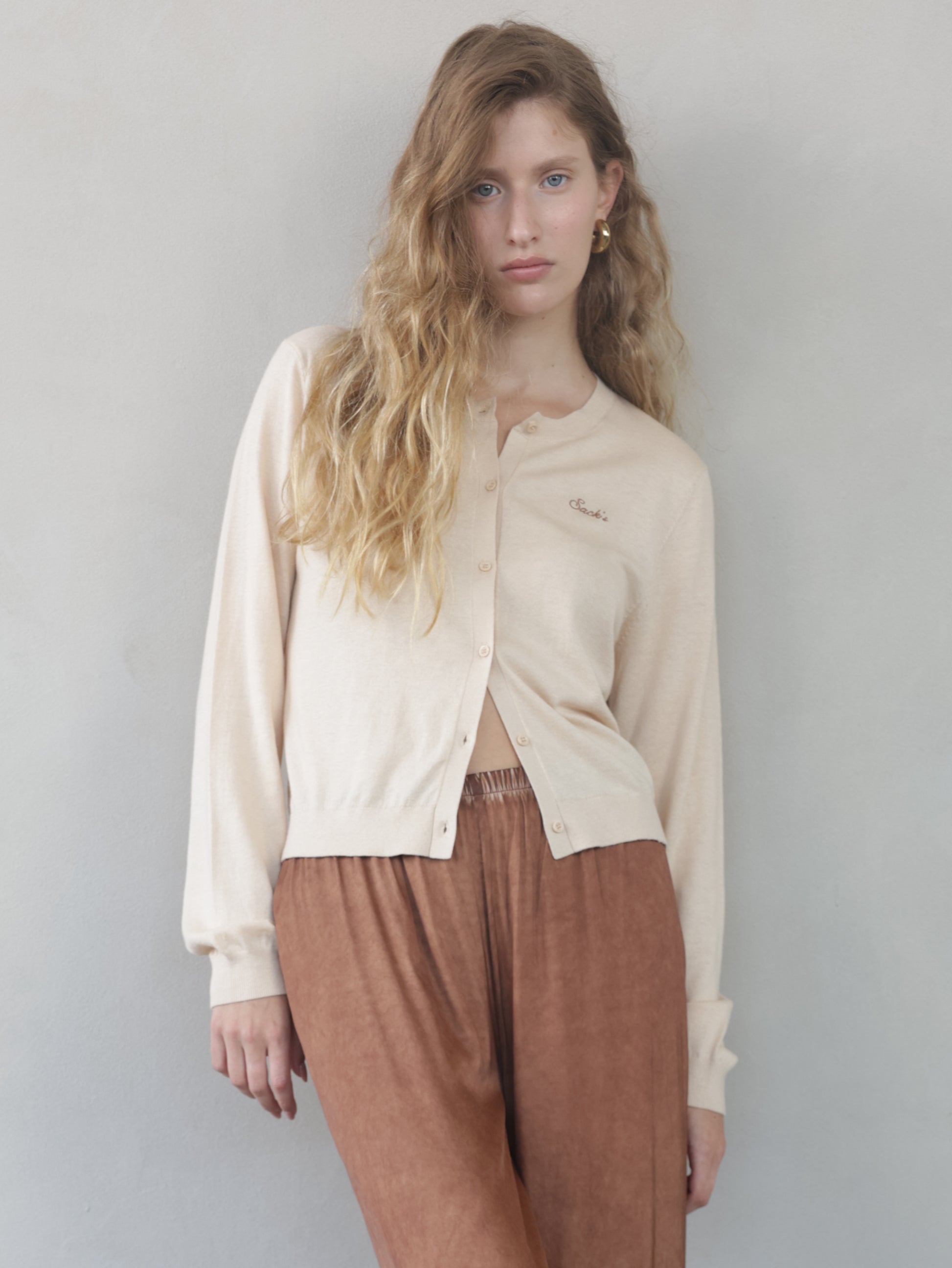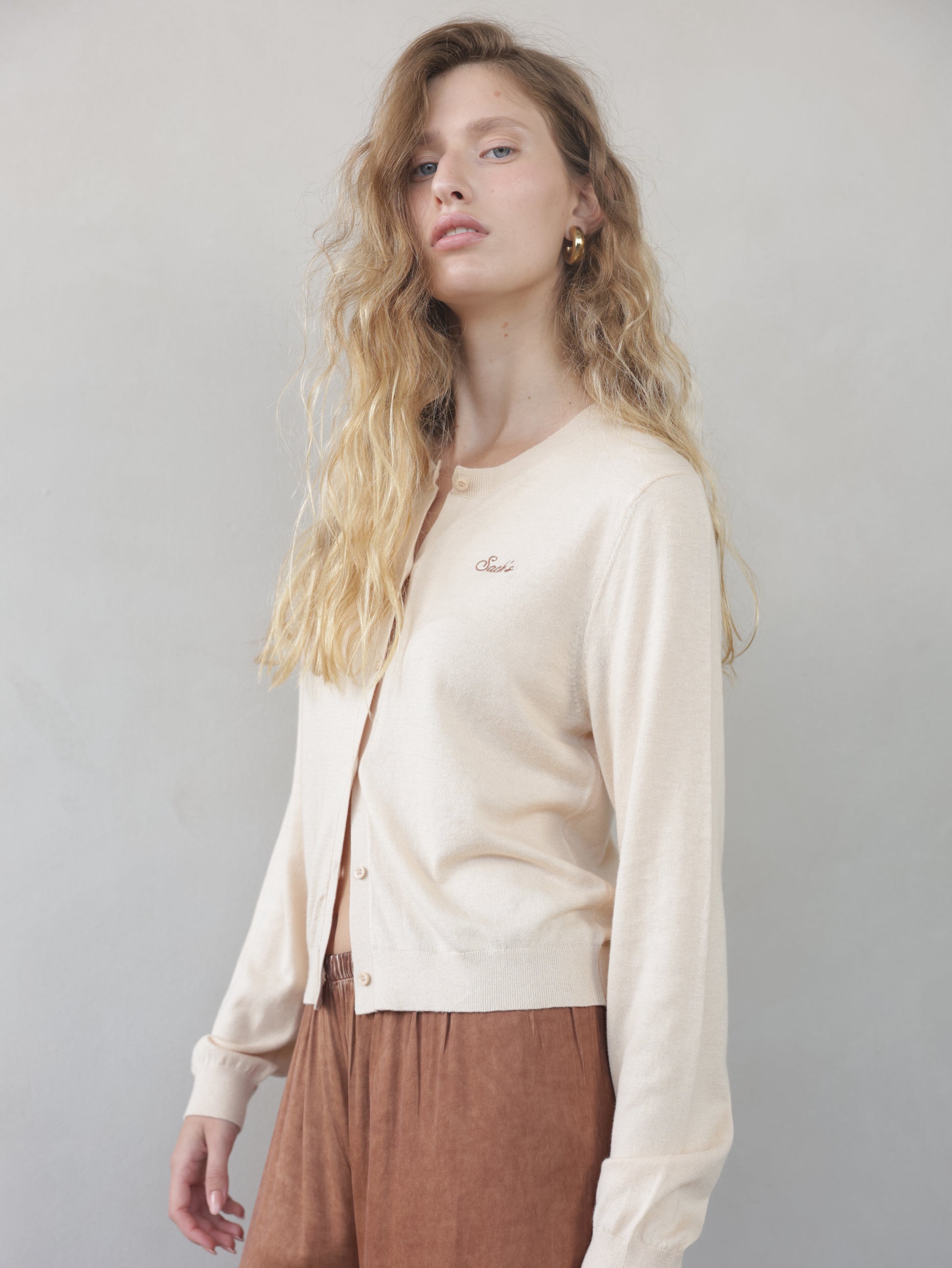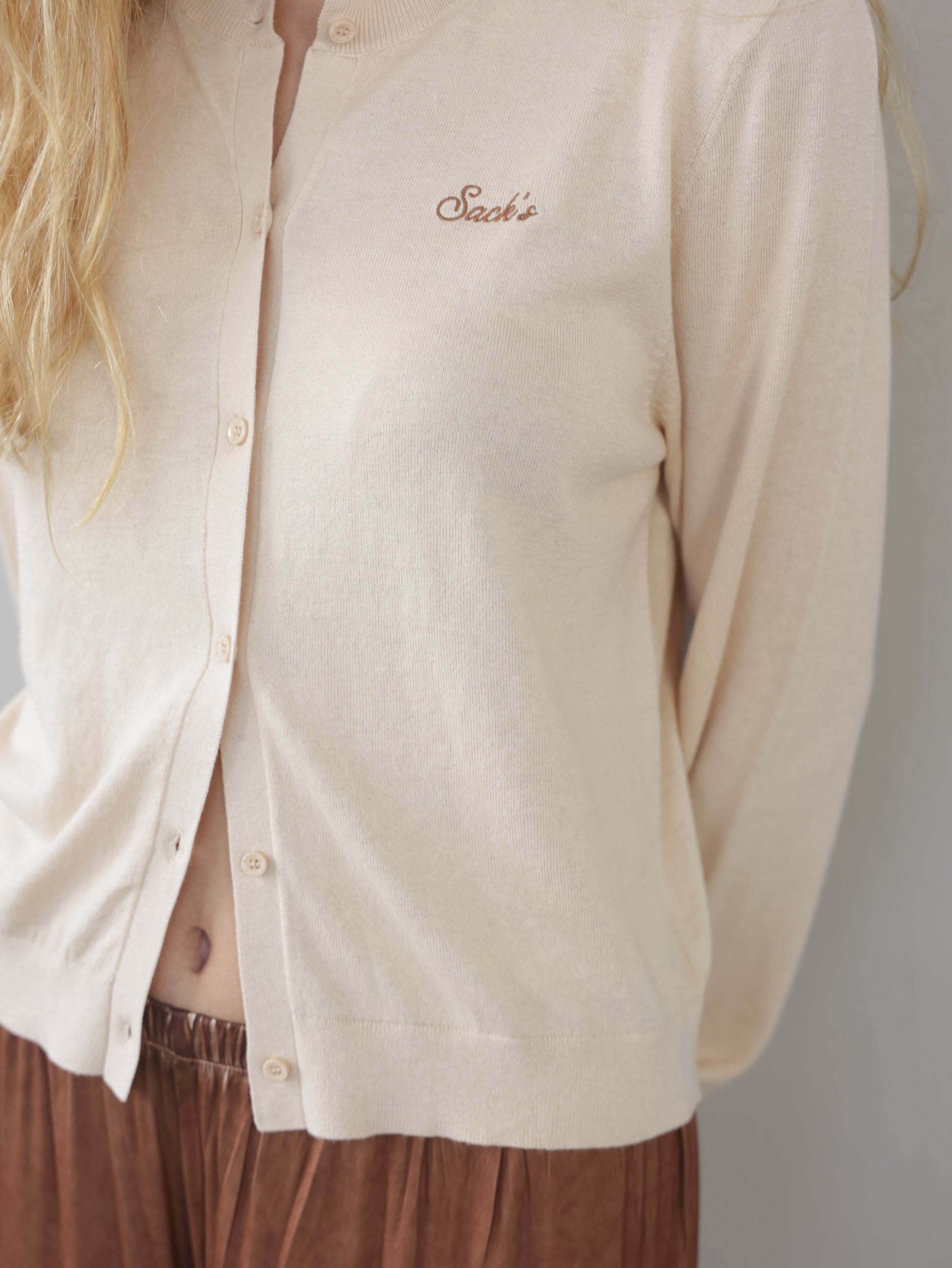 Embroidered Cardigan - Round neck long sleeve, button down cardigan. Small embroidered Sack’s logo on front. Available in bordeaux with an orchid logo or natural with a bronze logo. Size: 0-4, Pair with our bandana knit pants for a vibrant, elevated look.