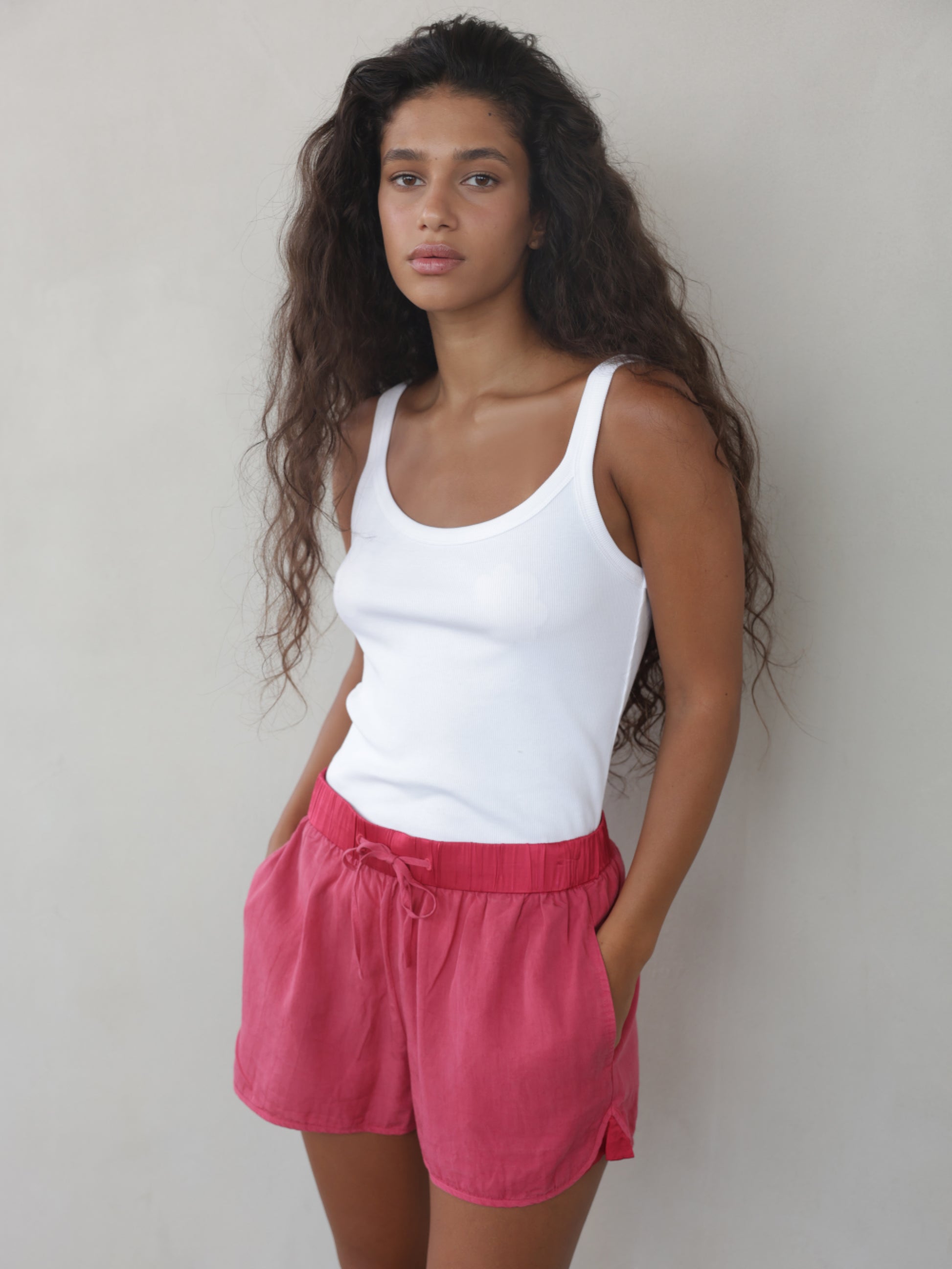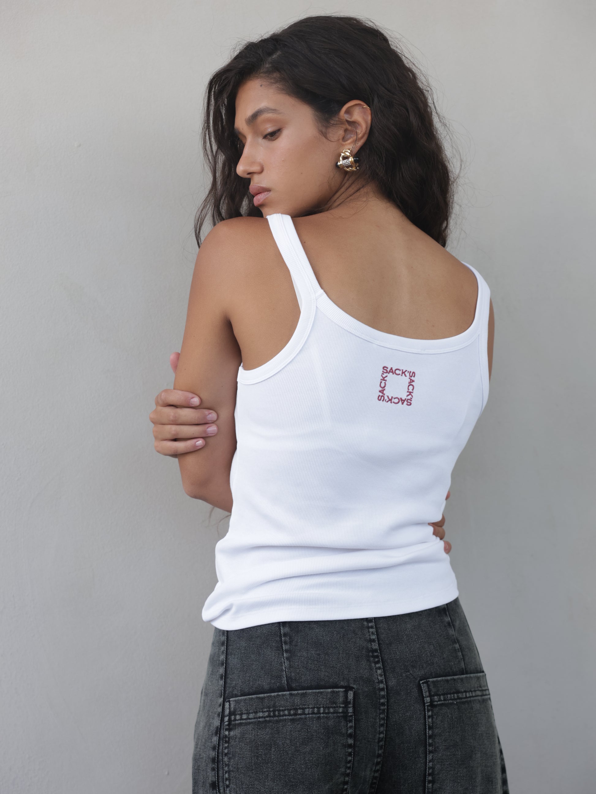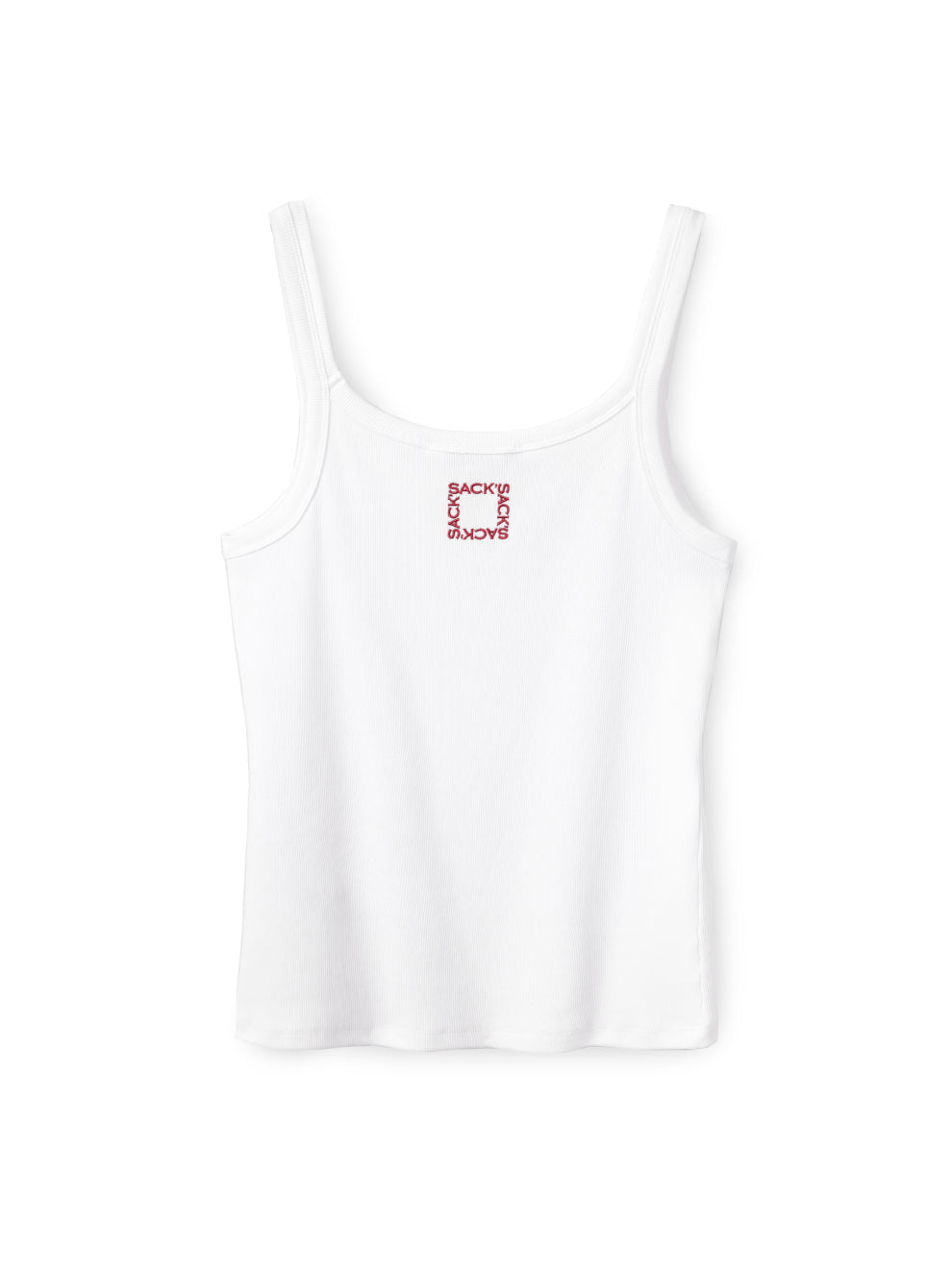 Round neck tank with spaghetti straps. Small embroidered Sack’s logo on back at top in either pink or gold lurex. Available in ivory in sizes 0-4. This is a wardrobe essential that you can wear with any of your pants, skirts, or shorts for an easy to wear, summery look.