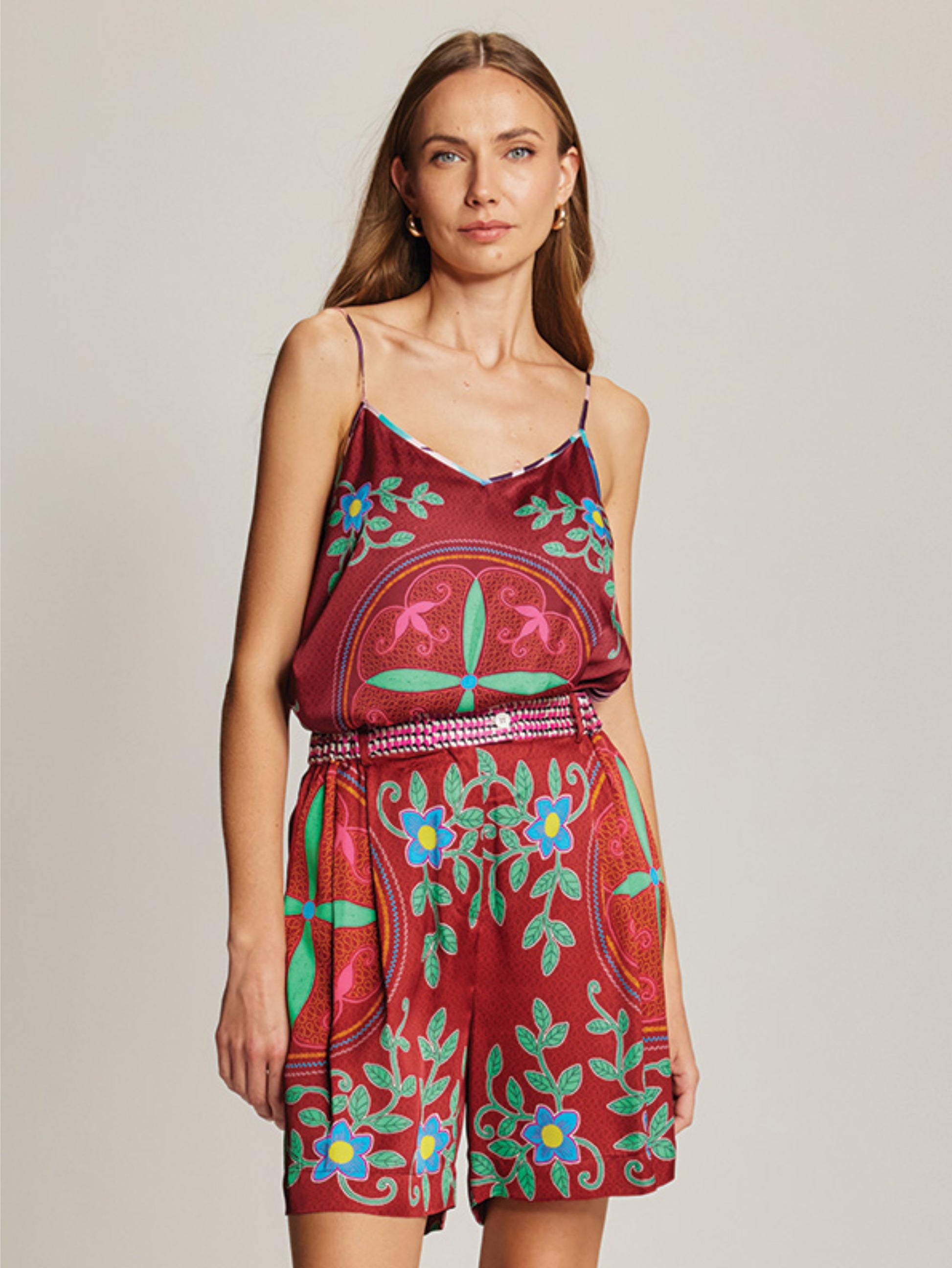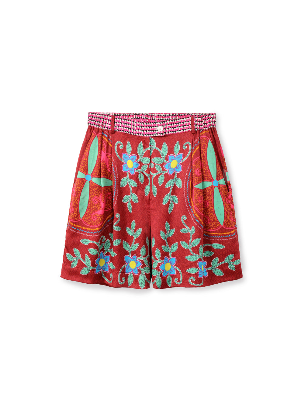 Elastic waist pleated shorts with five belt loops. Two side pockets. Available in our Sporty Jade pattern in sizes XS, S, M, L and XL. Pair with your favorite tee, tank or cami for a casual super comfy look.
