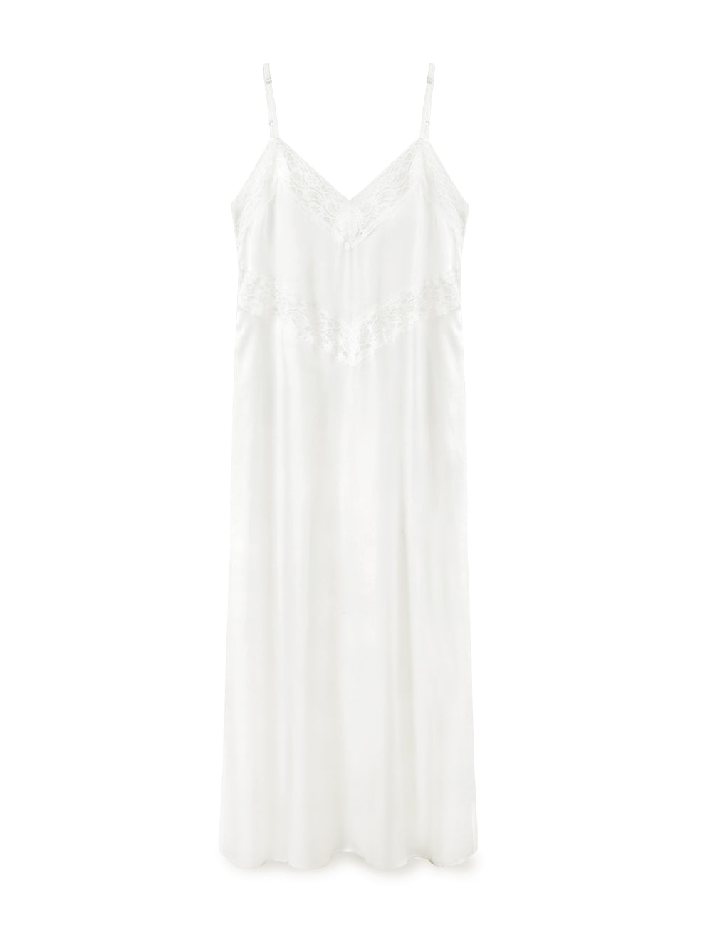 Satin sleeveless maxi dress. Zigzag neckline edged in lace. Midriff has lace edging as well. Spaghetti straps. Available in blue, espresso or chocolate in sizes 0-4. This dress can go from day to night, from casual to dressy. This is a feminine, flattering addition to any wardrobe.