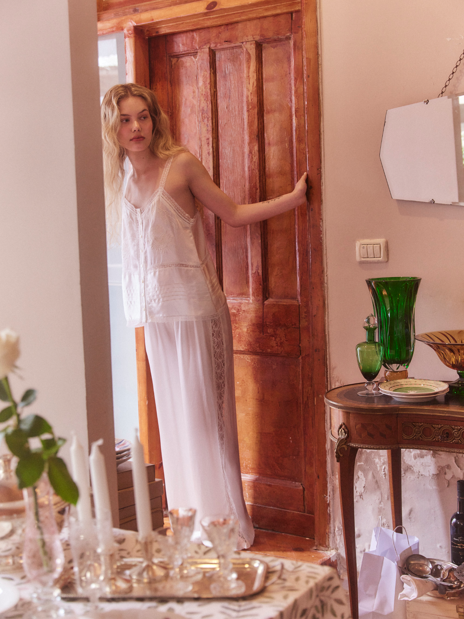 Satin elastic waist wide leg pants. Lace edging along the sides. Available in blue, espresso or chocolate in sizes Y-4. Pair with our matching shirt or tank for a fun, boho chic look.