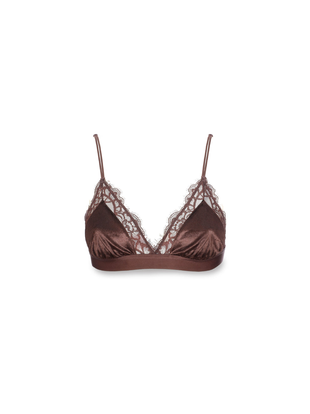 Velvet bralette trimmed in lace. Adjustable spaghetti straps. Available in black, white, orchid or chocolate in sizes 0-4. Wear this bralette under your favorite shirt or sweater for an ultra feminine look.