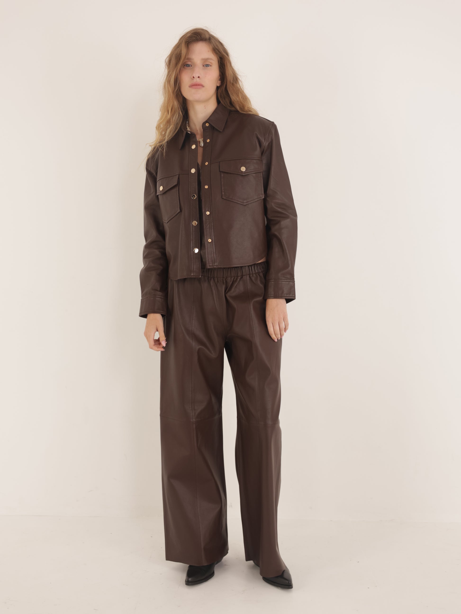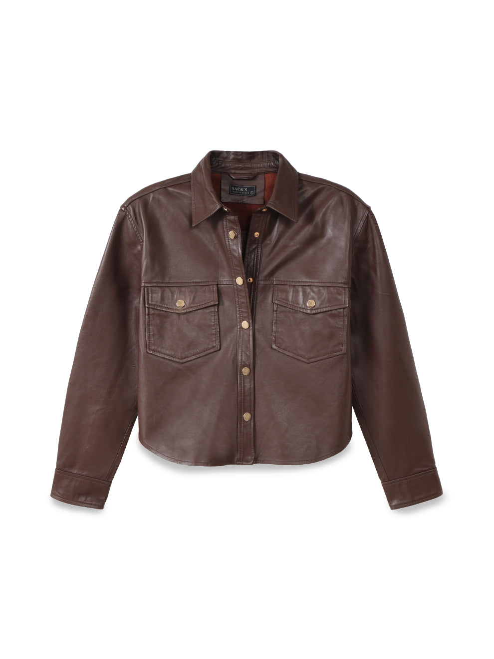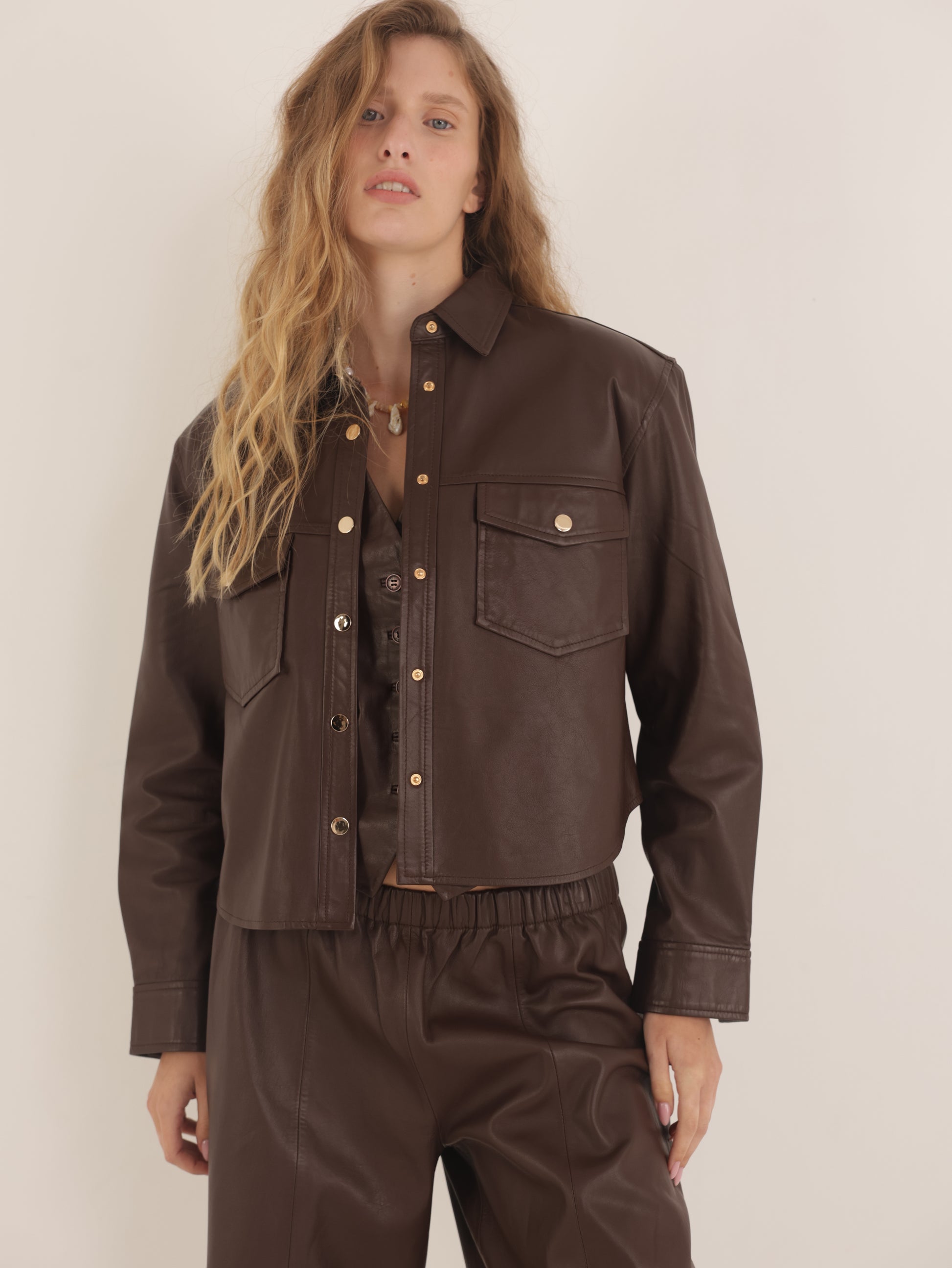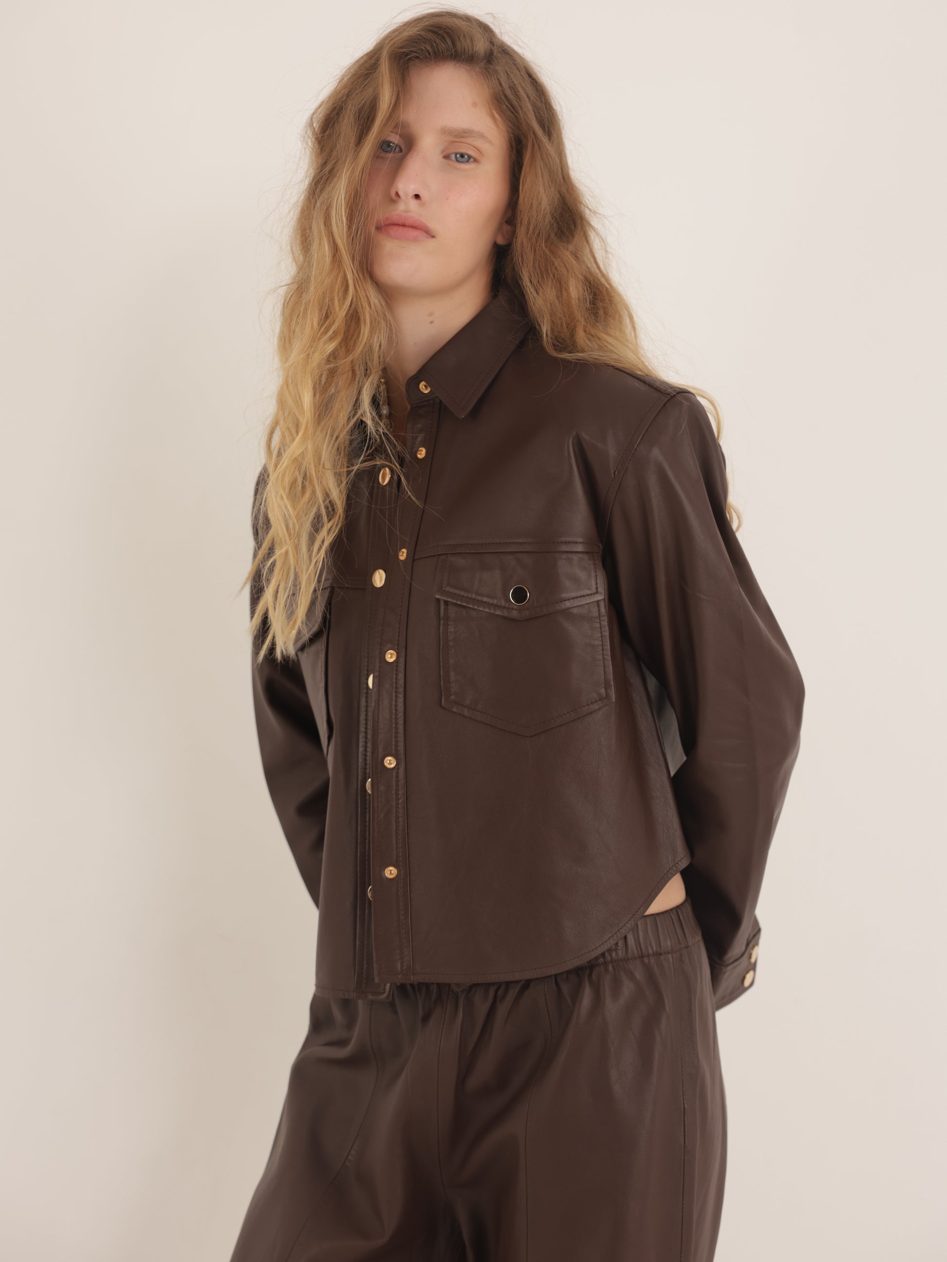Long sleeve, leather, button down, crop shirt with collar and cuffs. Available in sand, black or chocolate in sizes 0-4. Pair with our matching leather pants and vest for a vibrant, slick look.