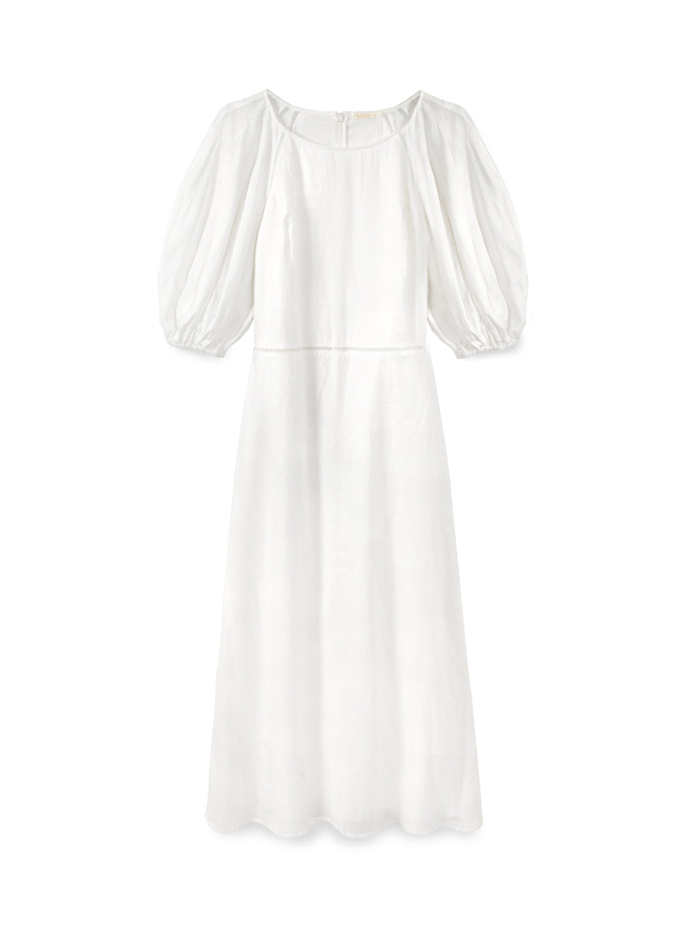Linen maxi dress. This looks like a dress a princess might wear! Round neck, puffy deep set sleeves to the elbow, bodice with a tie waist. Zips down the back. Available in full white or sand in sizes 0-3. Eye catching, feminine look.