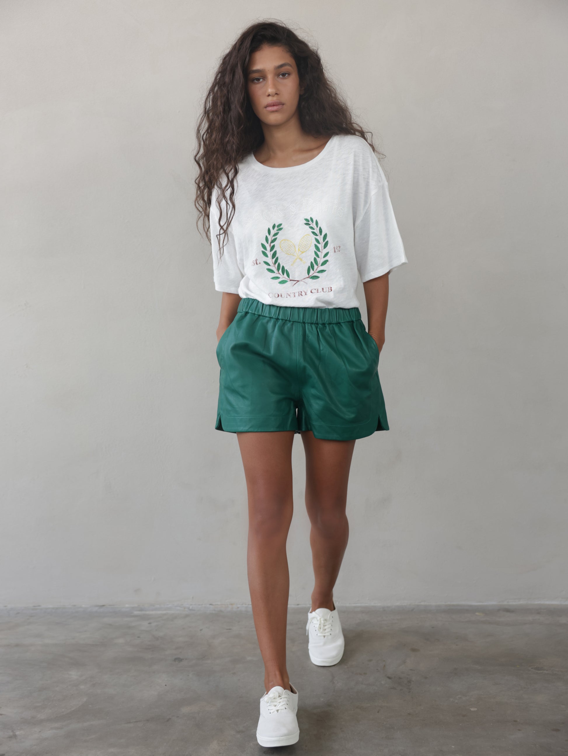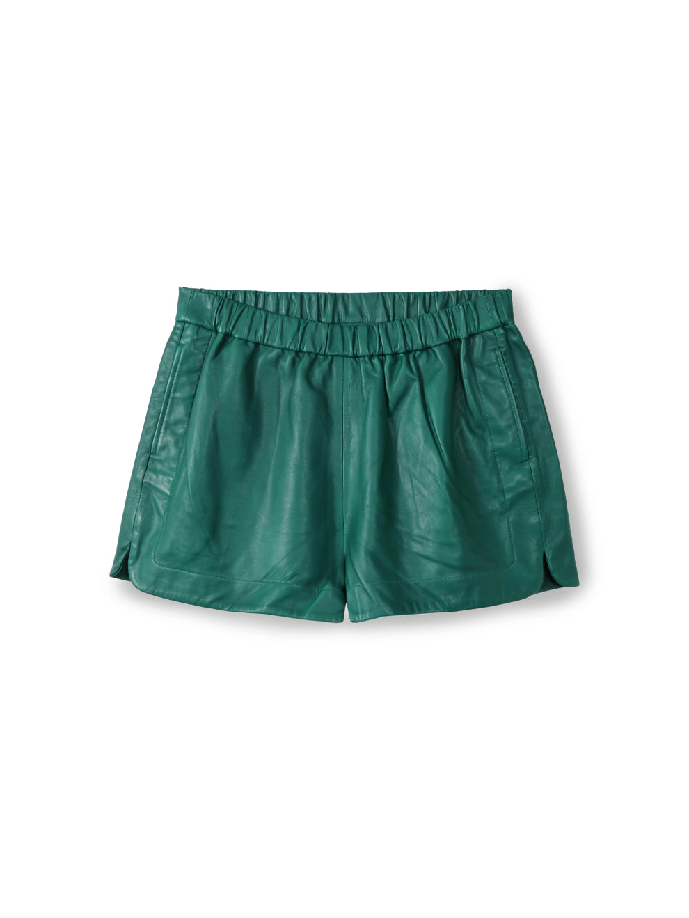 Leather short shorts with elastic waist. Available in evergreen, black and sand in sizes Y-4. Pair with our leather vest for an eye-catching, vibrant look. 100% Leather