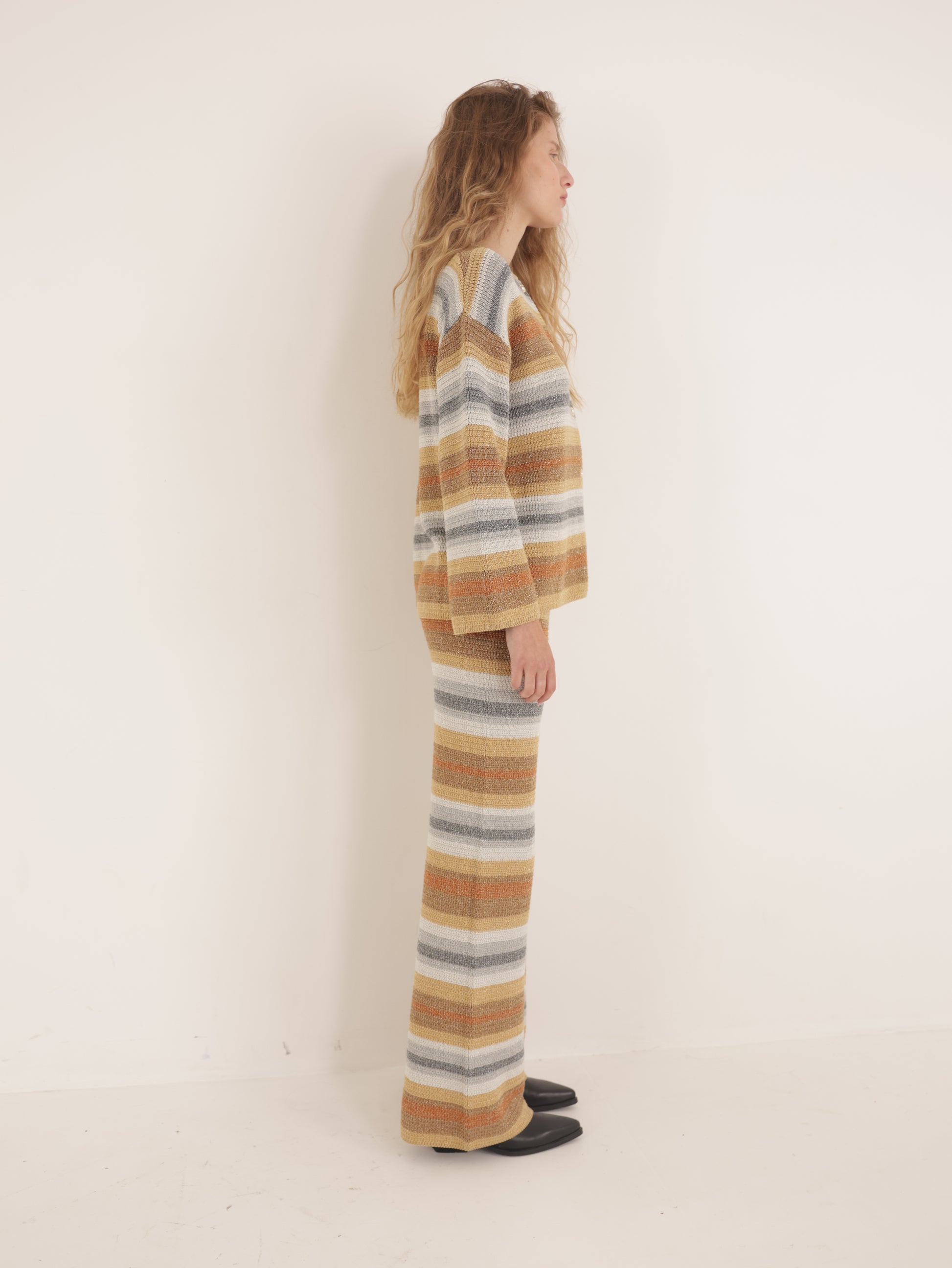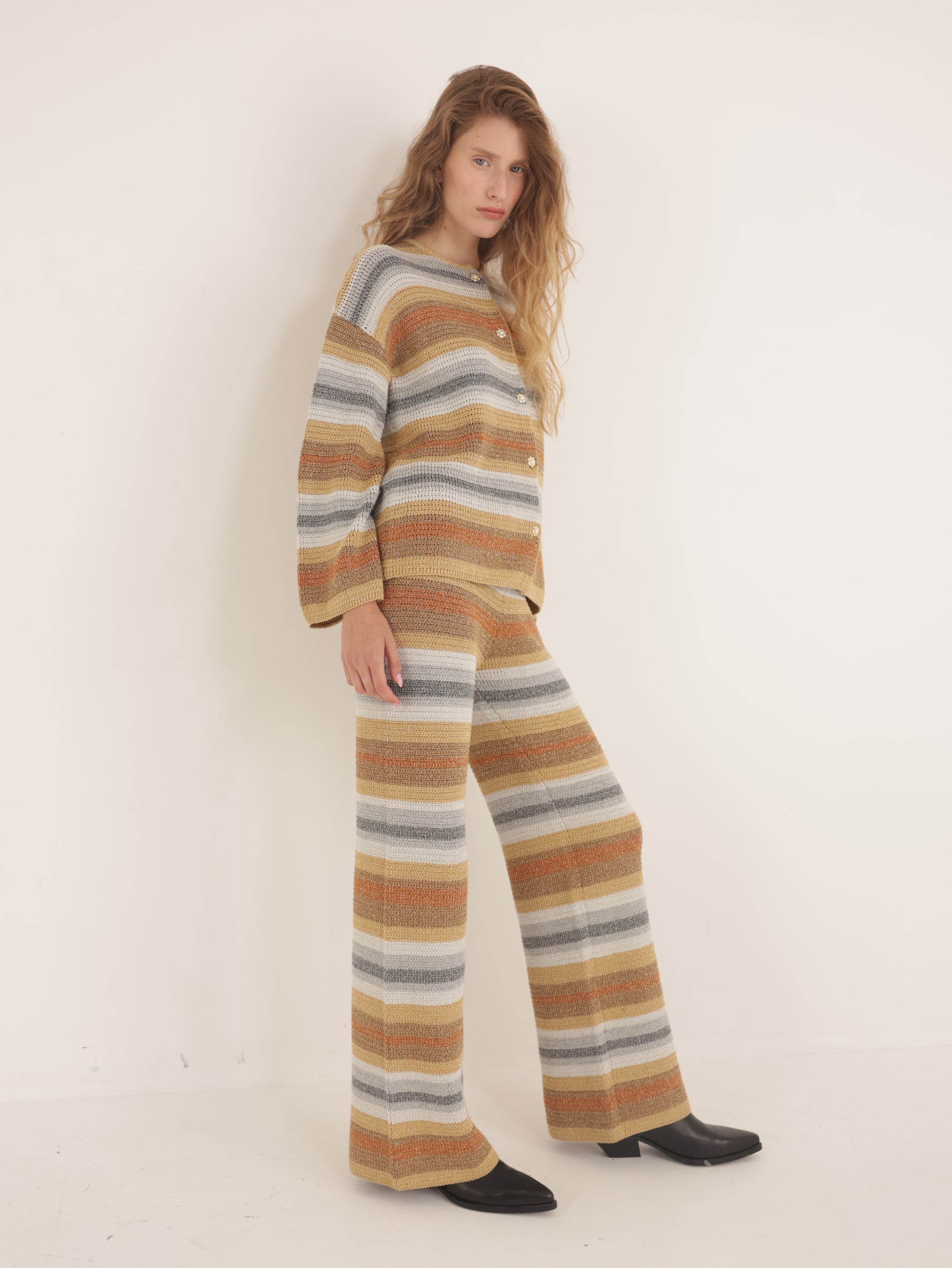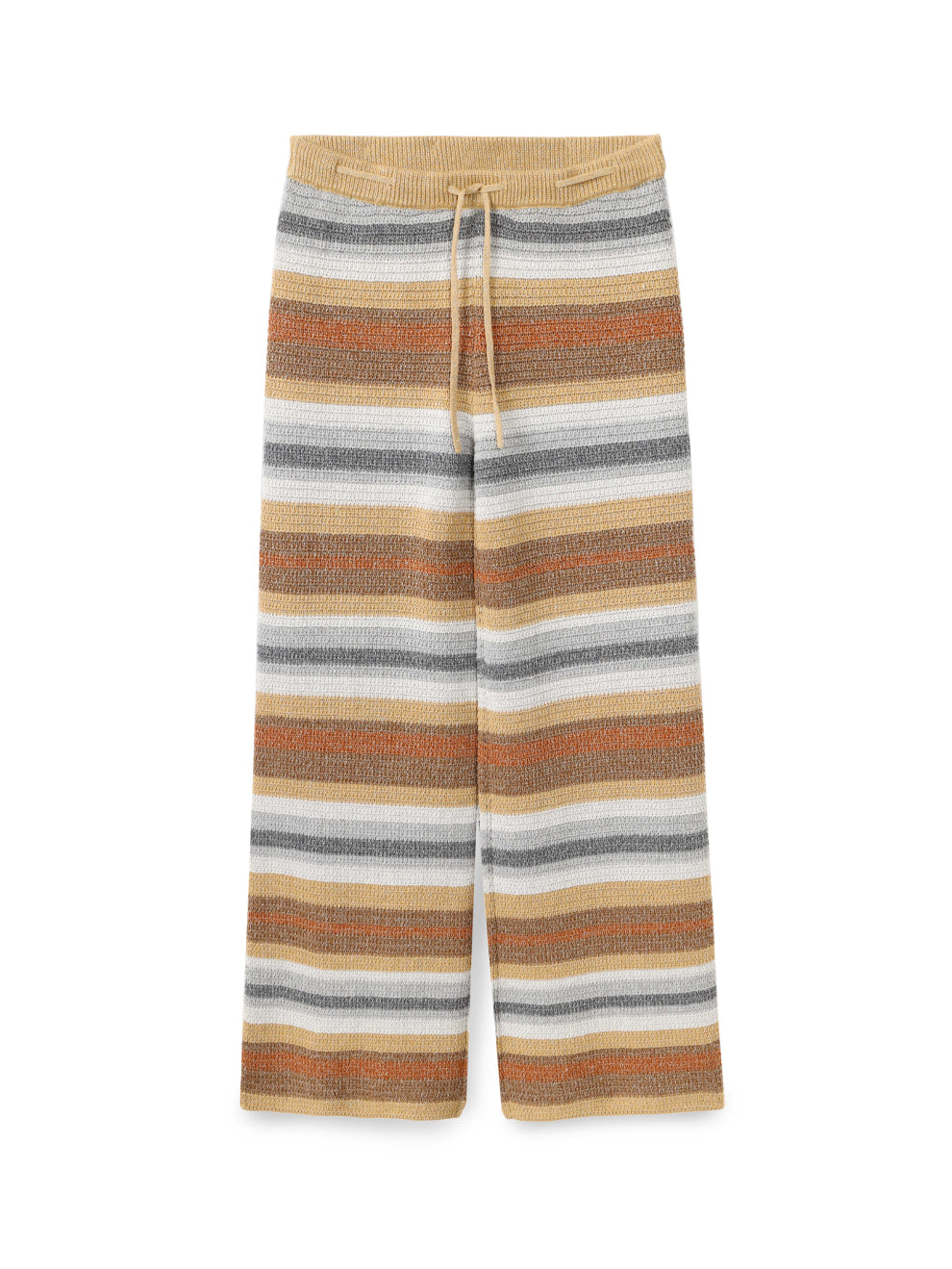 Wide leg pants with tie belt woven through. Available in a blue, white and gold horizontal striped pattern in sizes Y-3. Pair with our matching top for a vibrant, fun look.