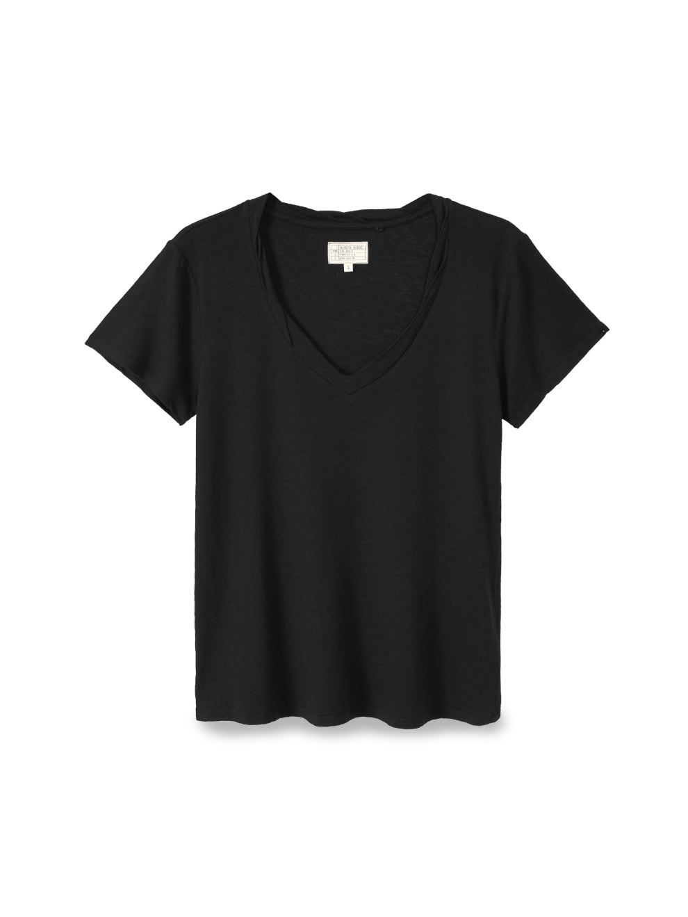 V-neck tee. Short sleeves. Neckline has a twisted edge. Available in white, black, sand, espresso, chocolate,pink,blue or mint in sizes 0-4. This is a wardrobe essential that goes with everything!