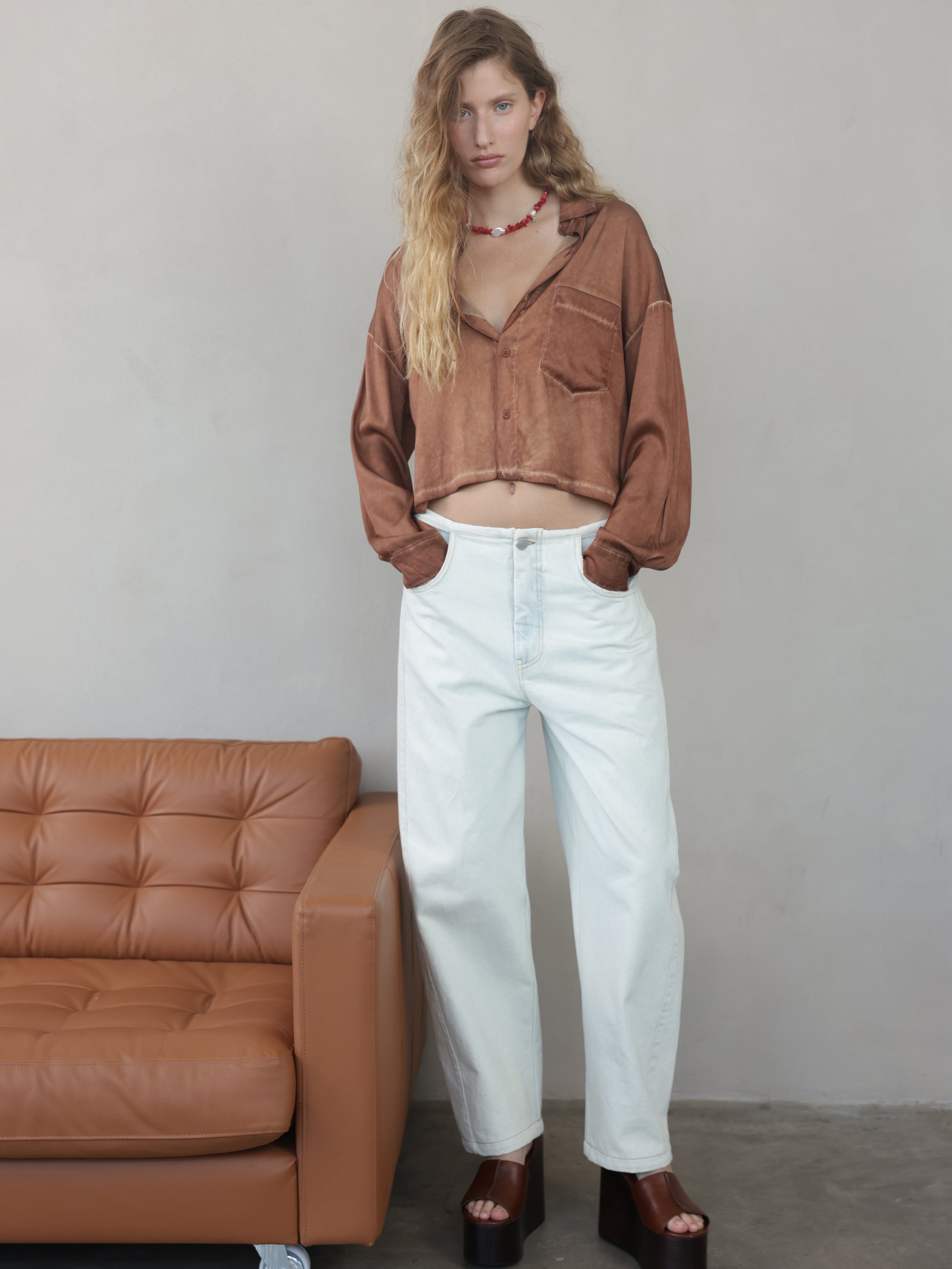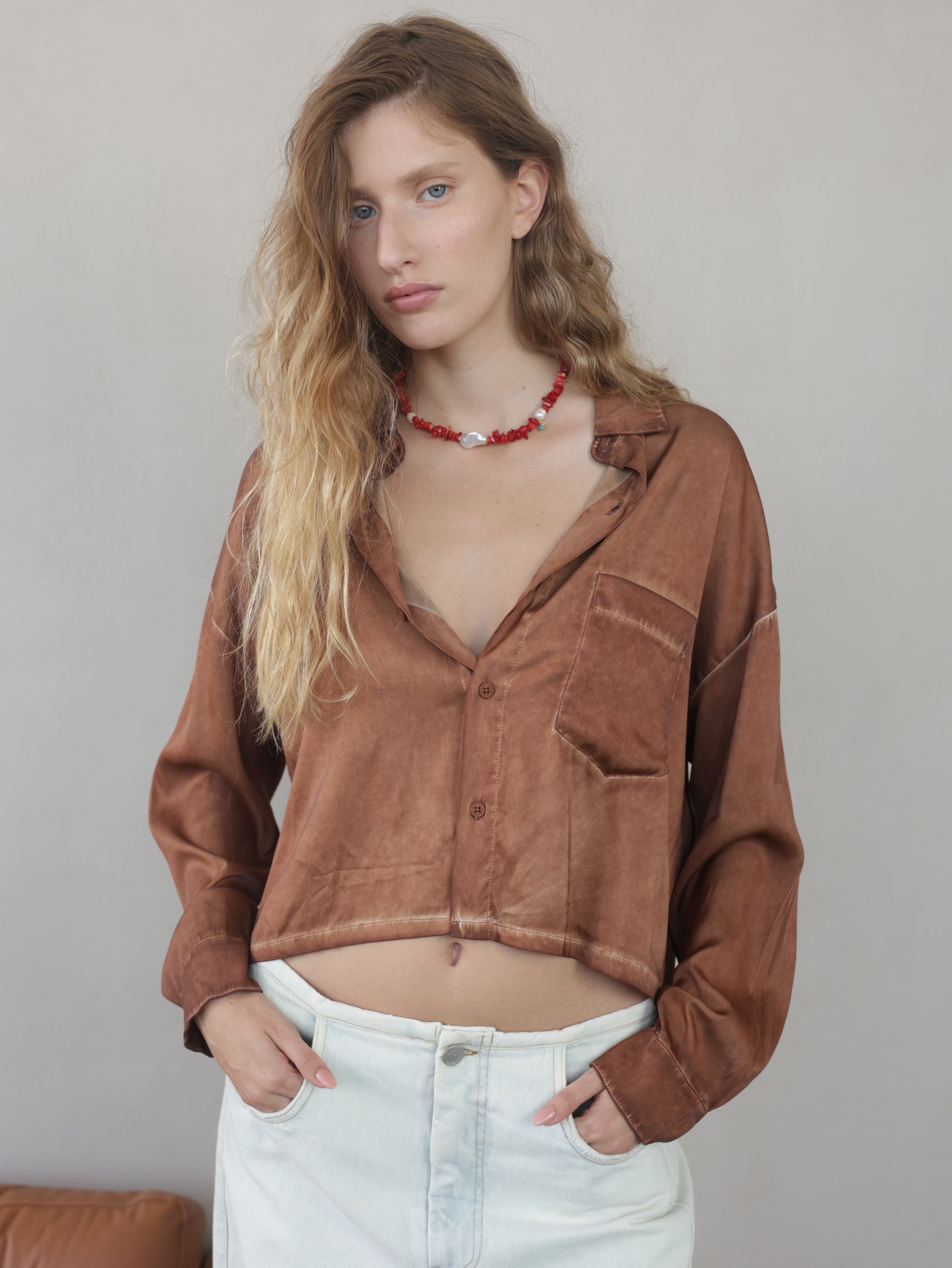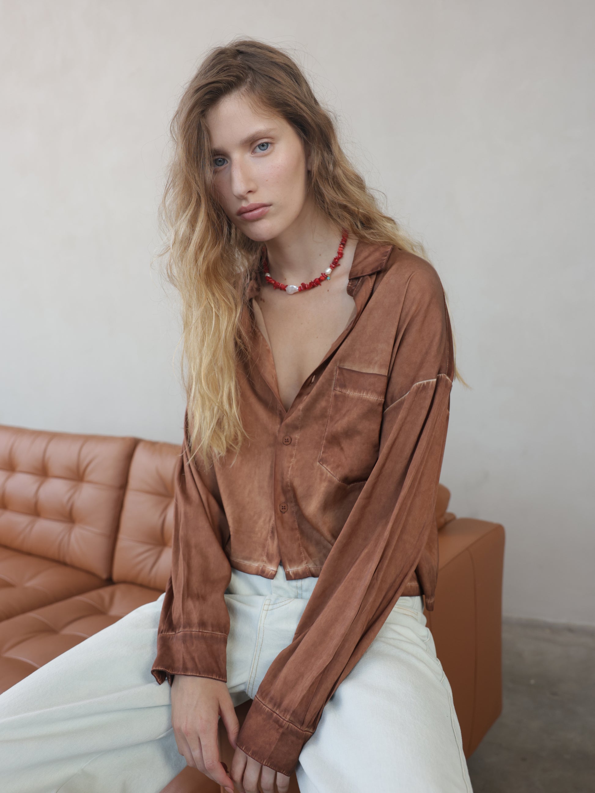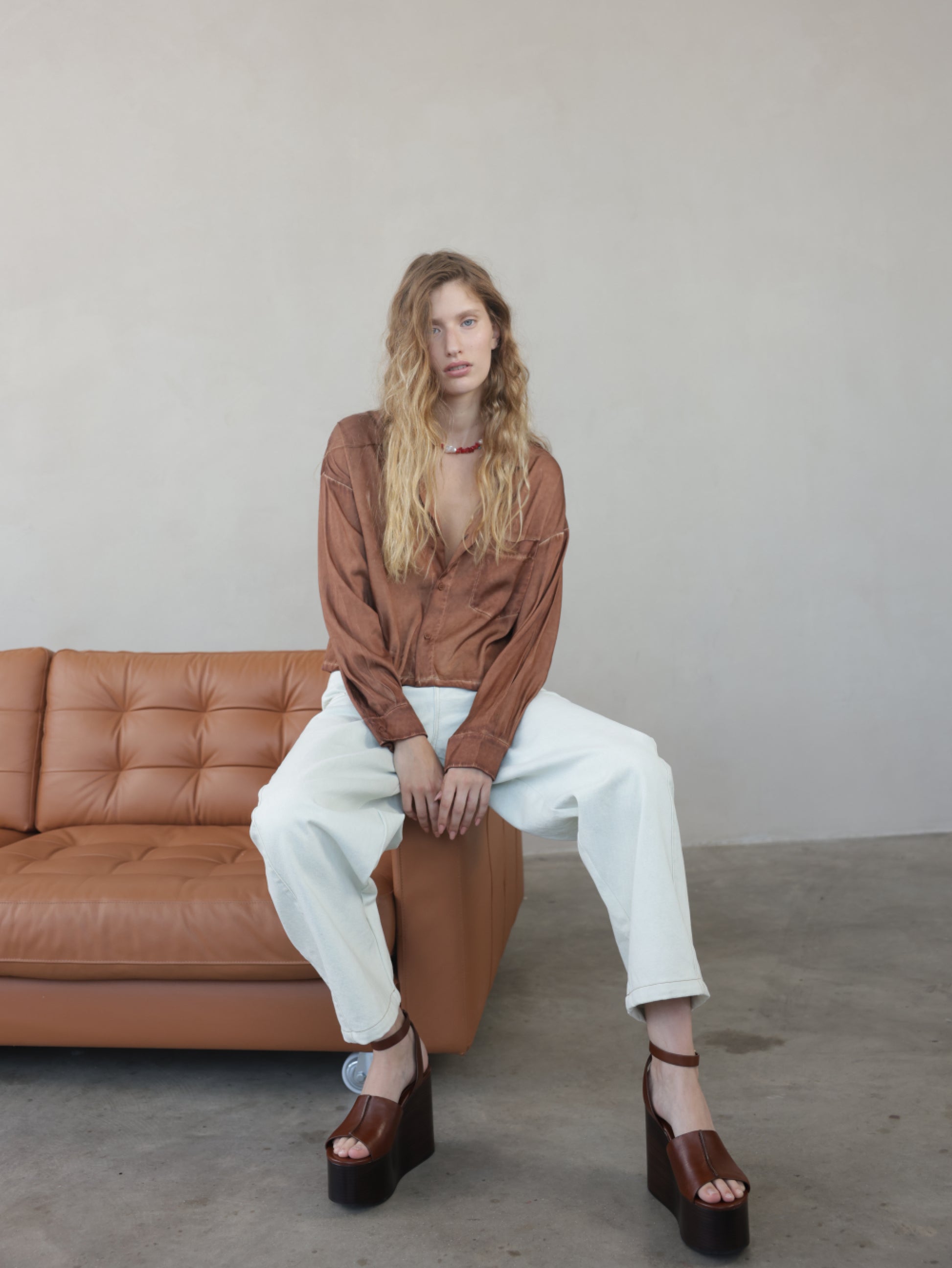 Long sleeve button down shirt with collar and cuffs. Breast pocket. Hemline goes straight across. Available in natural, pink or khaki. Available size:1-3 Pair with our matching tank and pants for a feminine, retro, complete look.