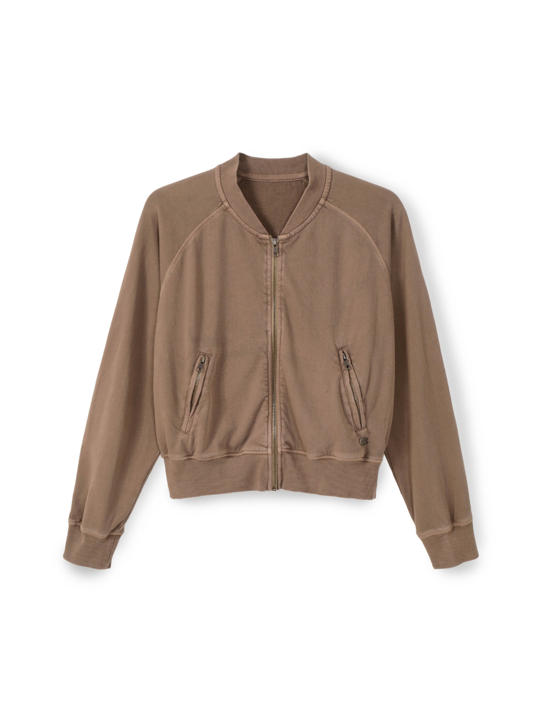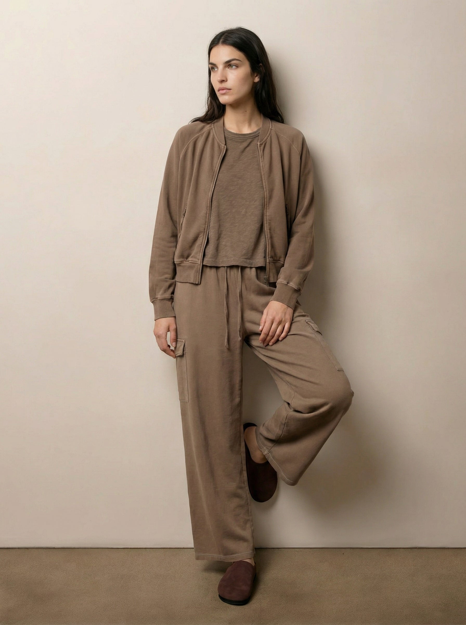 This French terry zip-up jacket combines sporty comfort with a clean, modern silhouette. Crafted from soft, breathable cotton French terry, it features a full front zipper, ribbed collar, cuffs, and hem for a polished finish. The relaxed fit makes it perfect for everyday wear and easy layering. Functional pockets add practicality while keeping the look refined. Available in Full White, Walnut, and Hunter, and designed to pair effortlessly with the matching pants for a coordinated, elevated casual set.
